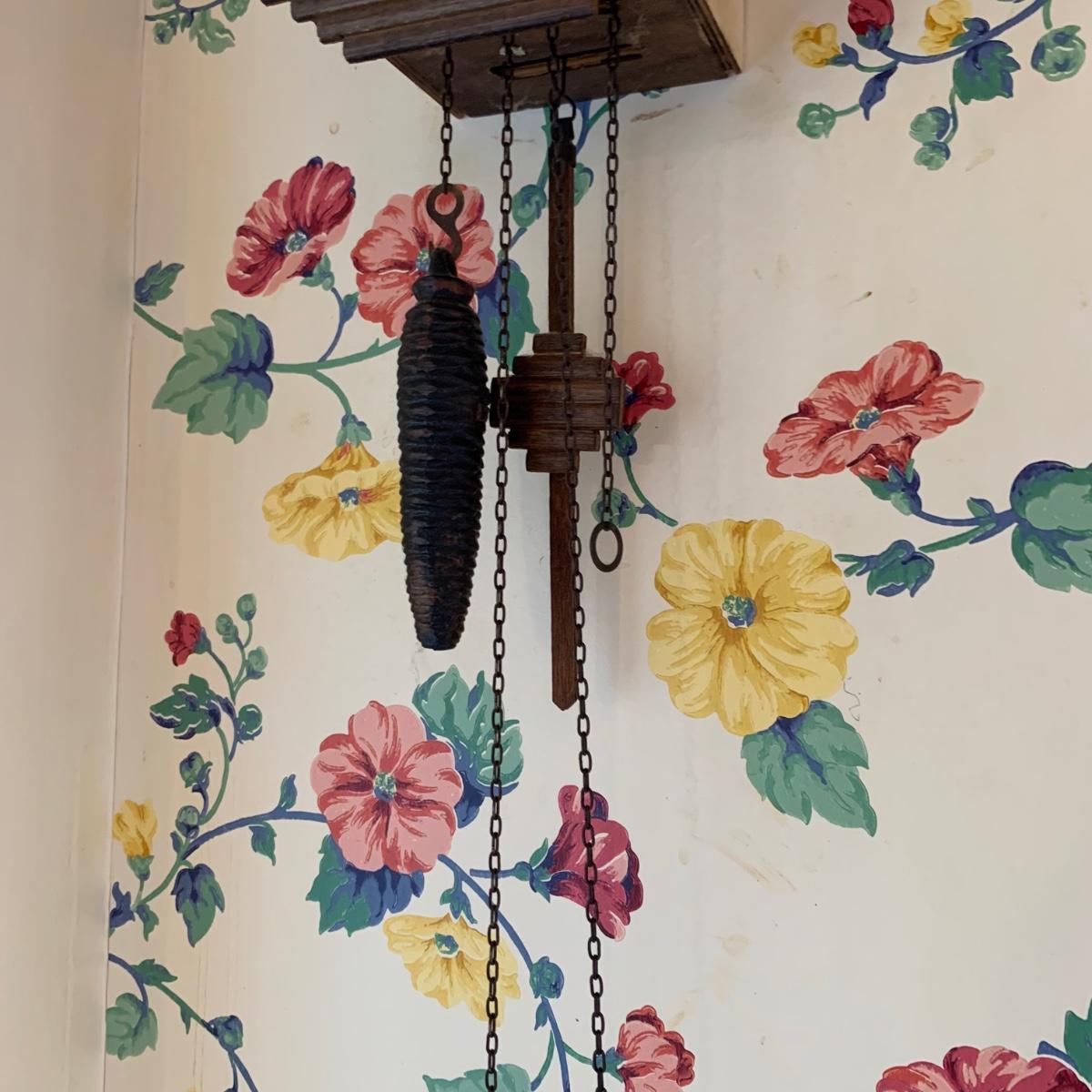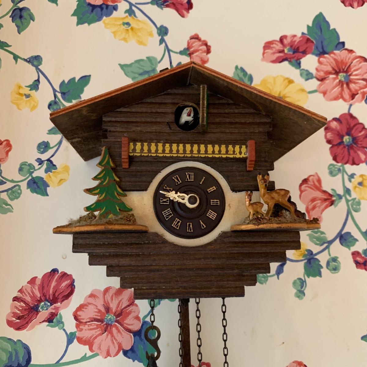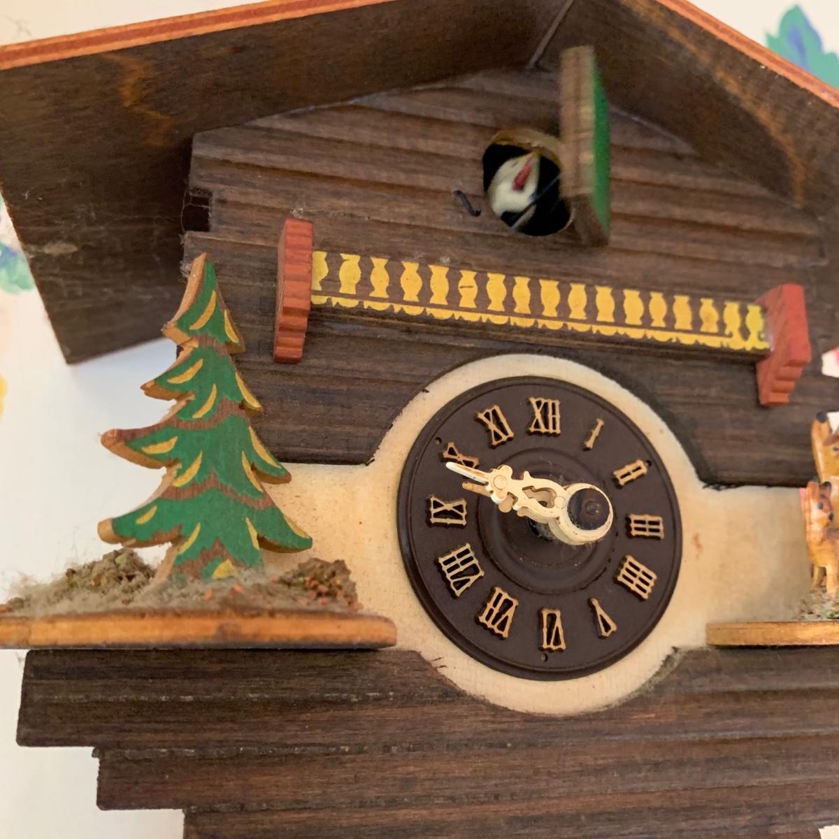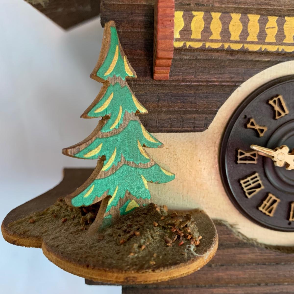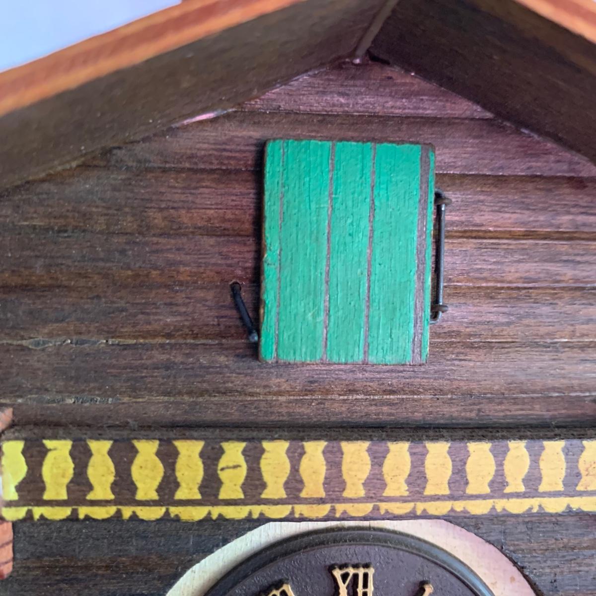 Functioning wooden cuckoo clock from Marie’s Fine Jewelry and Timepieces. Clock has metal chains and weights. Cuckoo clock measures approximately 7.5” x 5” x 6”. It is a bit dusty, but otherwise seems to be in good condition. Clock was not tested for accuracy.
