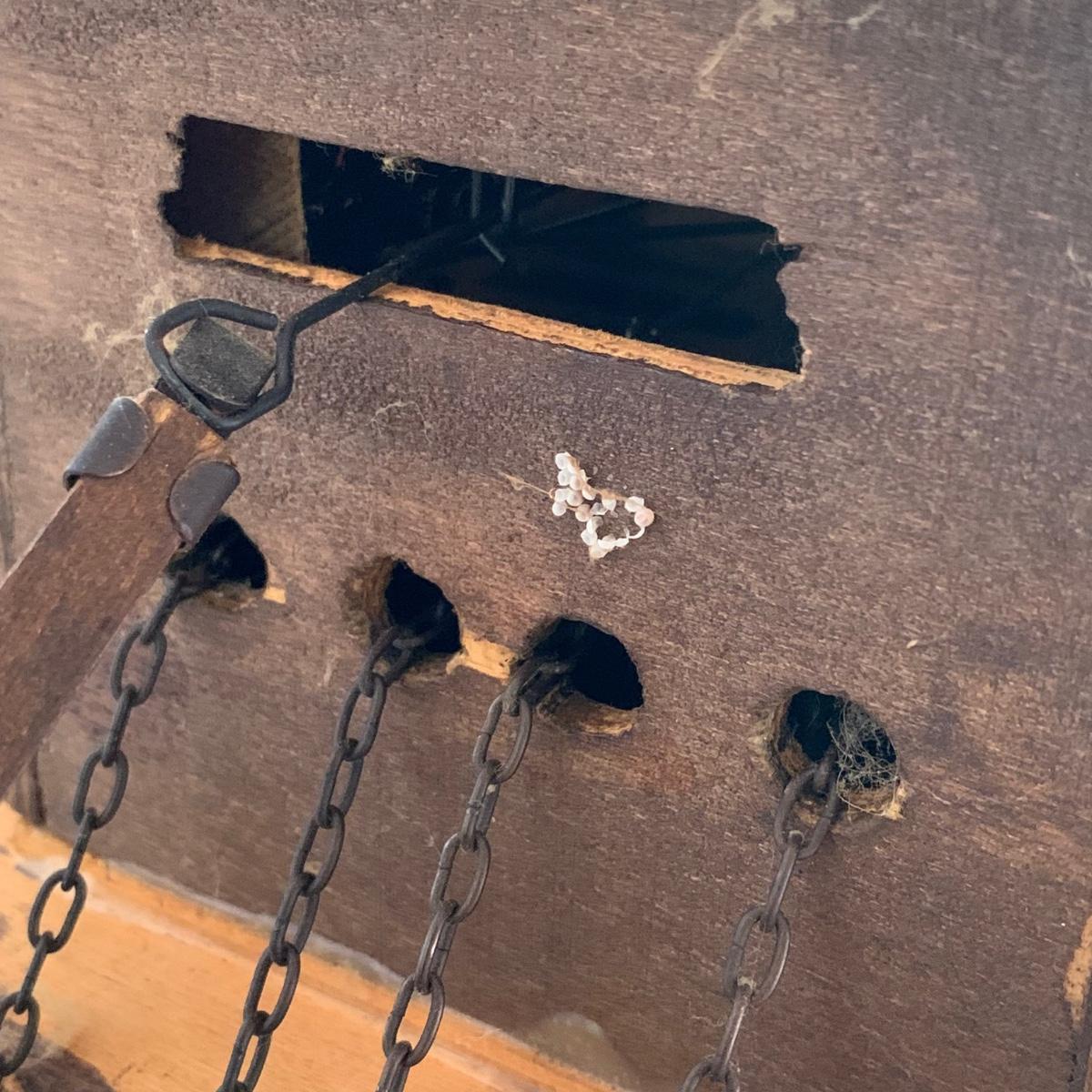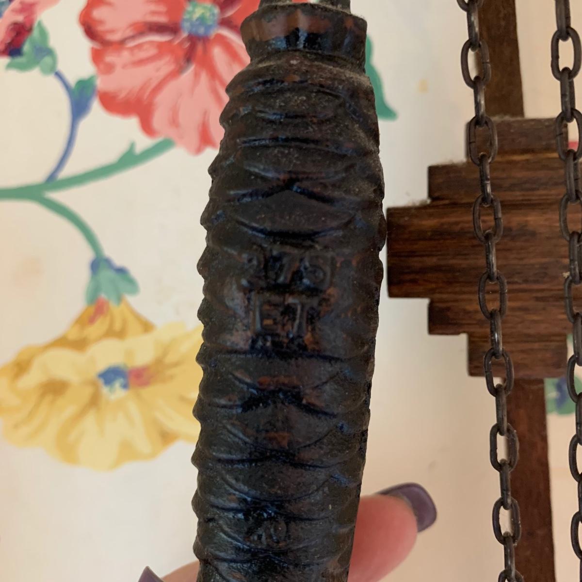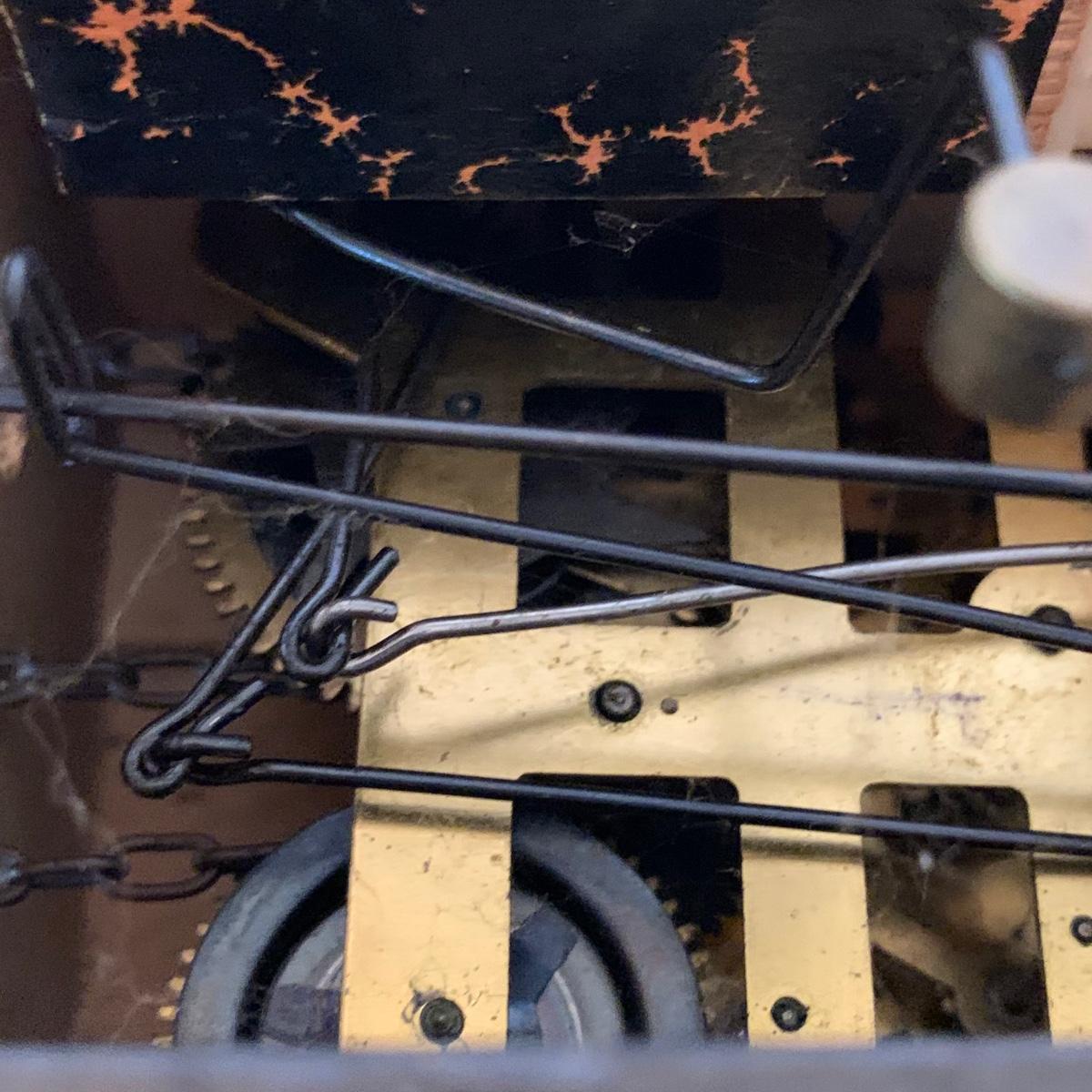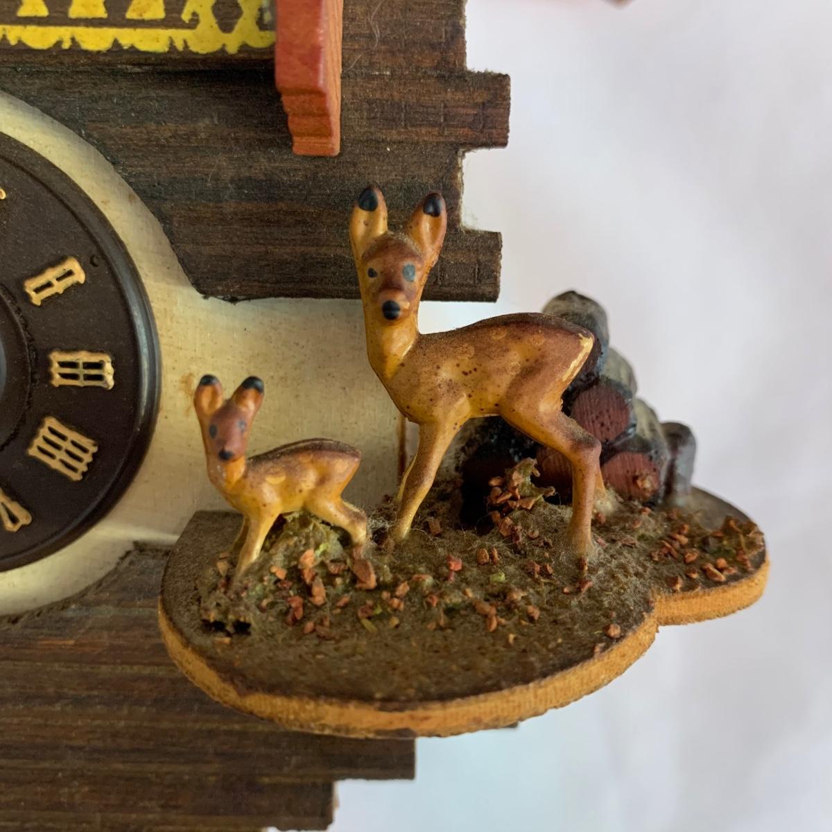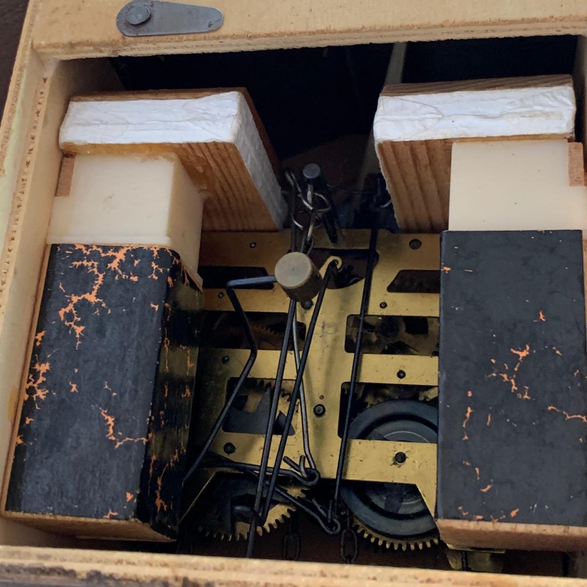 Functioning wooden cuckoo clock from Marie’s Fine Jewelry and Timepieces. Clock has metal chains and weights. Cuckoo clock measures approximately 7.5” x 5” x 6”. It is a bit dusty, but otherwise seems to be in good condition. Clock was not tested for accuracy.