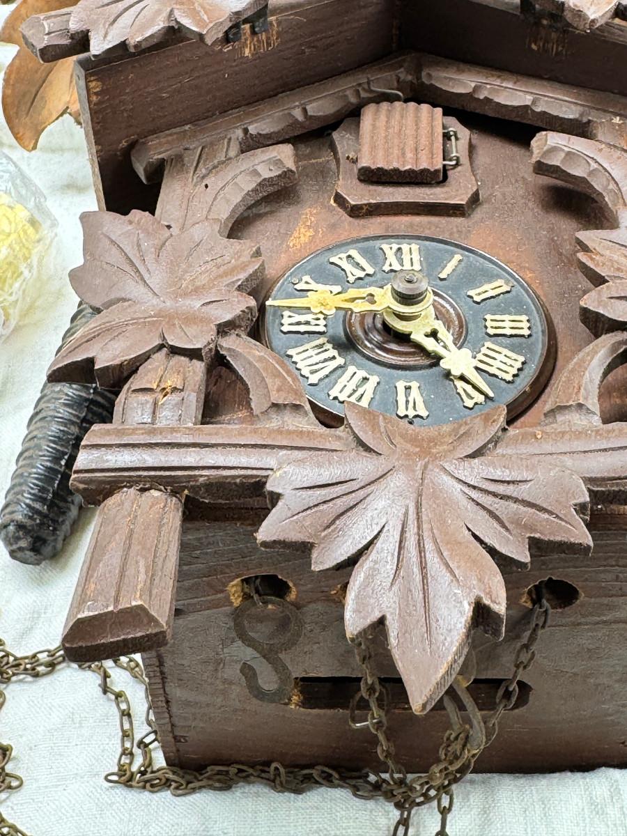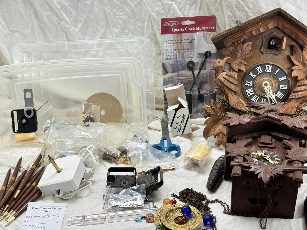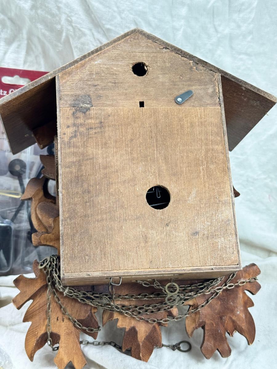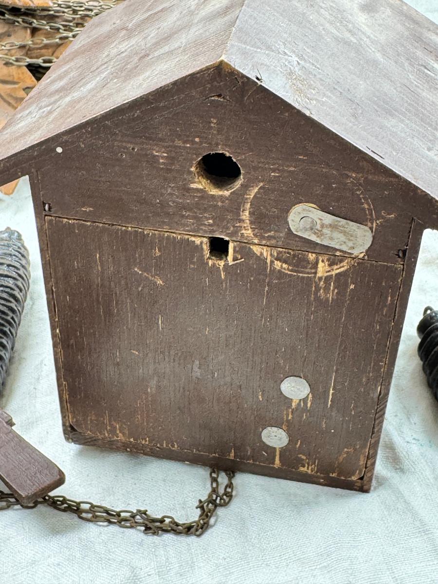 Mixed lot of clock parts for creation or repair. Cuckoo clock not complete, not working.