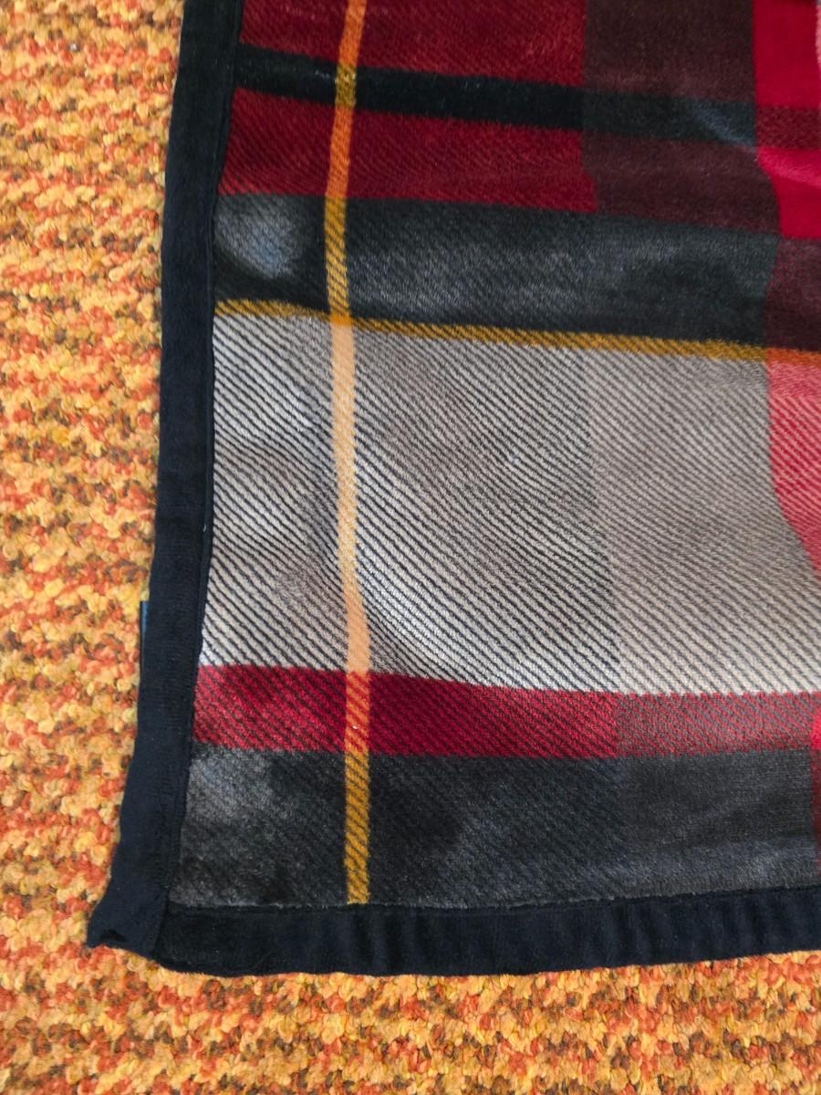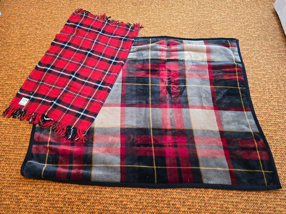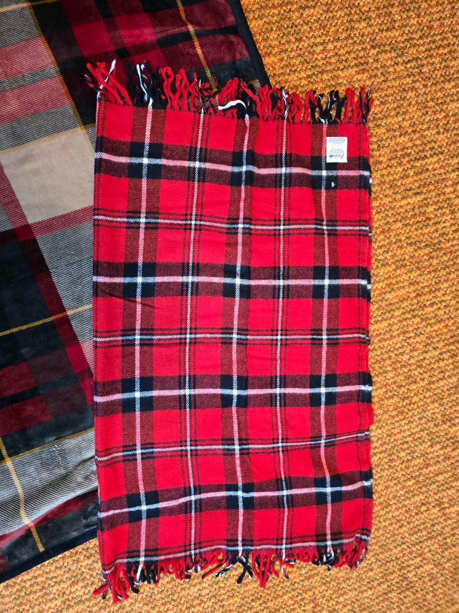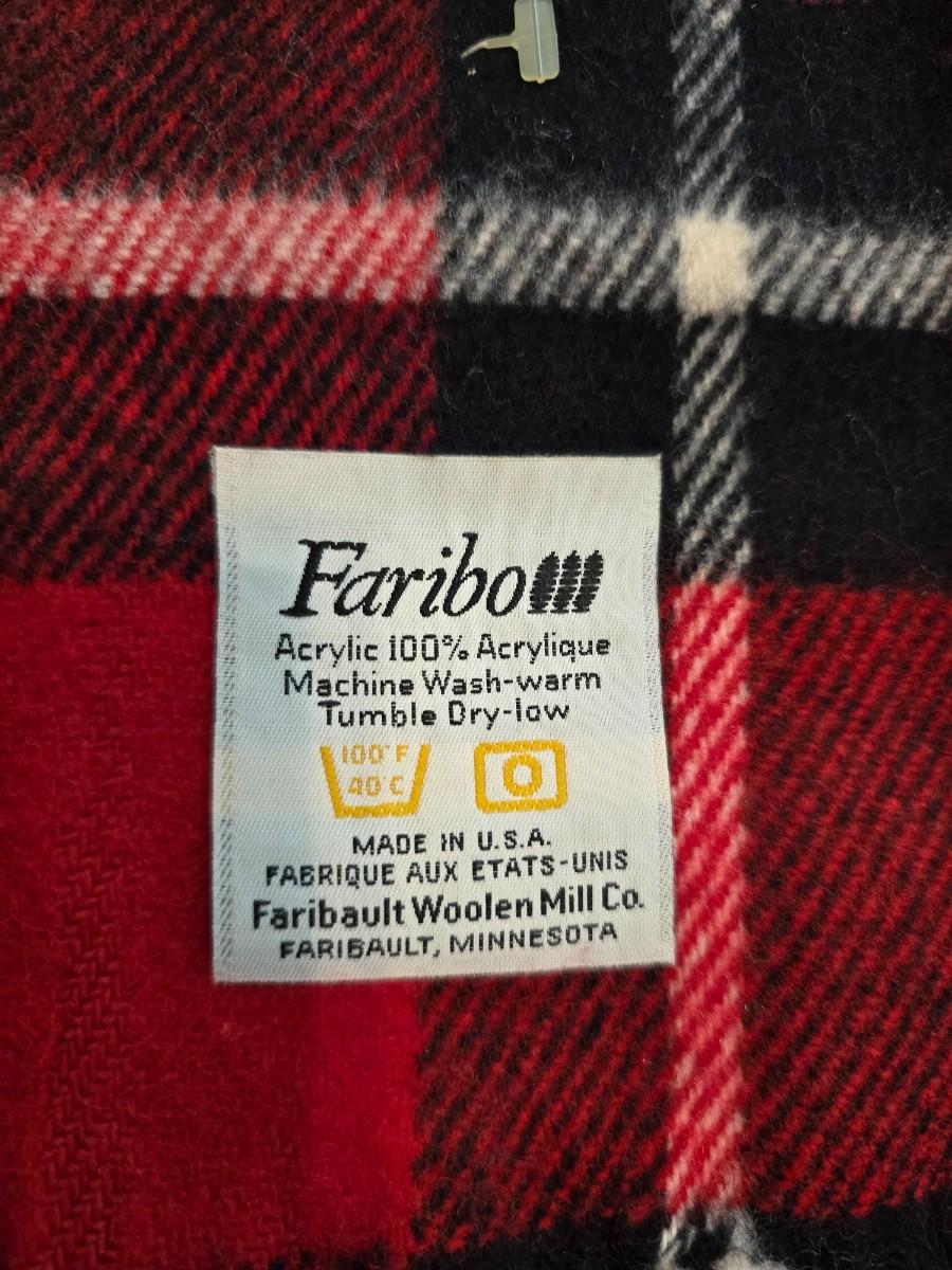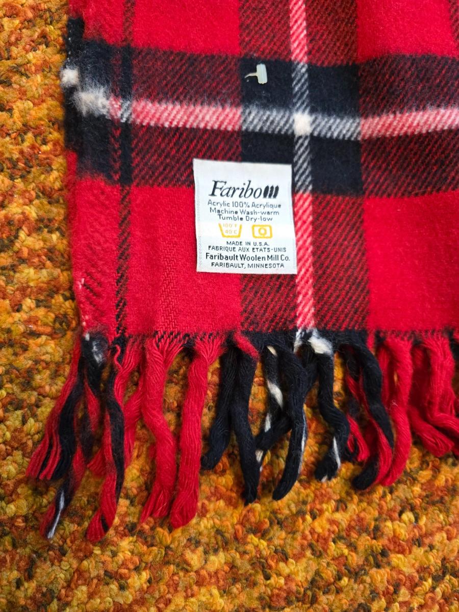 Cuddl Duds® Red Plaid blanket with a vintage Faribo red, black, and white plaid acrylic throw blanket with fringe, made by the Faribault Woolen Mill Co.