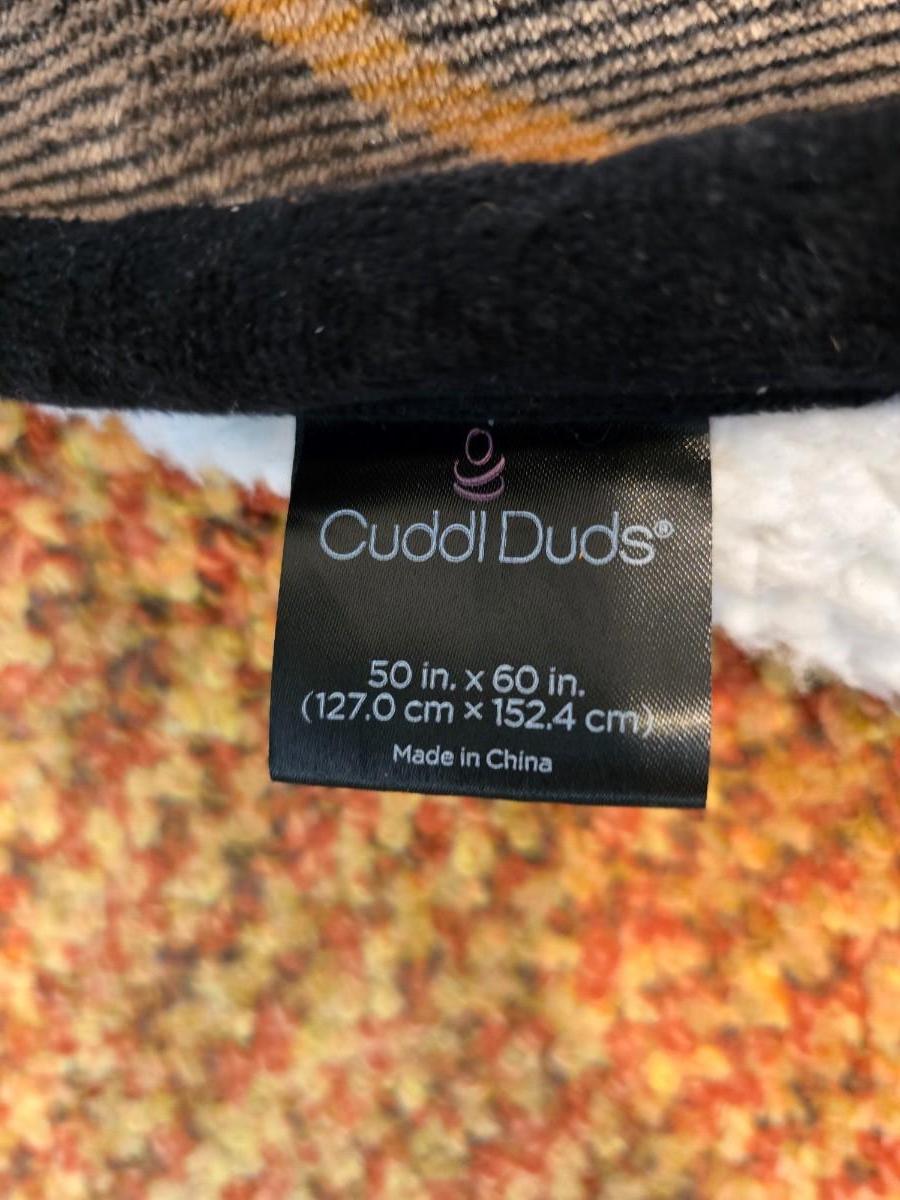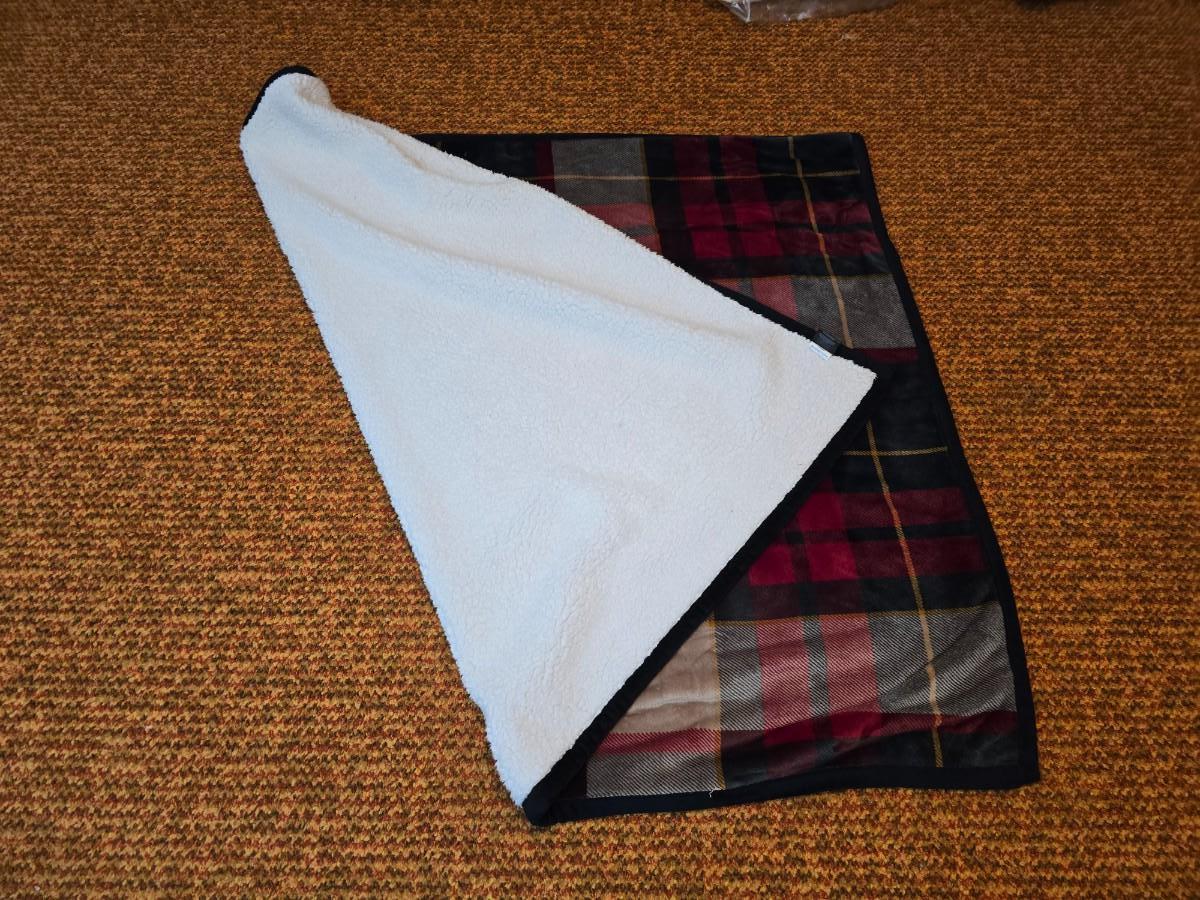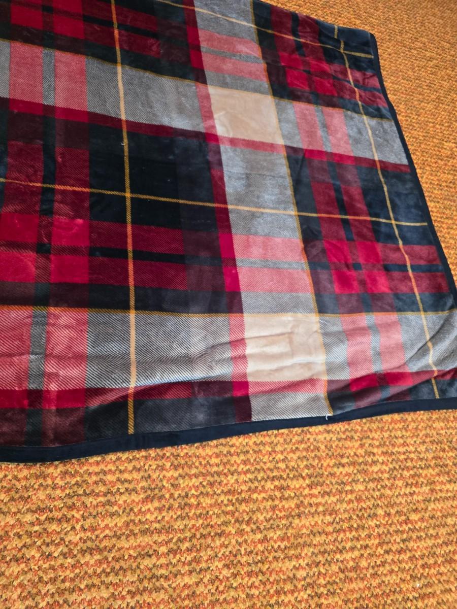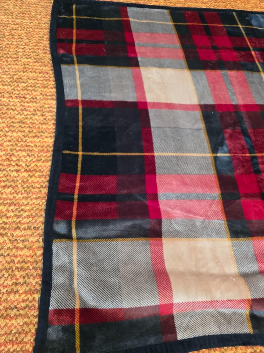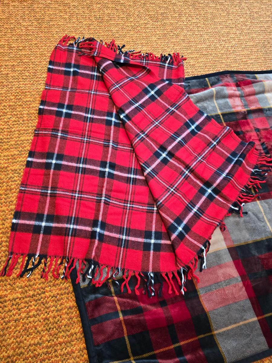 Cuddl Duds® Red Plaid blanket with a vintage Faribo red, black, and white plaid acrylic throw blanket with fringe, made by the Faribault Woolen Mill Co.