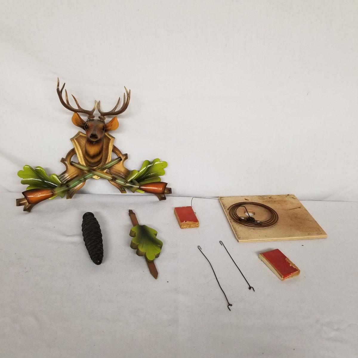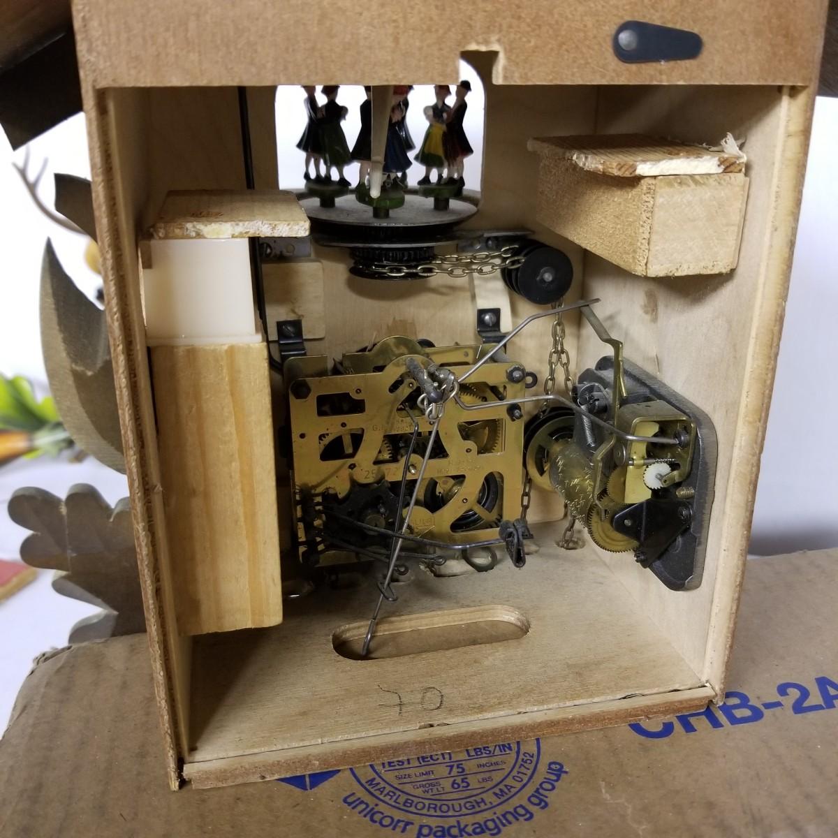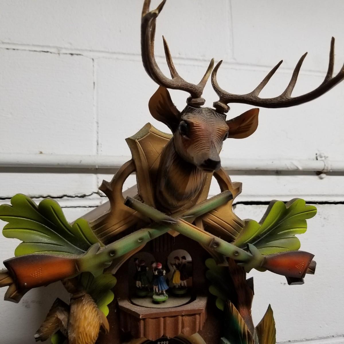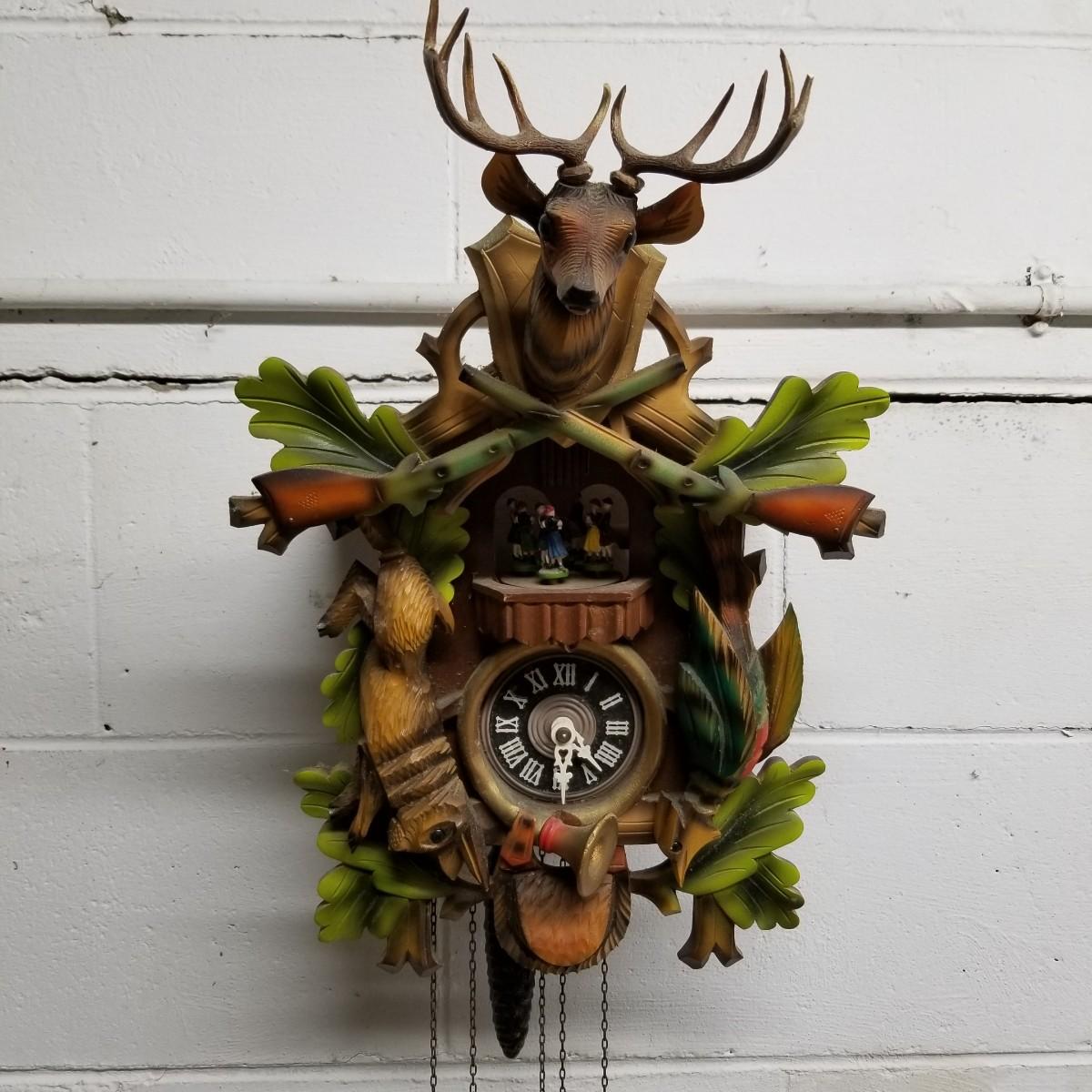 Old world forest style cuckoo clock with acorn pendant weights,  chain drive and twirling dancers. Clock plays Edelweiss and Lara's theme from Dr. Zhivago,  according to the label. Clock not tested and currently not working.  Stag top piece removable.  12"x18"x12", not including length of chains and weights. Will need some expertise to renovate. See photos for detail.  Shipping available.