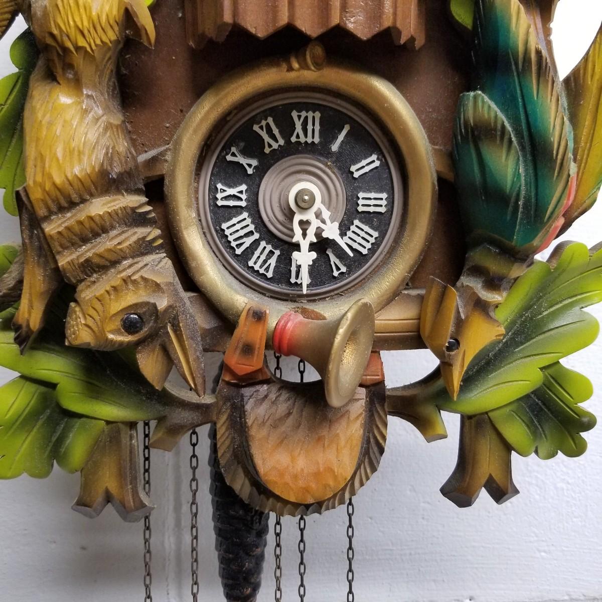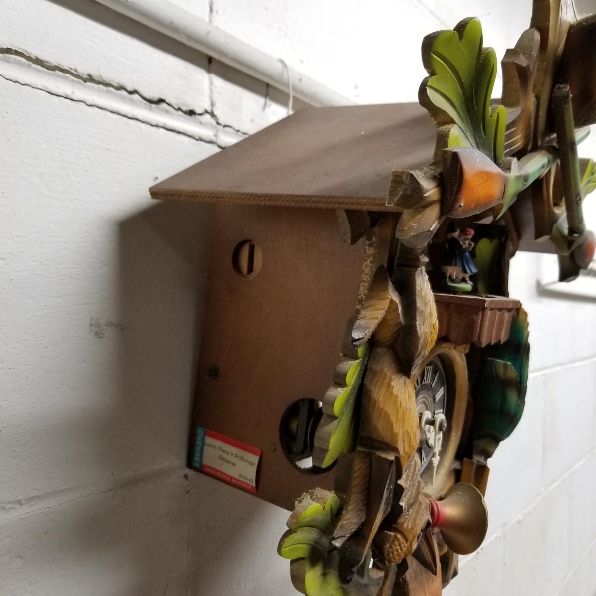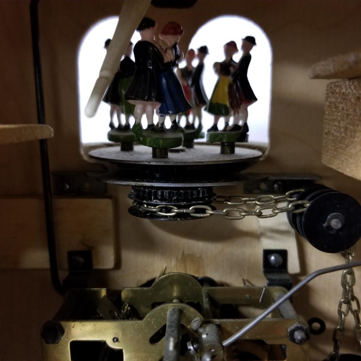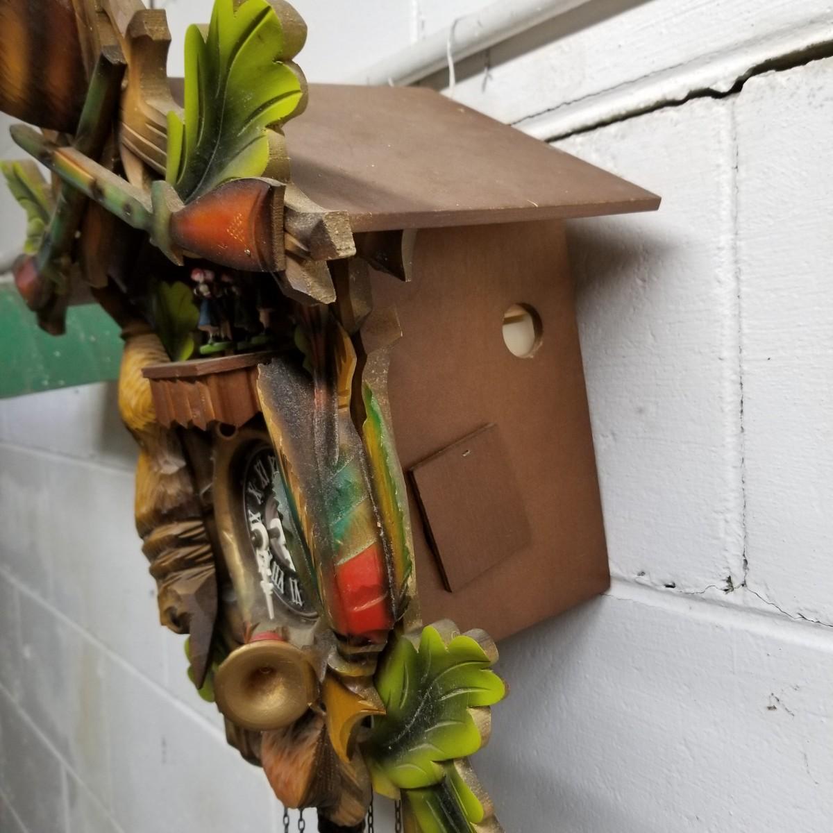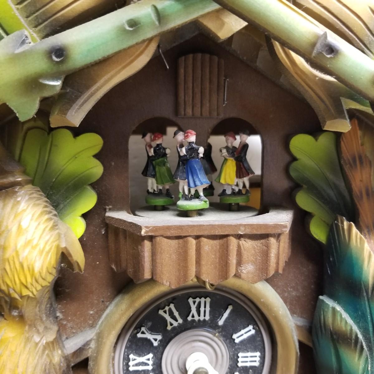 Old world forest style cuckoo clock with acorn pendant weights,  chain drive and twirling dancers. Clock plays Edelweiss and Lara's theme from Dr. Zhivago,  according to the label. Clock not tested and currently not working.  Stag top piece removable.  12"x18"x12", not including length of chains and weights. Will need some expertise to renovate. See photos for detail.  Shipping available.
