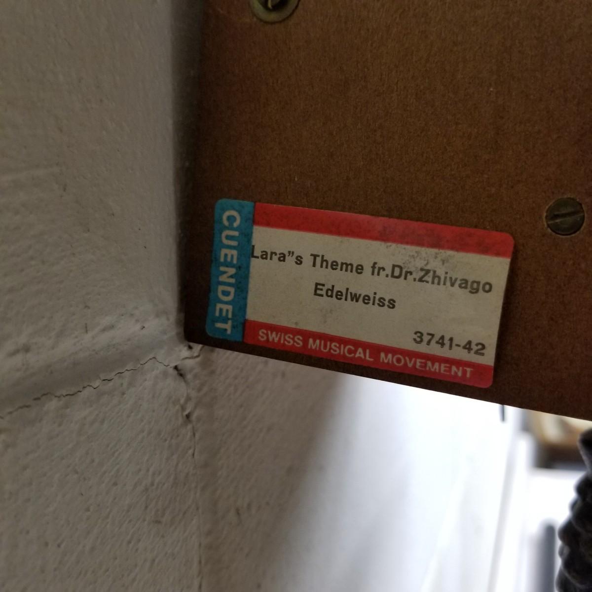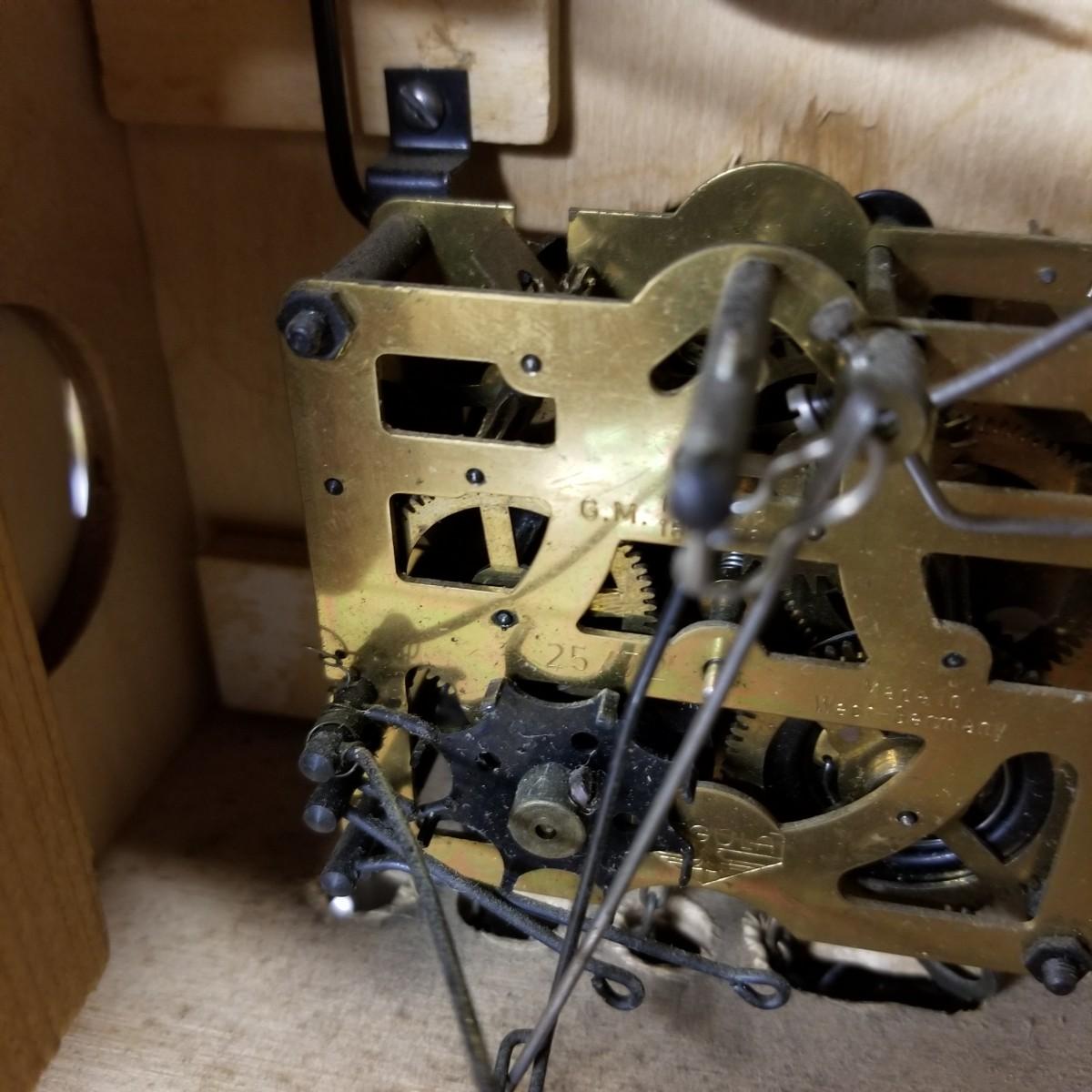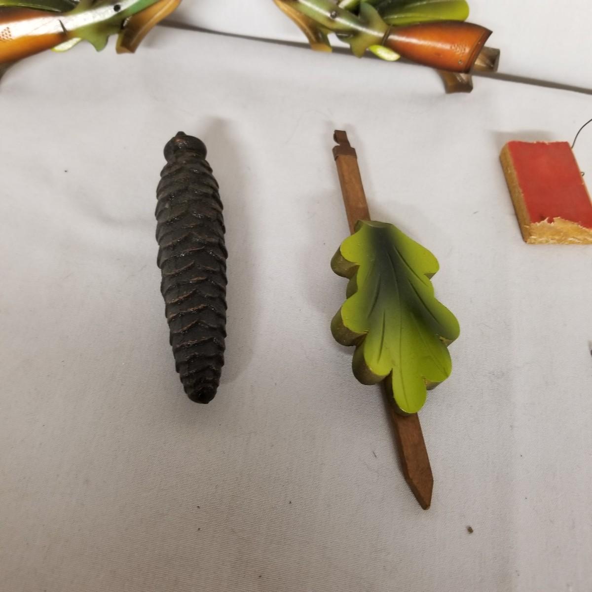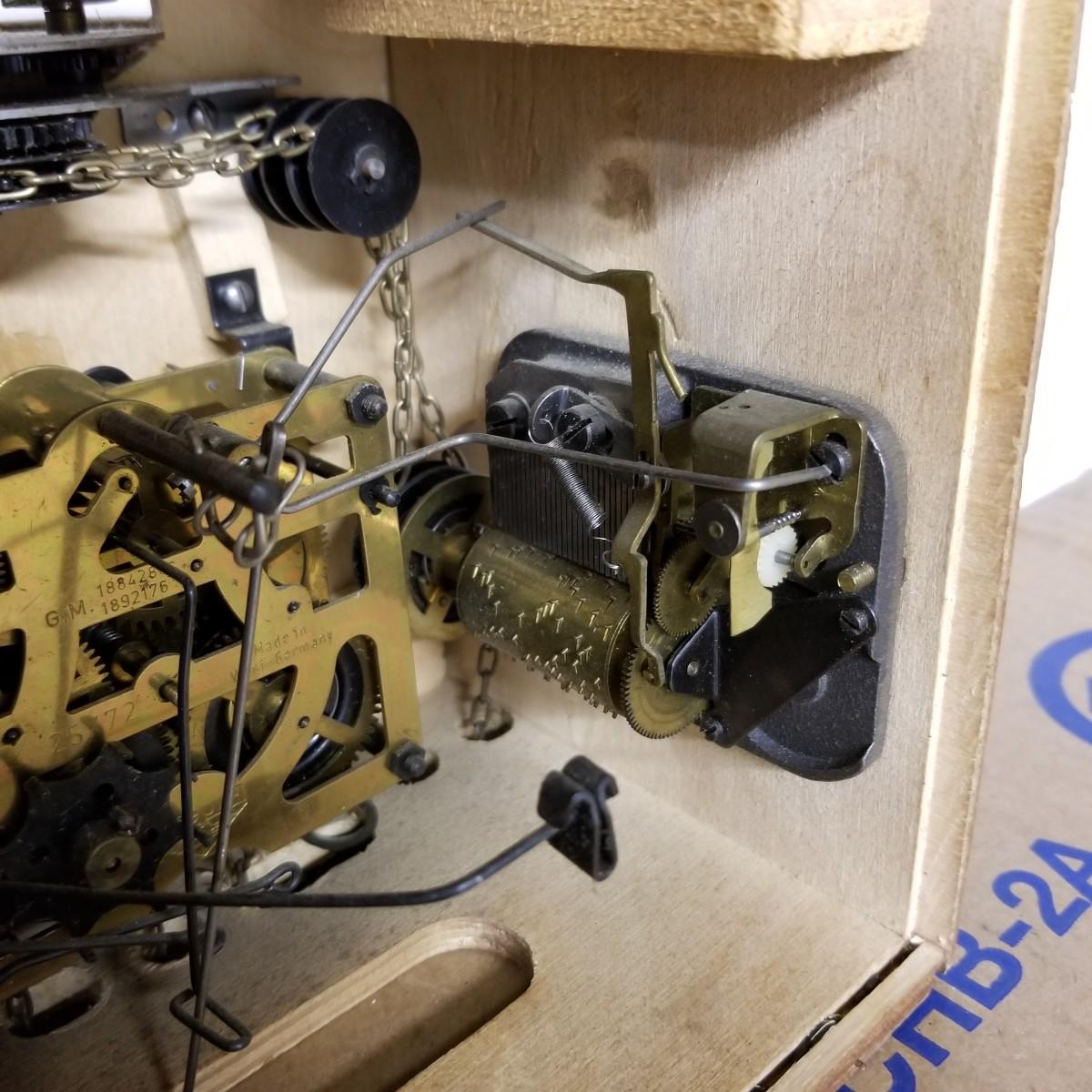 Old world forest style cuckoo clock with acorn pendant weights,  chain drive and twirling dancers. Clock plays Edelweiss and Lara's theme from Dr. Zhivago,  according to the label. Clock not tested and currently not working.  Stag top piece removable.  12"x18"x12", not including length of chains and weights. Will need some expertise to renovate. See photos for detail.  Shipping available.