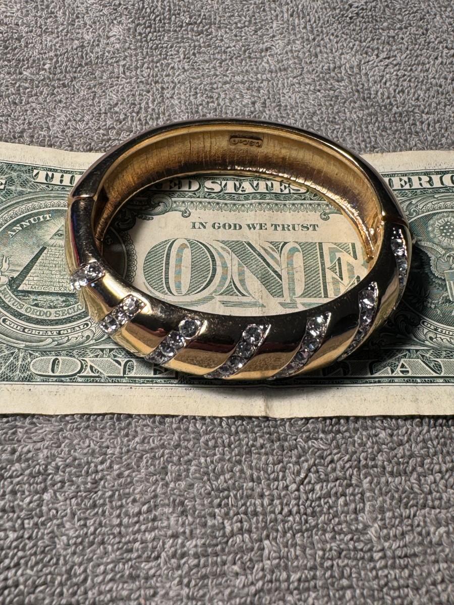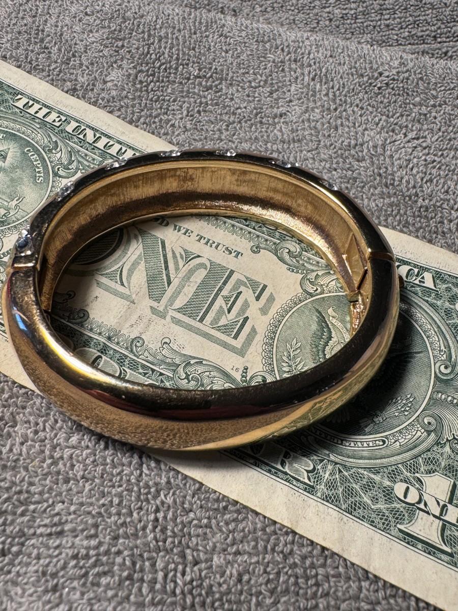 The image shows a vintage or antique-style gold-toned cuff bracelet, possibly featuring stones or inlays on its surface.