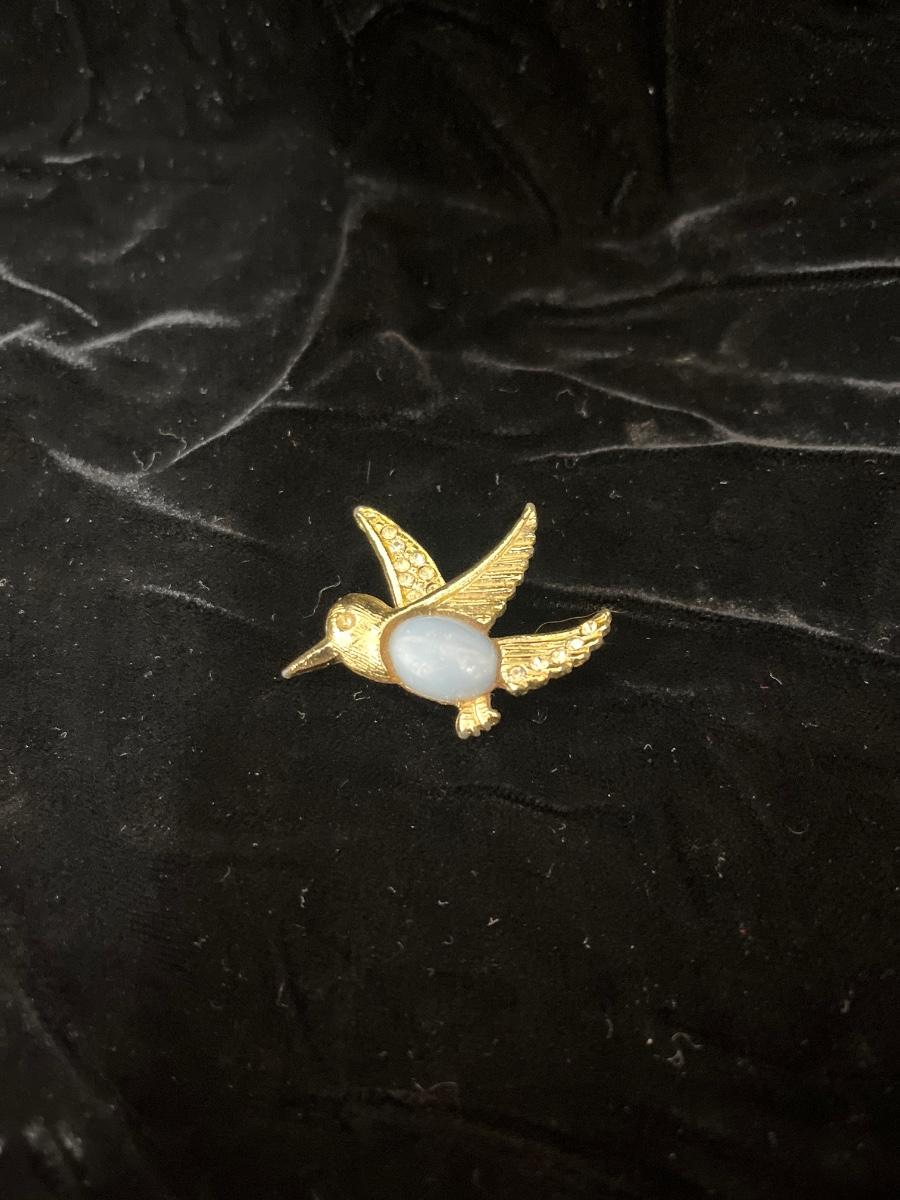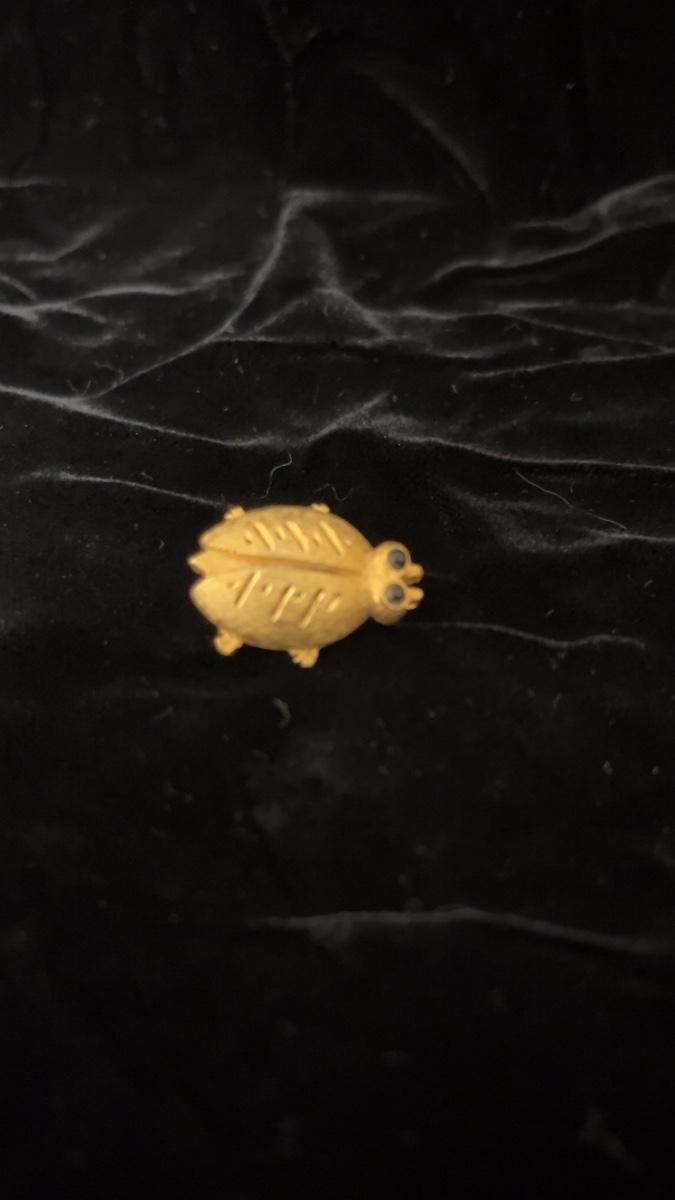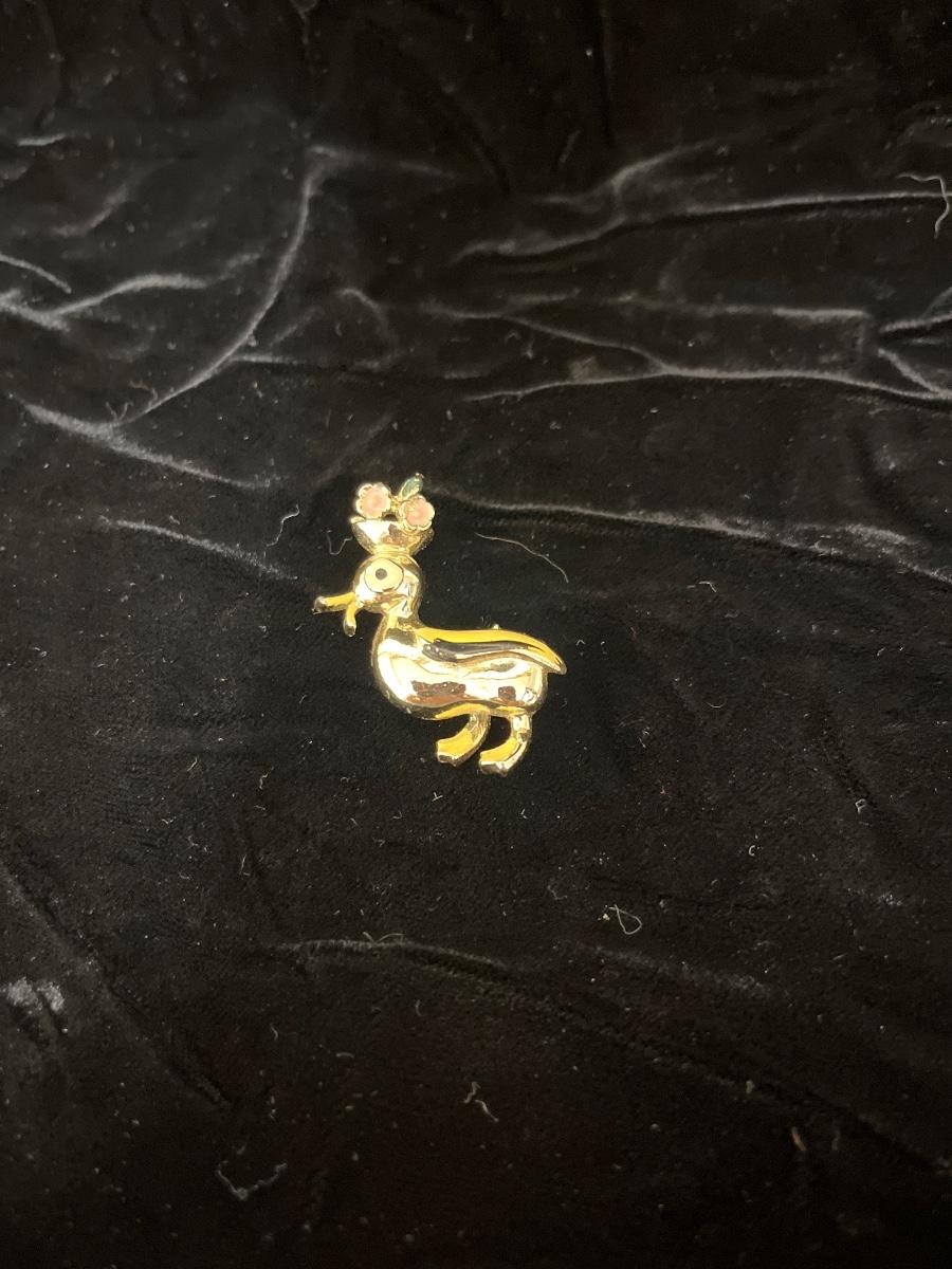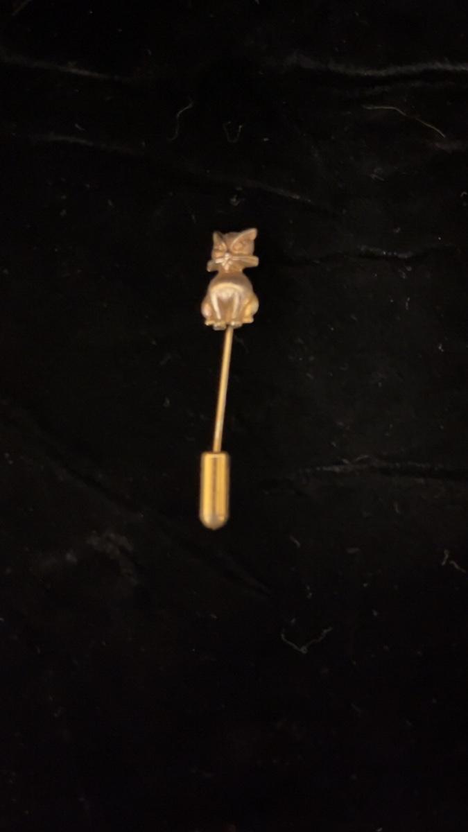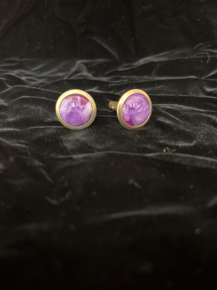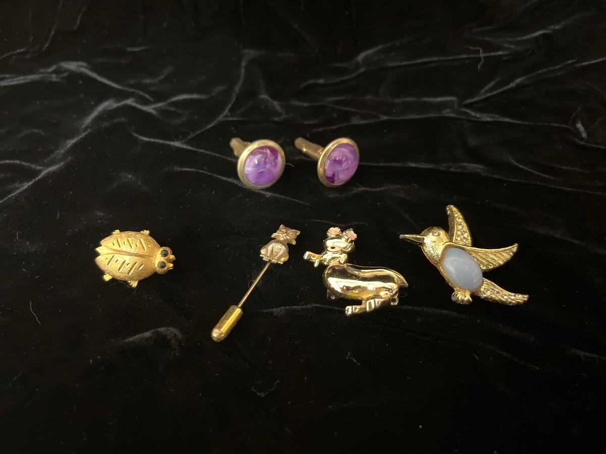 Vintage purple cuff links along with bug, cat, duck and hummingbird pins