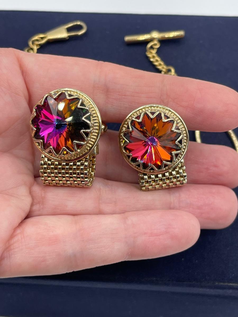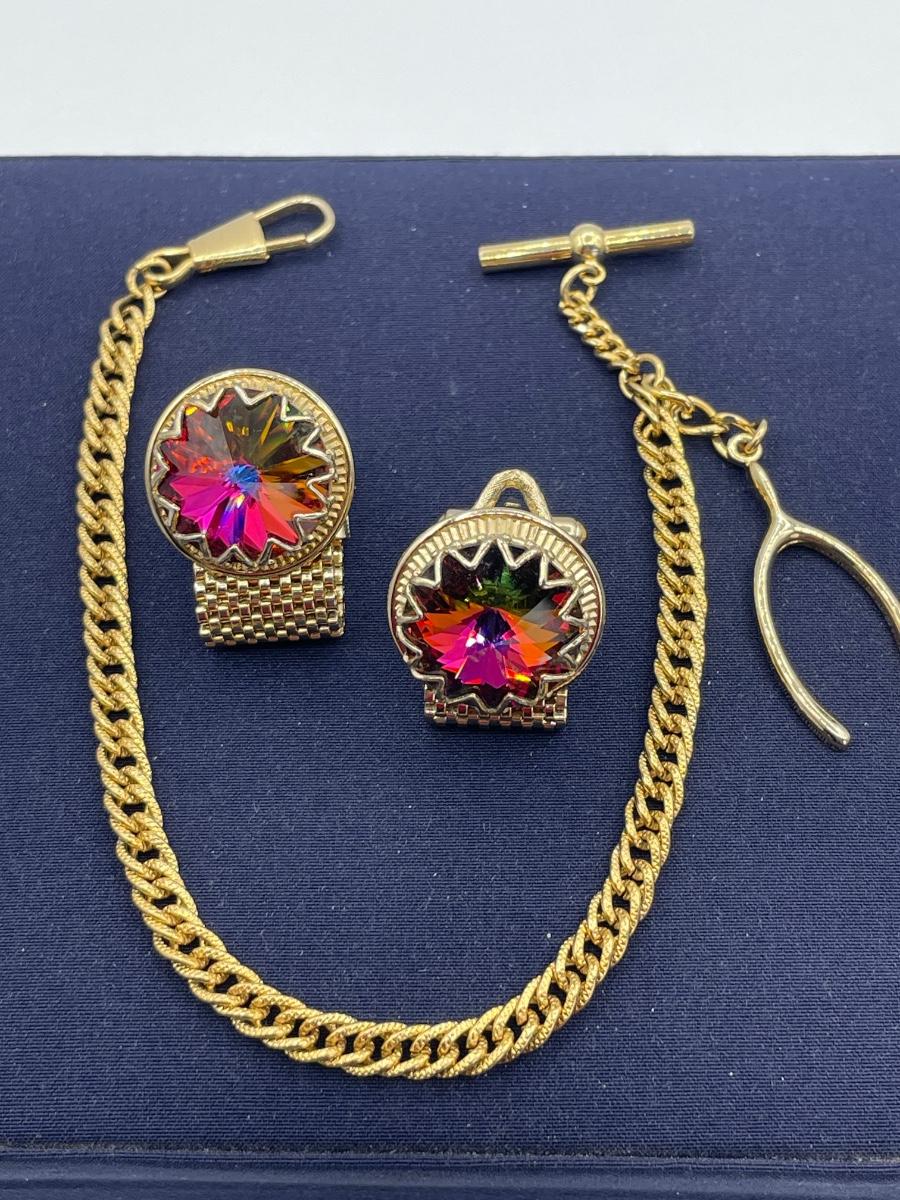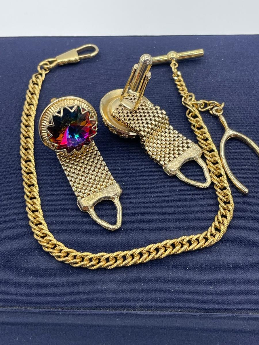 Rivoli stone cuff links and 1 inch watch chain with horseshoe. Gold tone metal