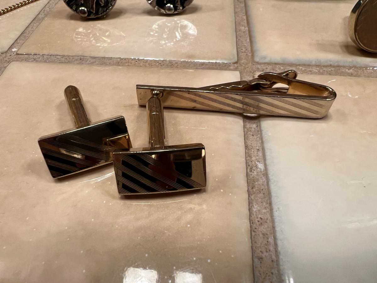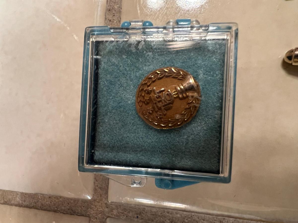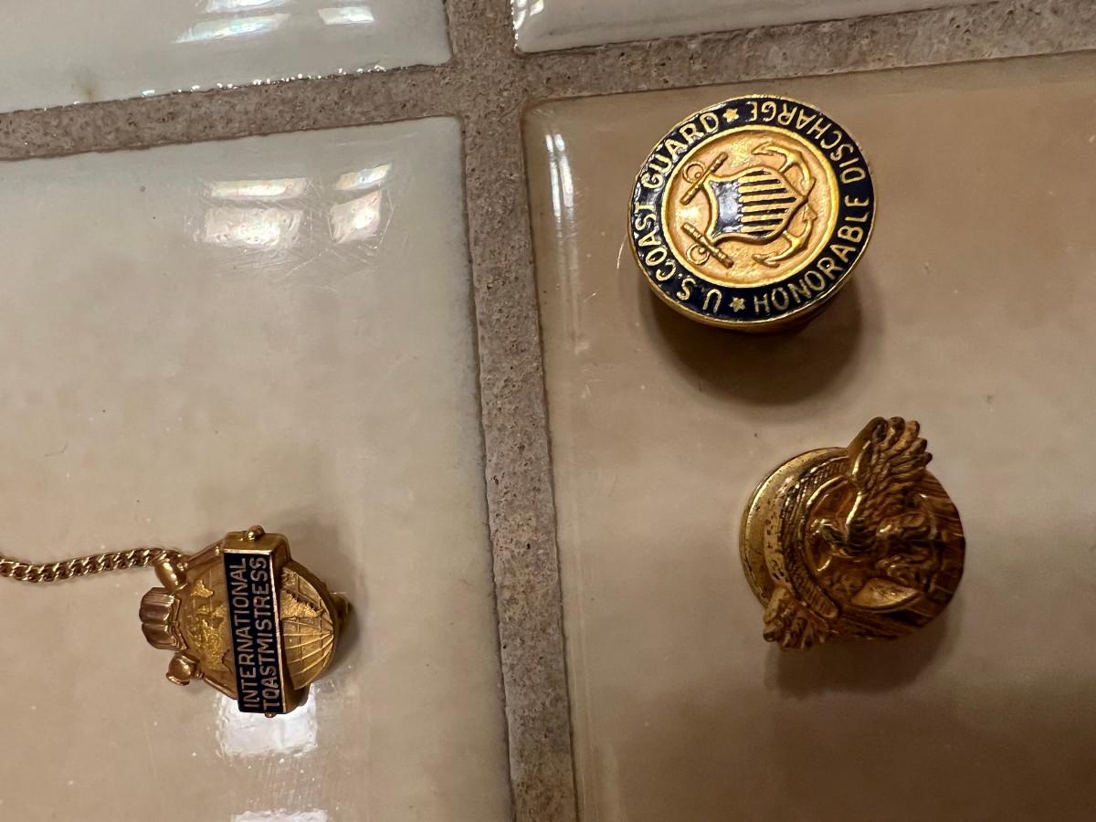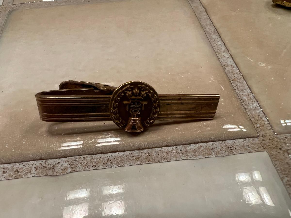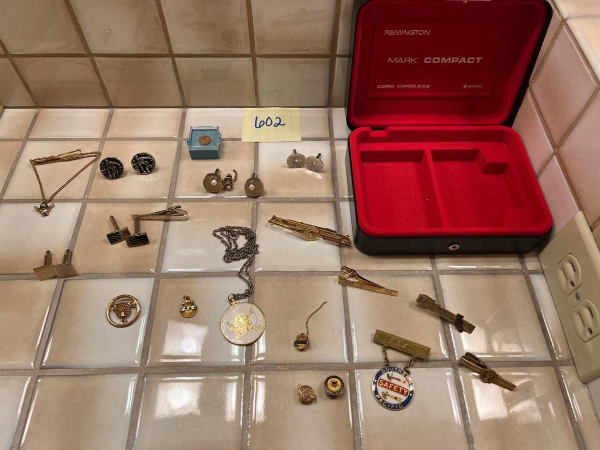 Items are mostly gold filled, coast guard military, Pacbell pin GF, bowling 2 cufflinks, non-matching bowling tie clip, International toast mistress, President's Award, Southern Safety Pacific, and more. All in a Remington box. See pics for more information.