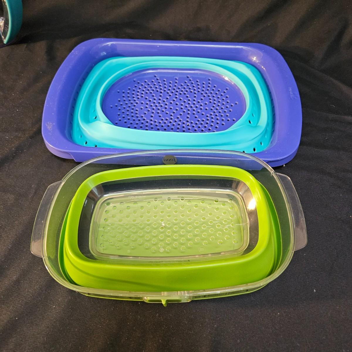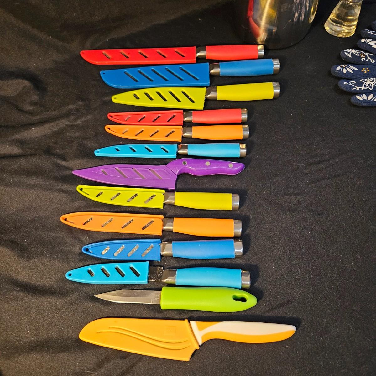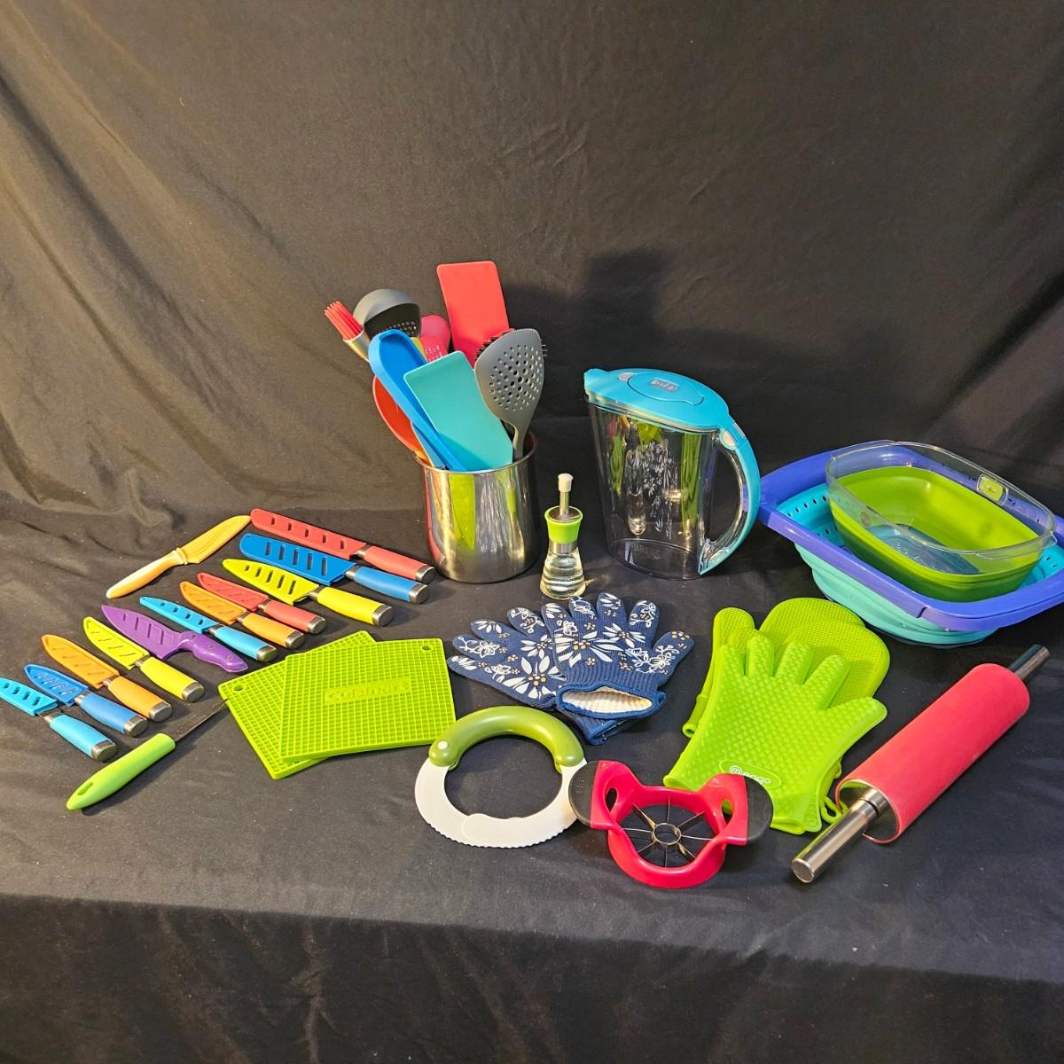 A large assortment of kitchen accessories that includes a collection of Tomodachi knives, Cuisinart accessories, collapsable strainers, utensils, oven mitts and more. See attached pictures for a full inventory. Shipping available