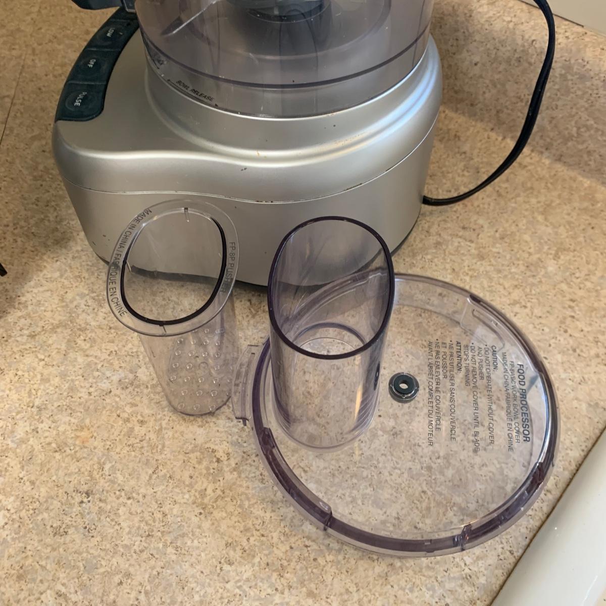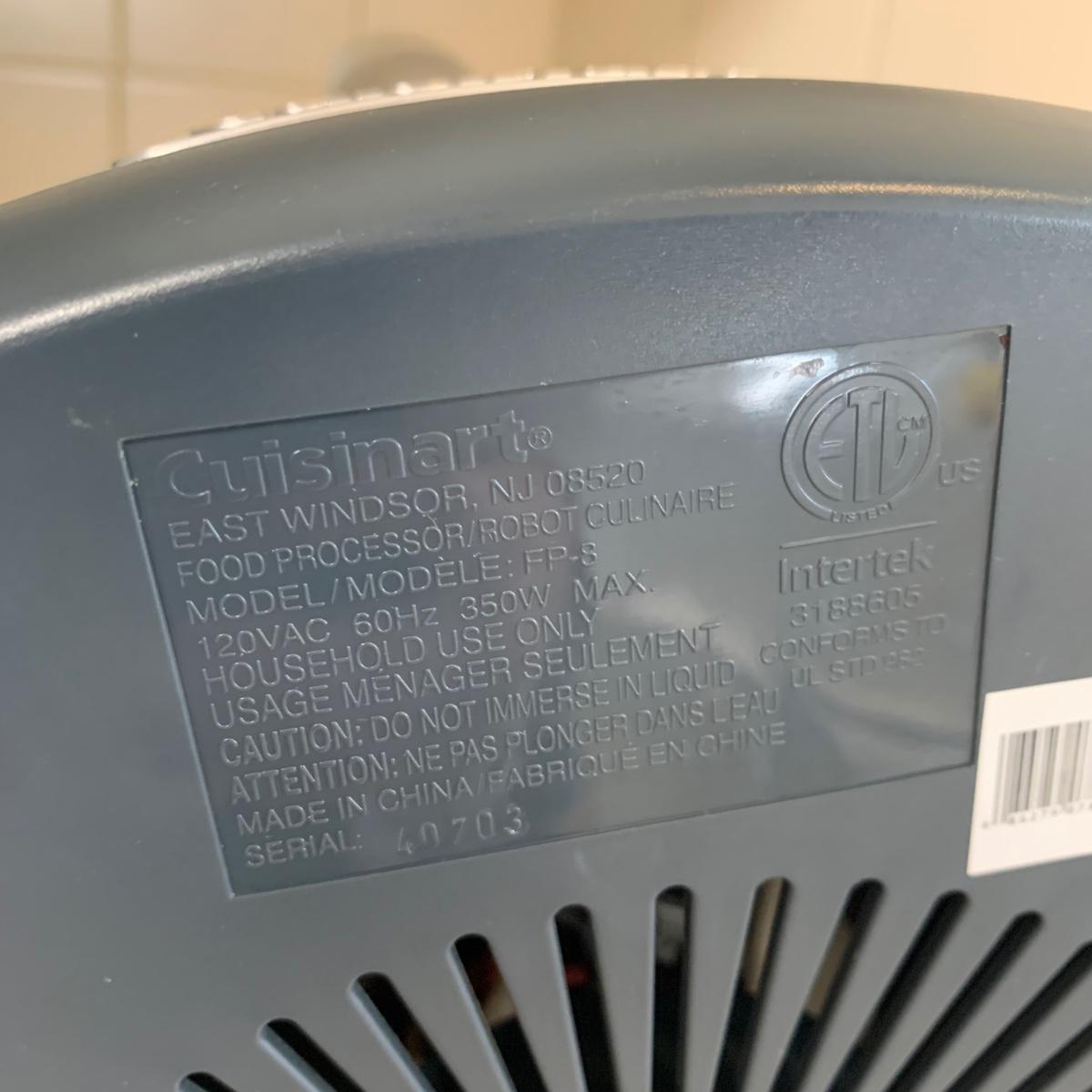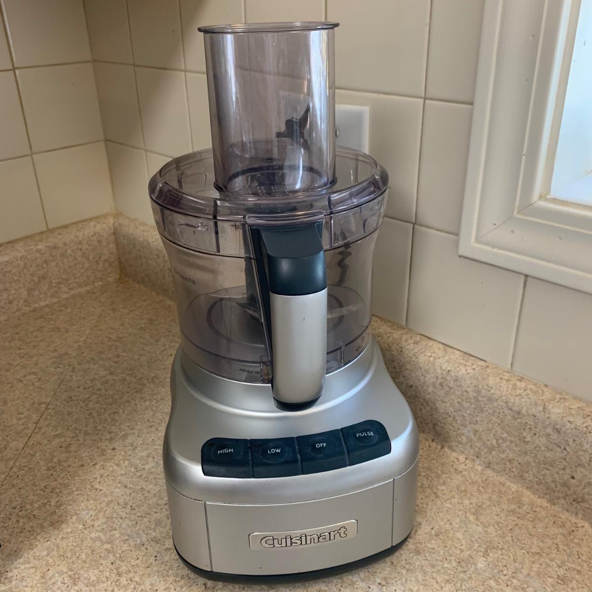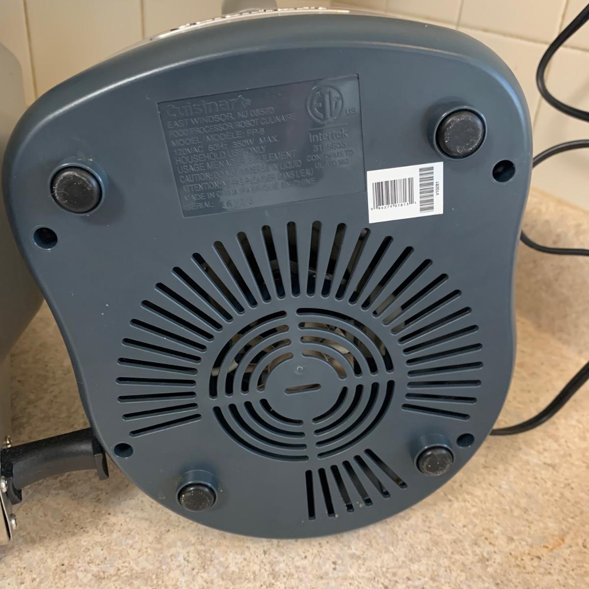 The Cuisinart food processor is model FP-8. It has two speeds and a pulse setting and comes with three blades. It functioned when tested and is in very good condition.