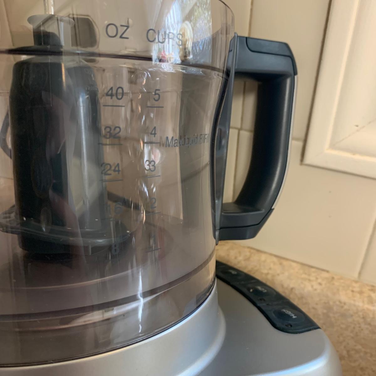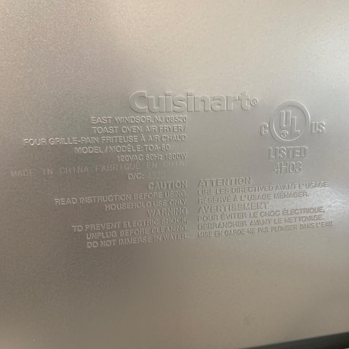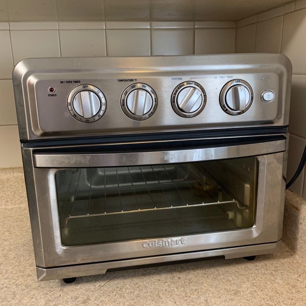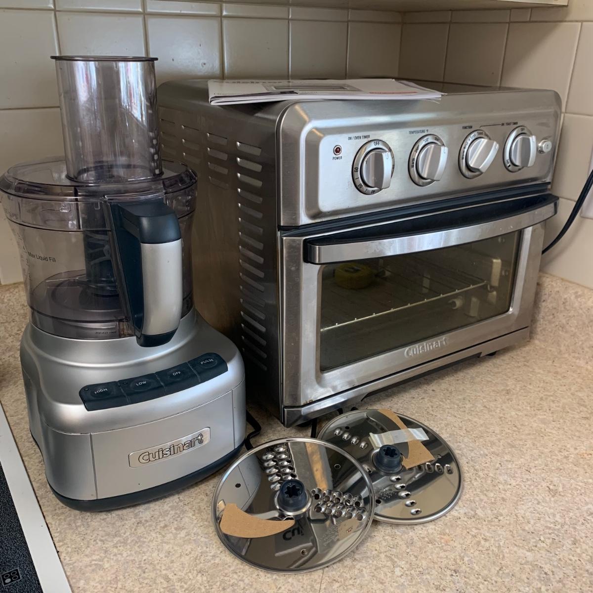 Two Cuisinart brand kitchen appliances: an AirFryer Toaster Oven and a Food Processor. The AirFryer toaster oven is model TOA-60. It turned on when tested and is in very good condition, but could use a good wipe down on the inside. It comes with an instruction and recipe booklet. The AirFryer toaster oven measures 16” x 12” x 14”.