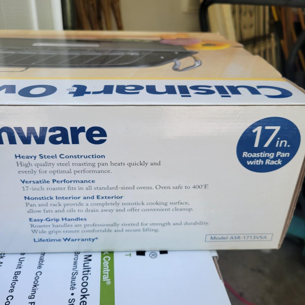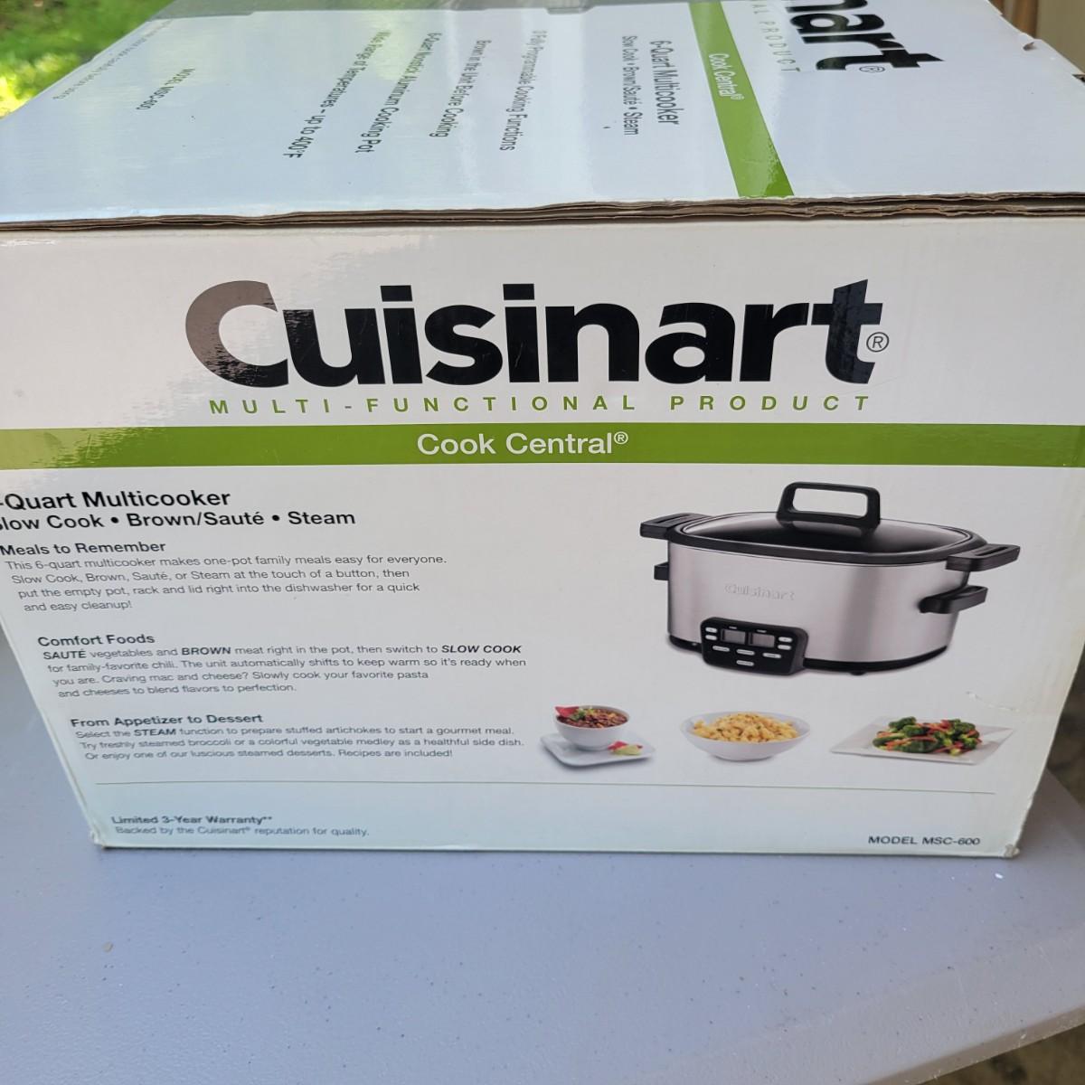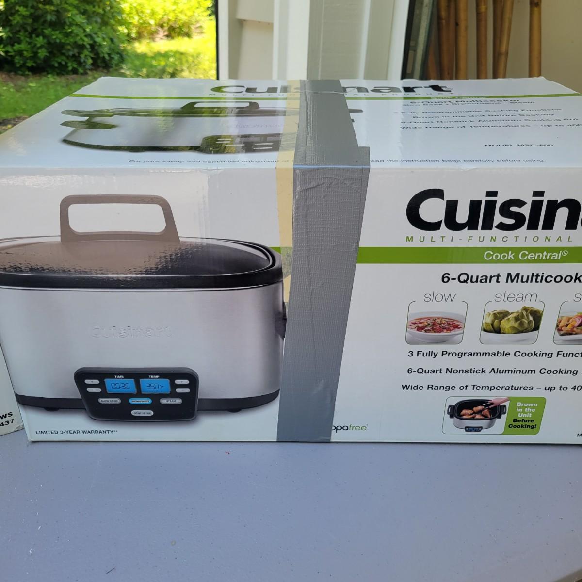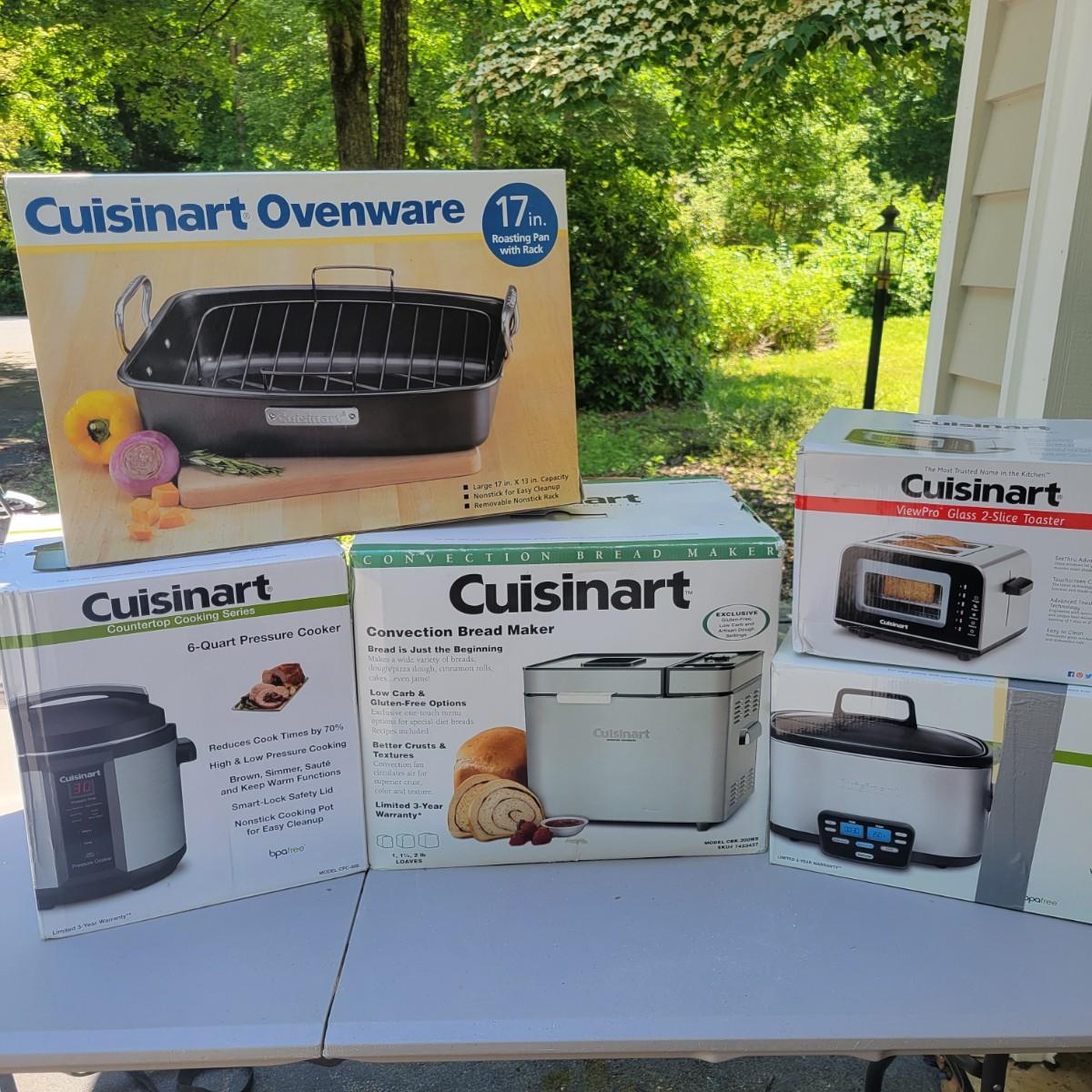 Lot of new Cuisinart appliances in original packaging. Glass 2 slice toaster. 17" roasting pan with rack. 6 qt multi cooker slow cook, brown/sauté and steam. 6 qt pressure cooker. Convection bread maker. All NIB. Local pickup only