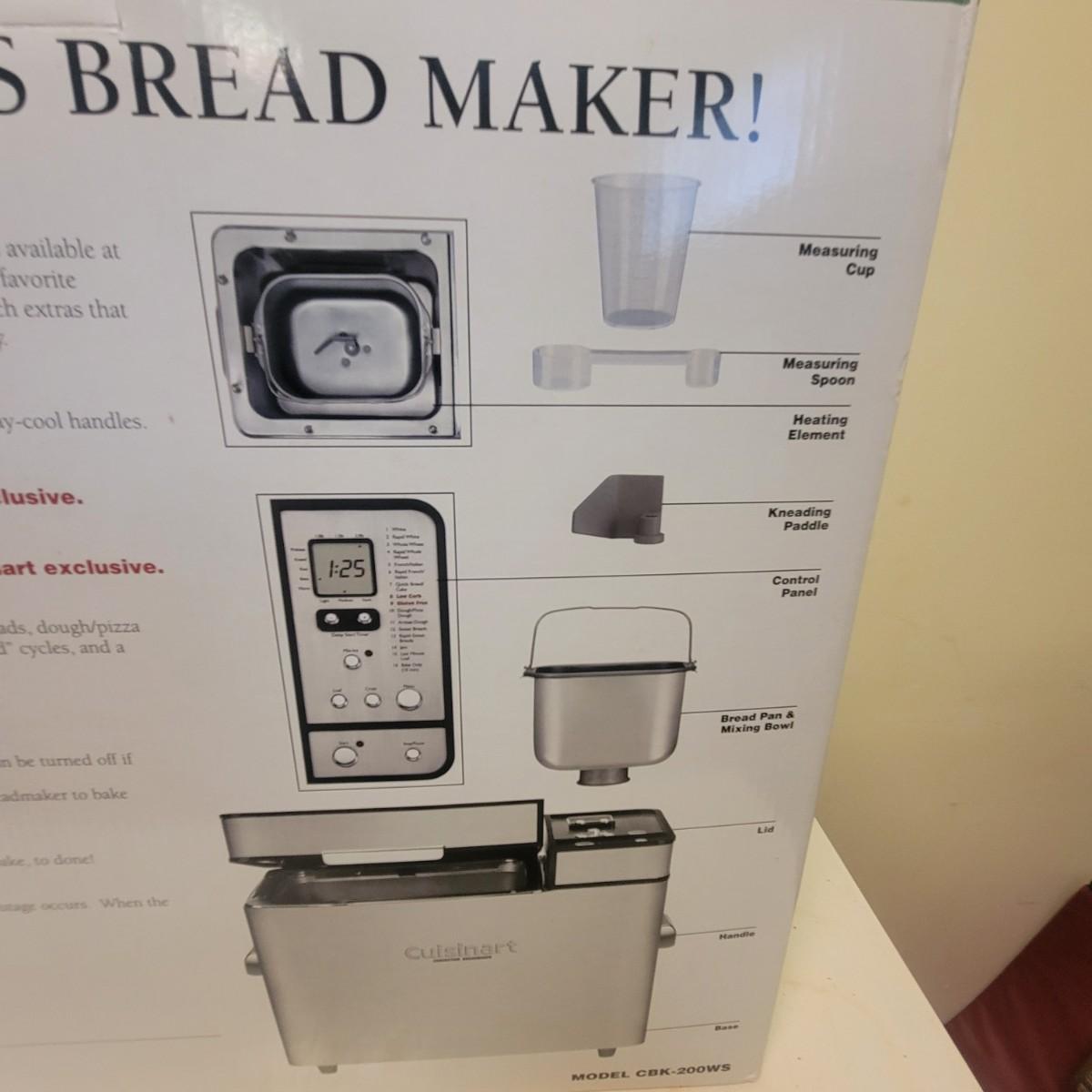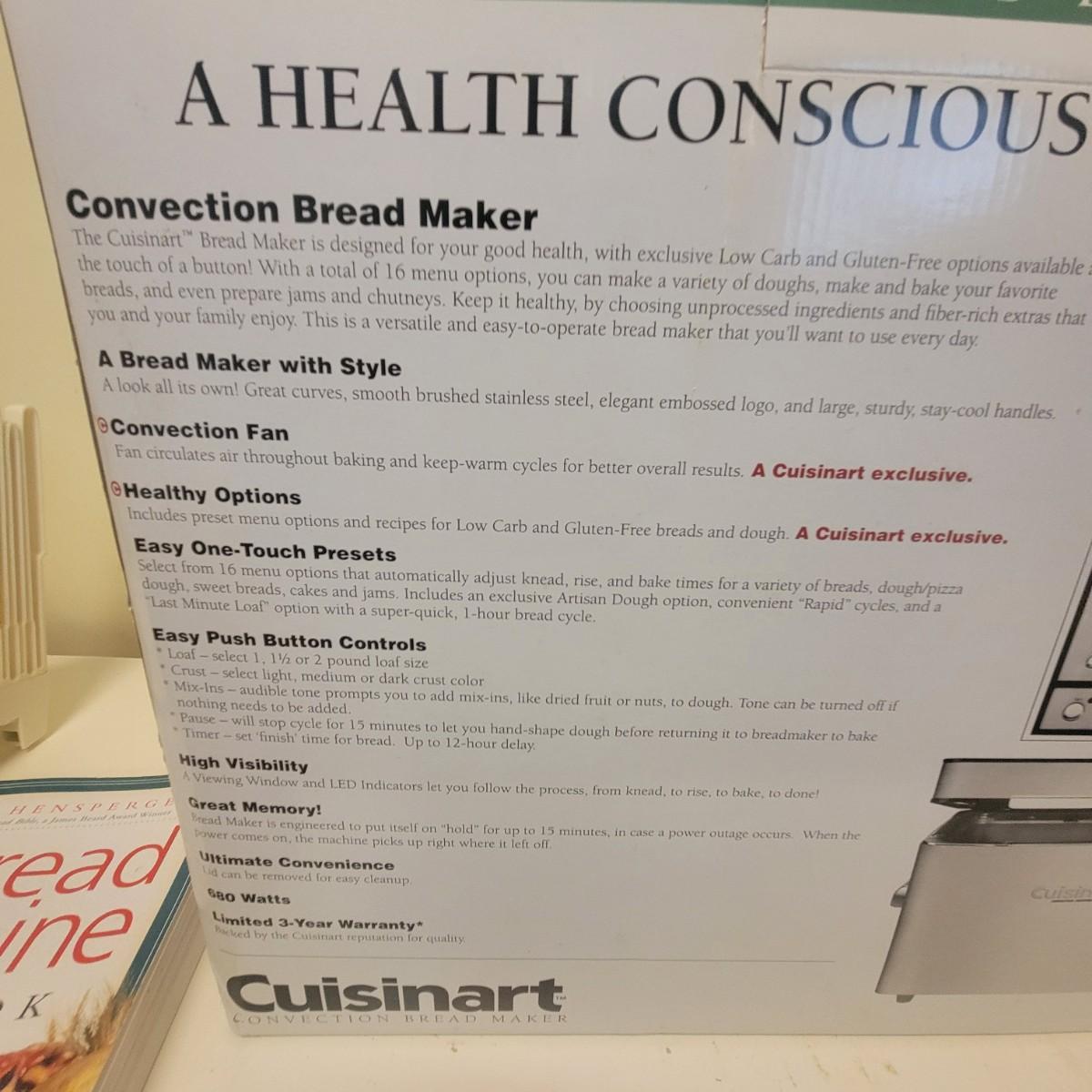 Cuisinart convection bread maker, new and in its original packaging. Also includes bread slicing guide, bread loaf container and bread machine cookbook. Local pickup only
