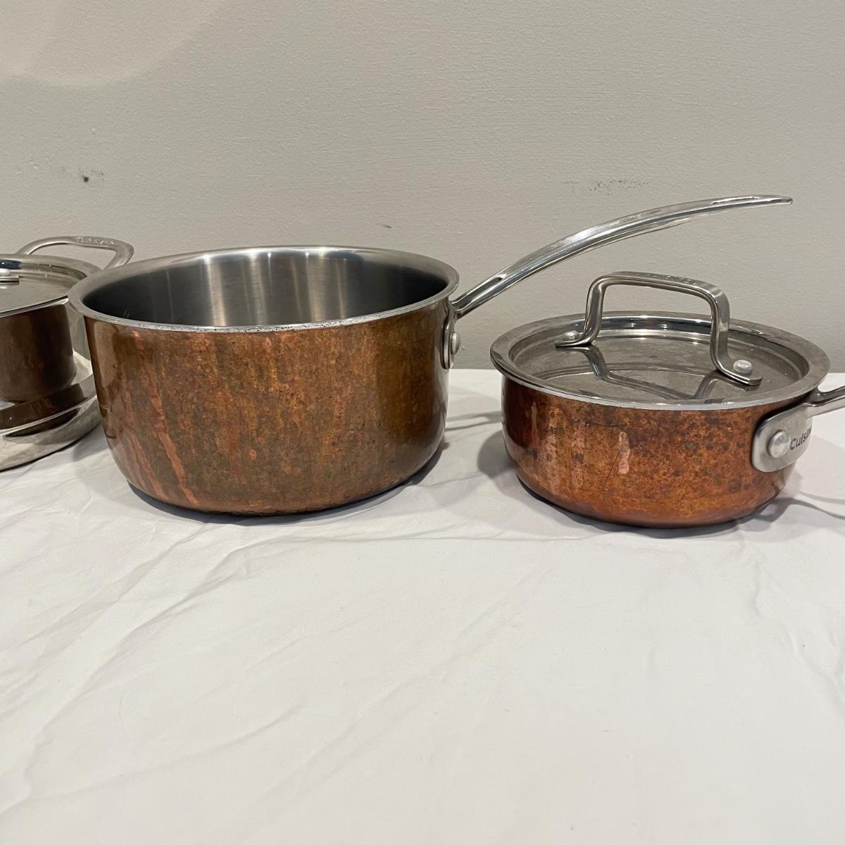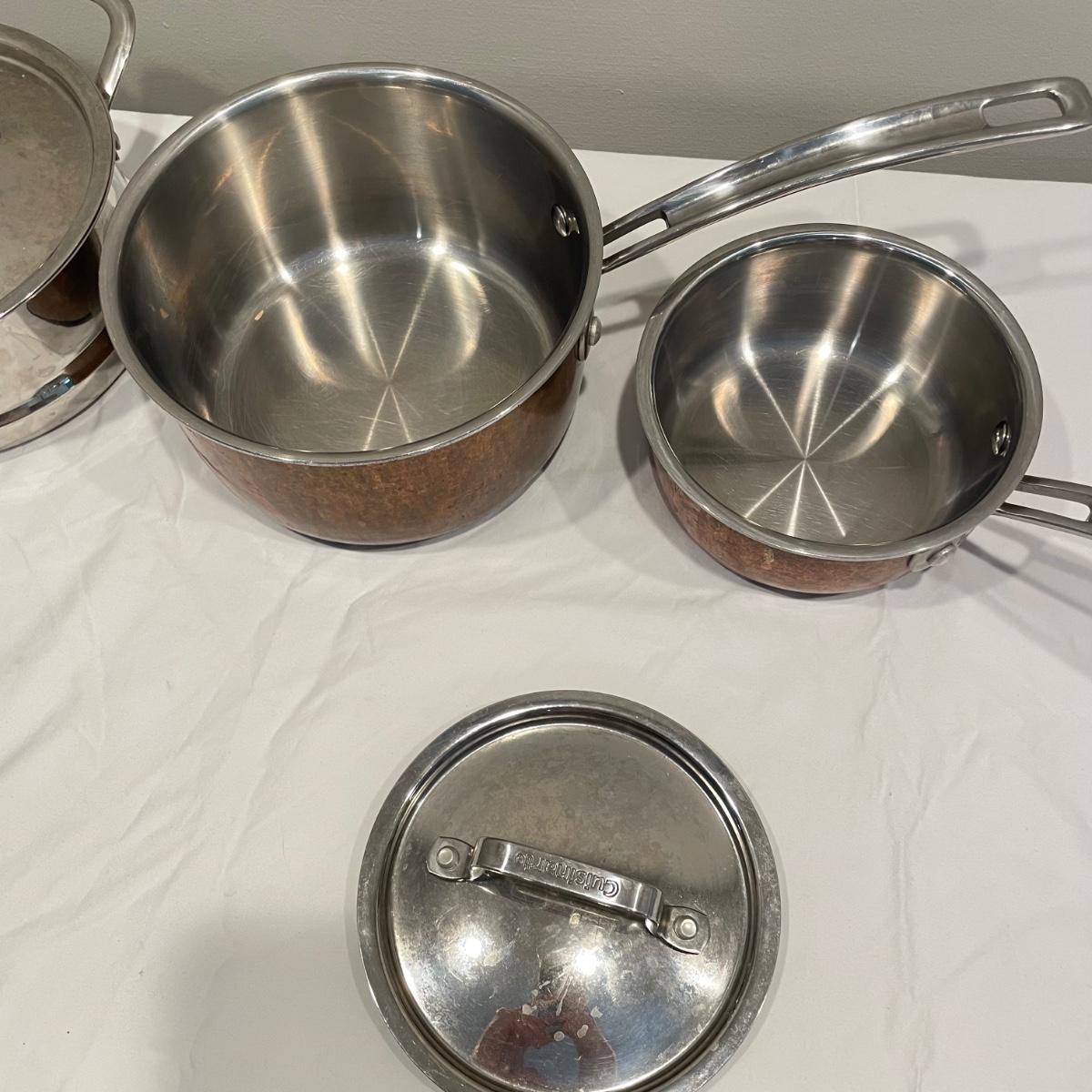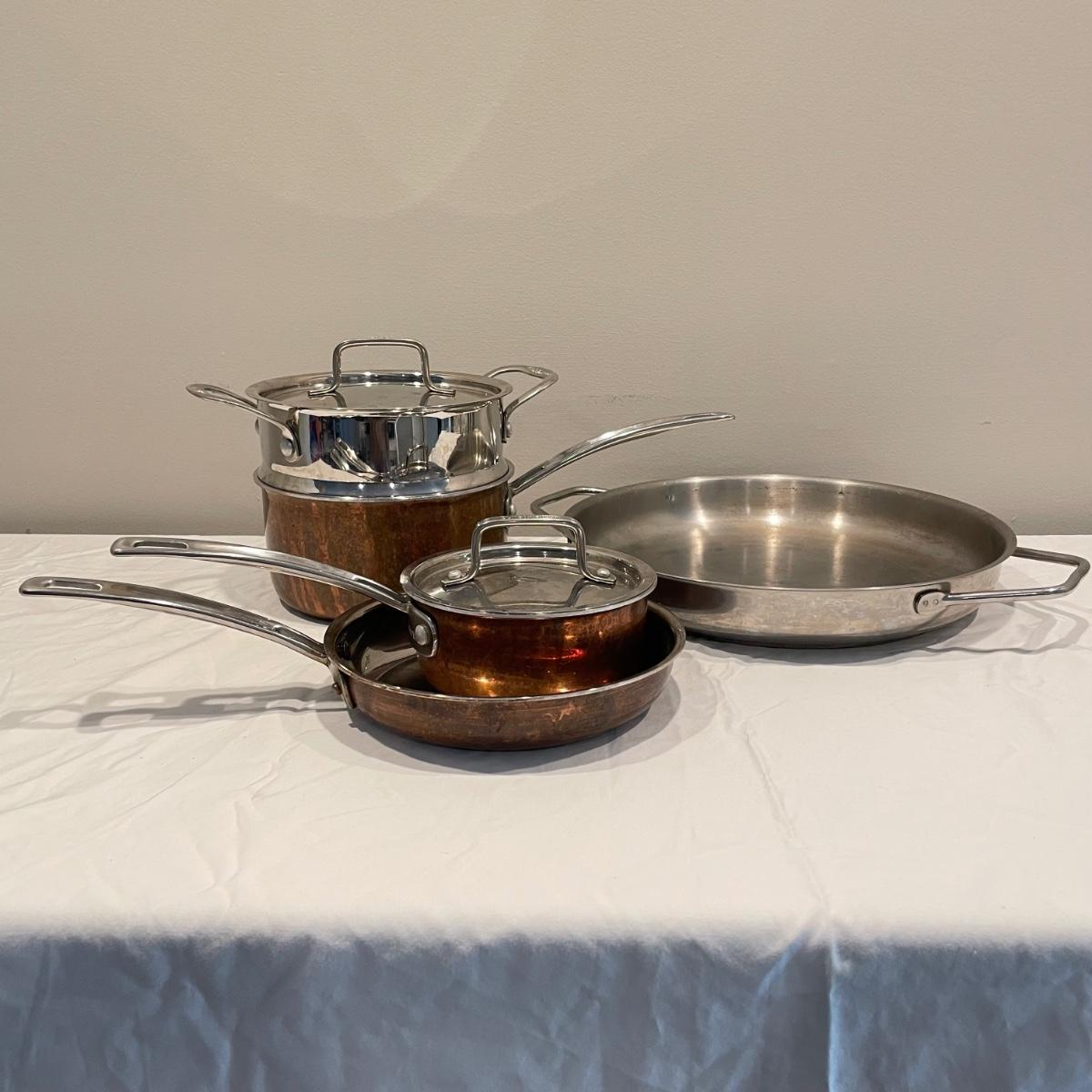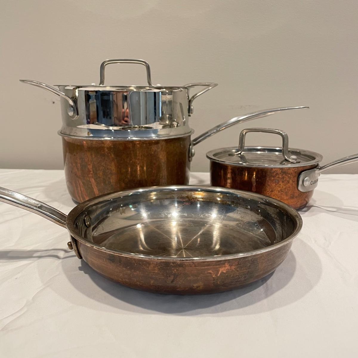 Two Tri-Ply copper bottom saucepans and an 8" skillet by Cuisinart. The larger pan is a 2.5 quart, it comes with a stainless steel steamer basket and lid. The smaller lidded pan is a 1 quart. Lot also includes a large 13" skillet, this piece has no known identifiers. See images. Local pick up only.