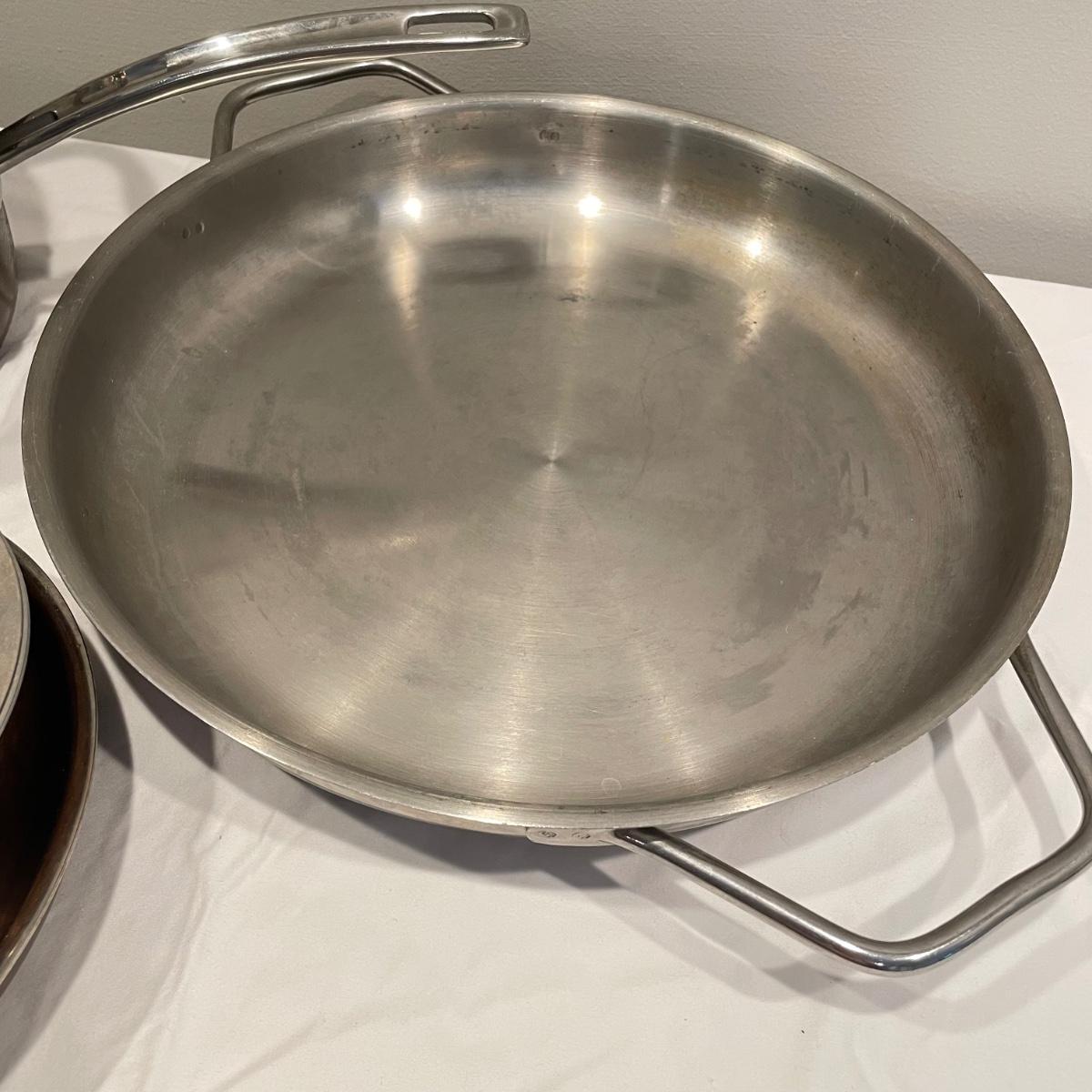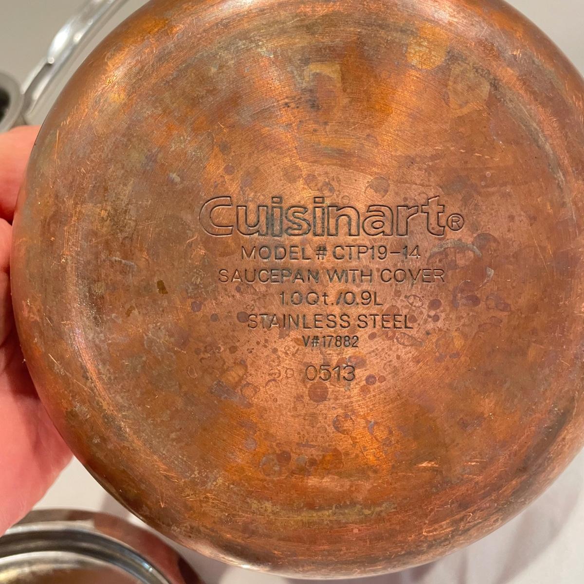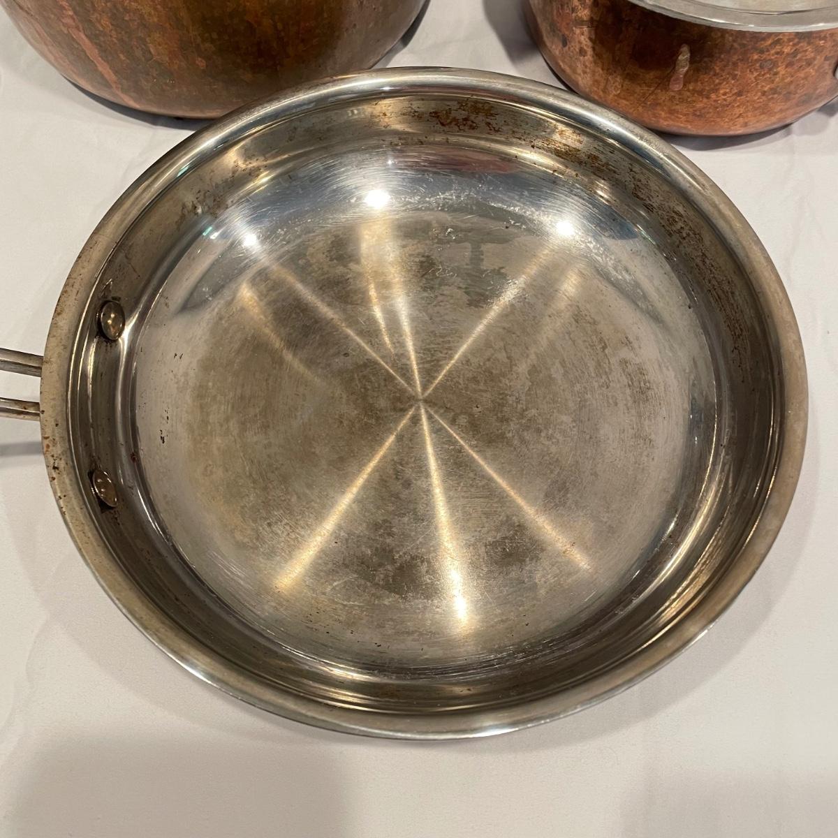 Two Tri-Ply copper bottom saucepans and an 8" skillet by Cuisinart. The larger pan is a 2.5 quart, it comes with a stainless steel steamer basket and lid. The smaller lidded pan is a 1 quart. Lot also includes a large 13" skillet, this piece has no known identifiers. See images. Local pick up only.