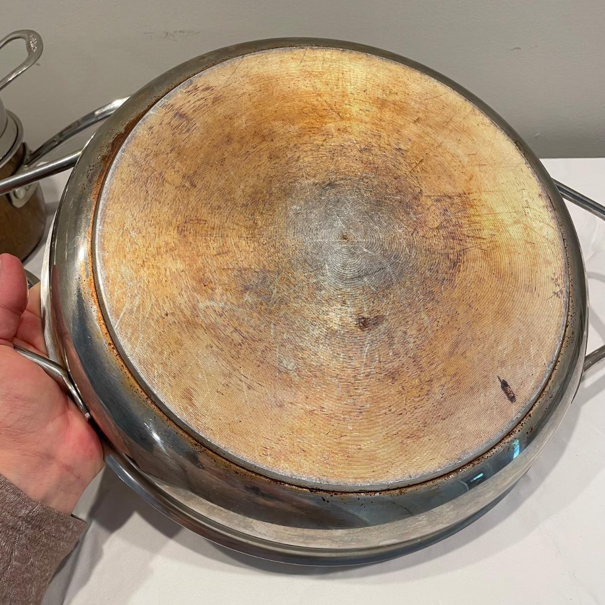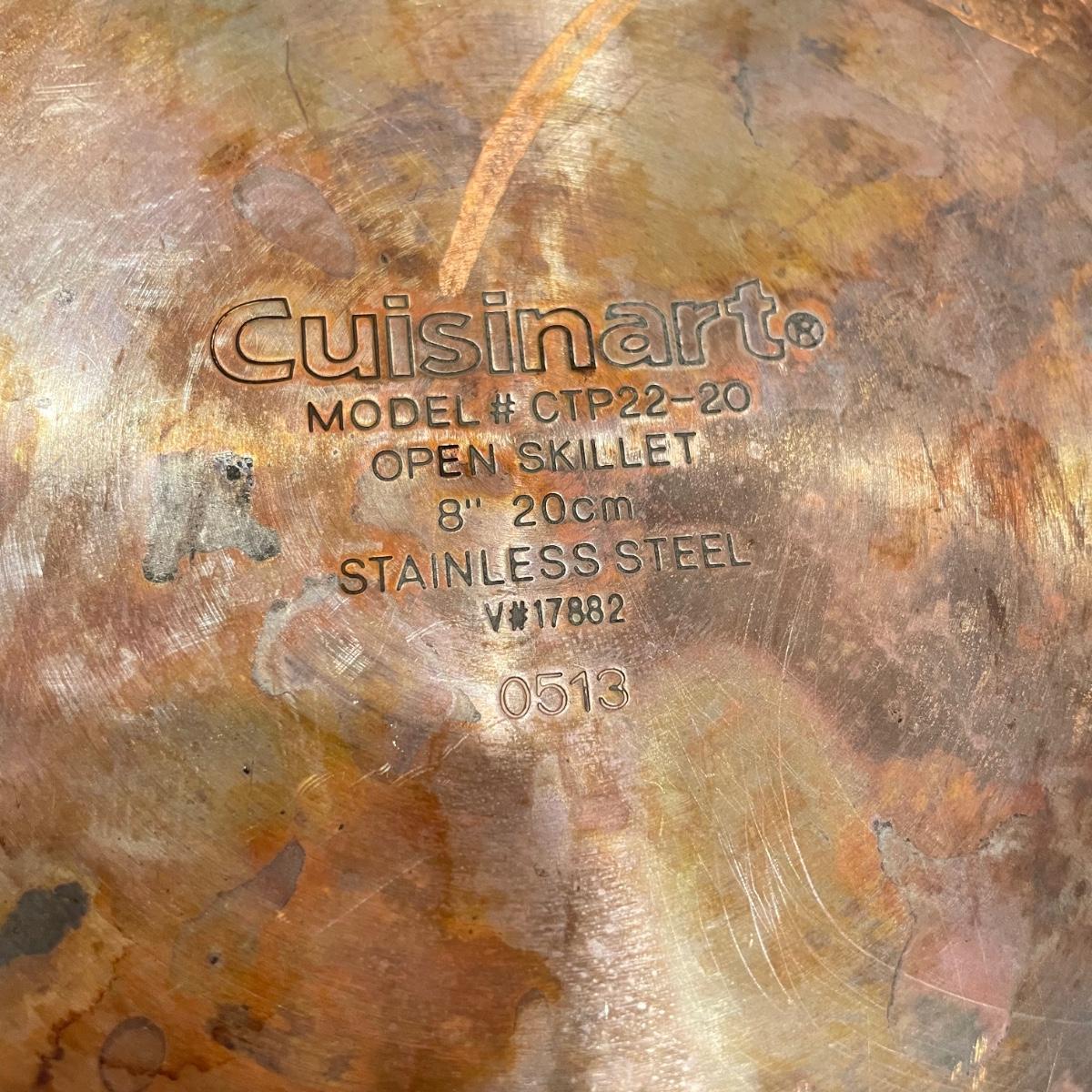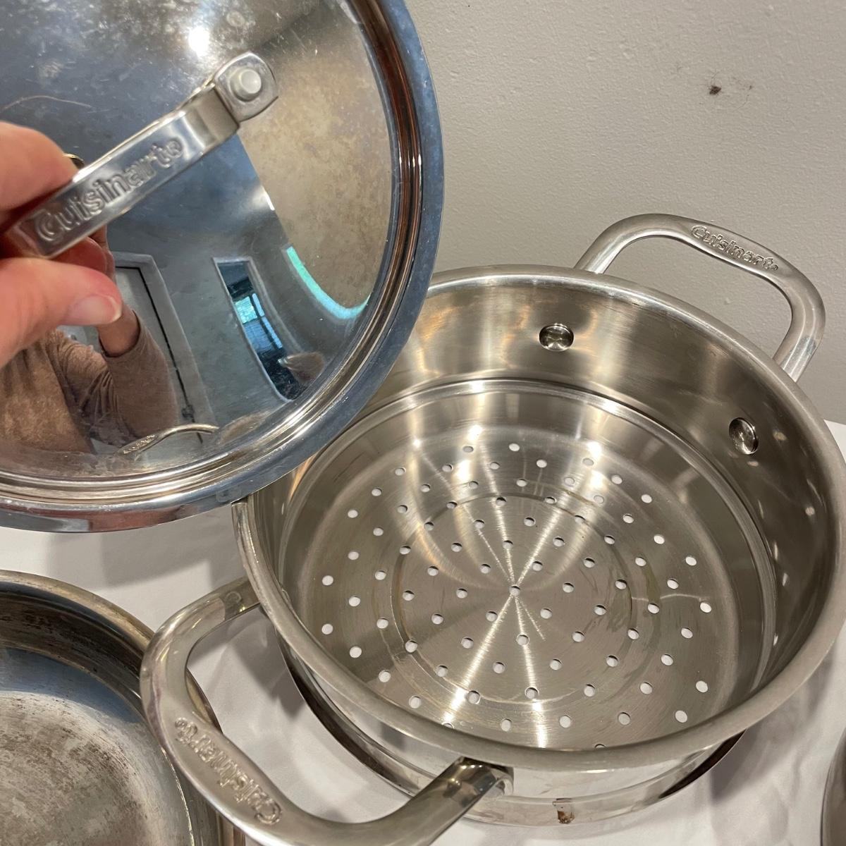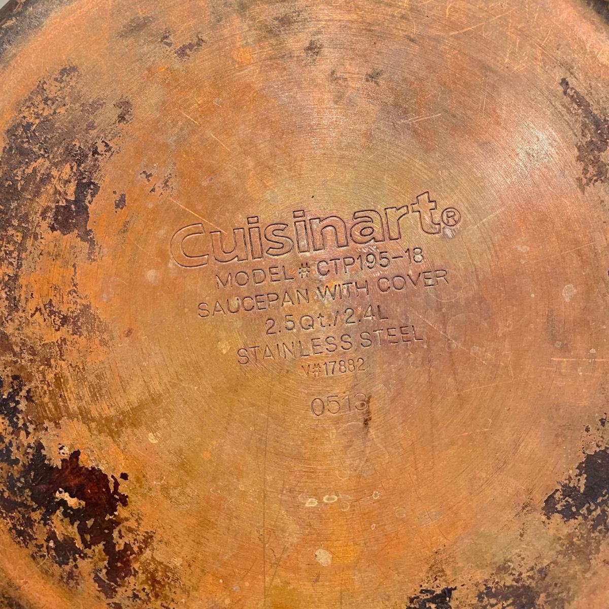 Two Tri-Ply copper bottom saucepans and an 8" skillet by Cuisinart. The larger pan is a 2.5 quart, it comes with a stainless steel steamer basket and lid. The smaller lidded pan is a 1 quart. Lot also includes a large 13" skillet, this piece has no known identifiers. See images. Local pick up only.