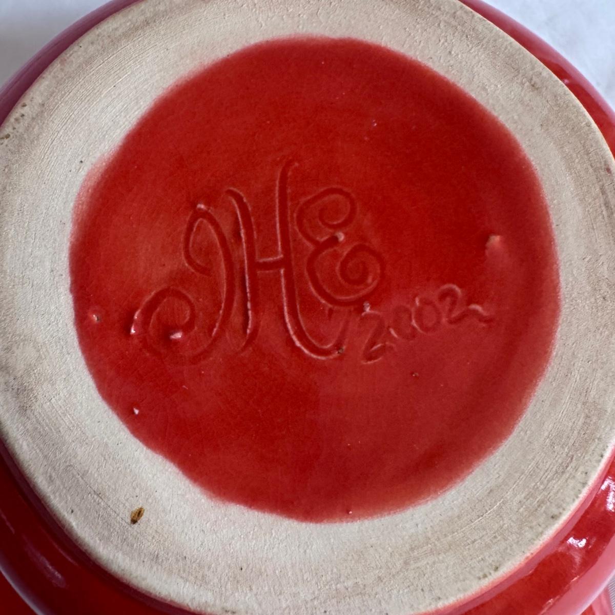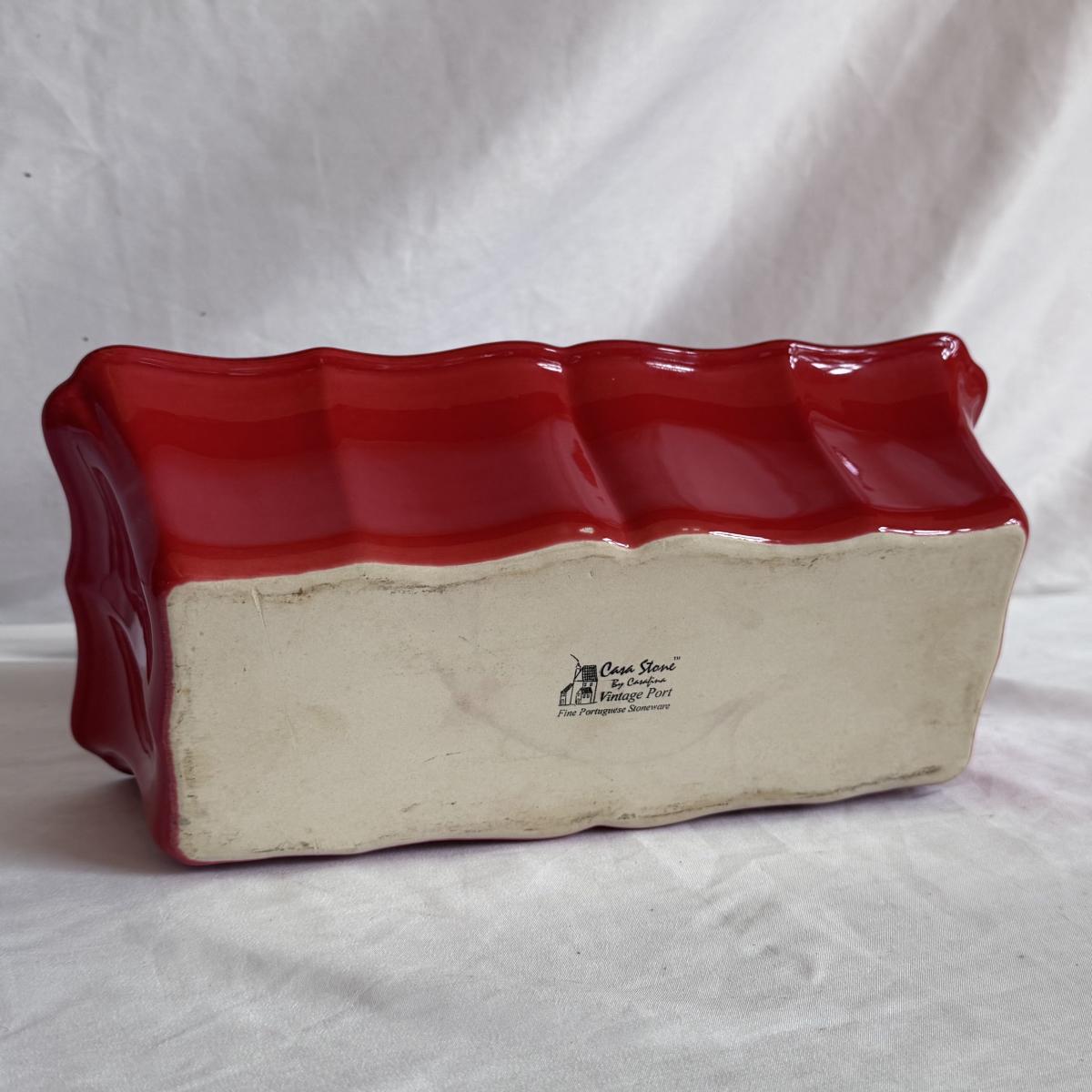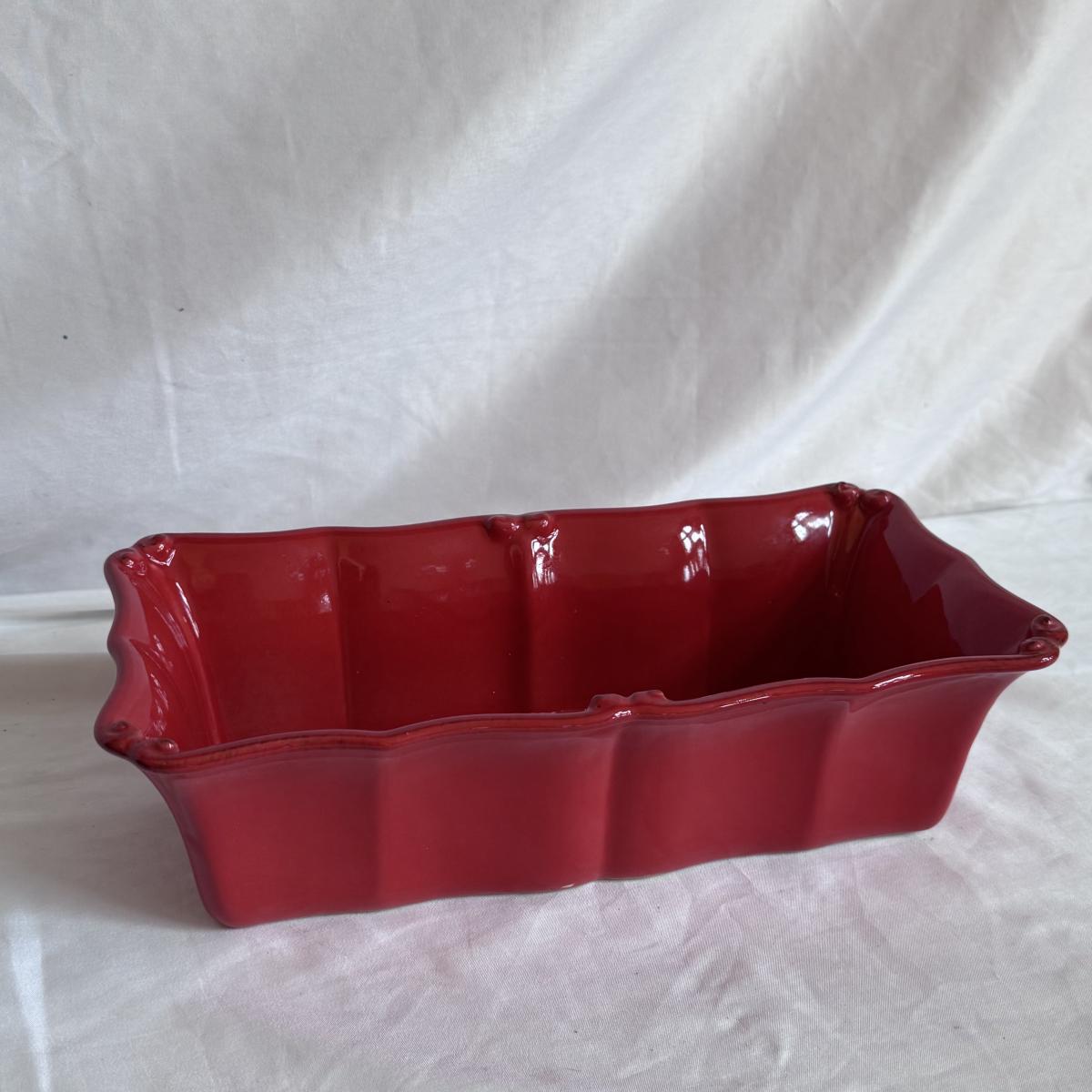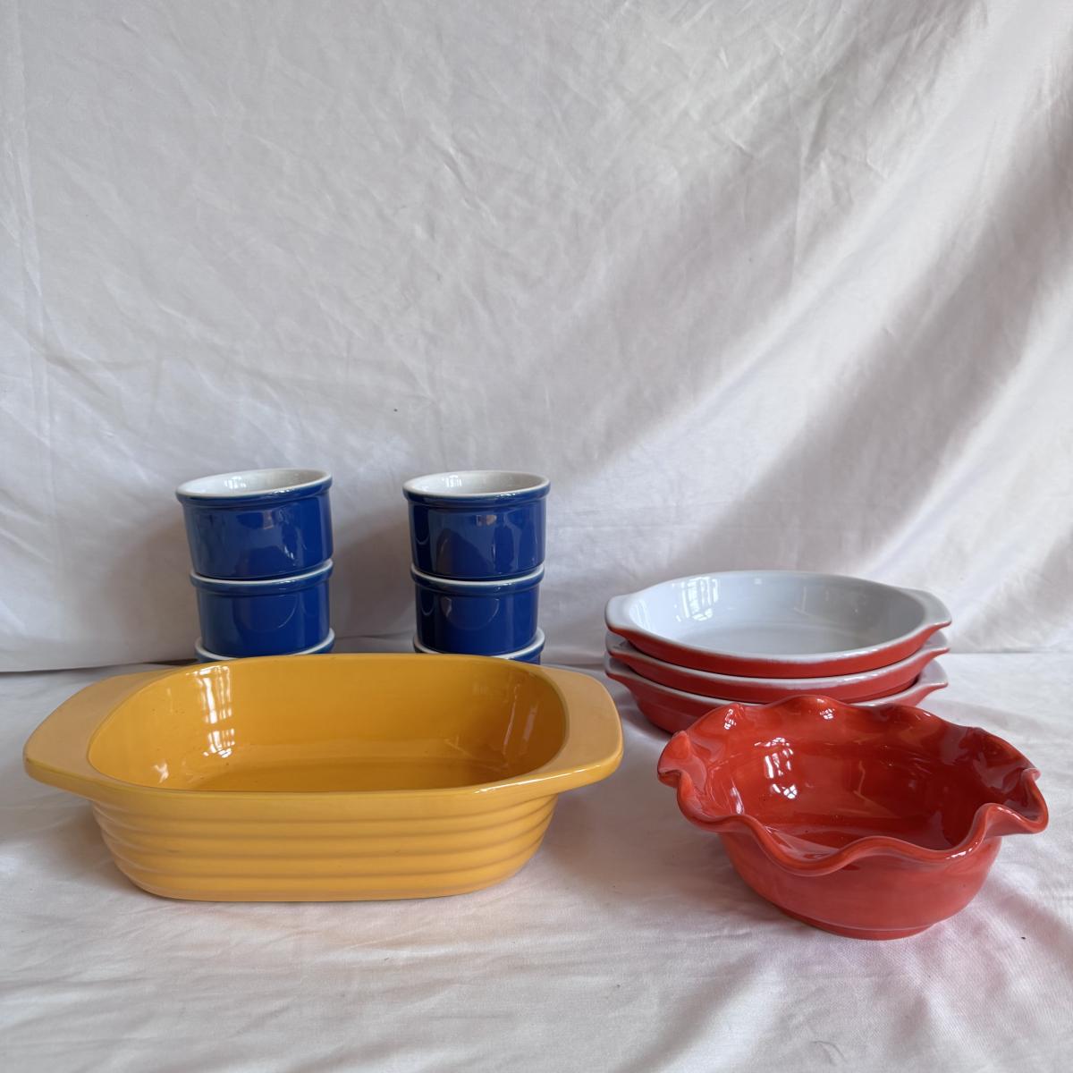 This lot of ceramic enamel bakeware includes six Cuisinart ramekins (5 fl. oz.), one red rectangular baking dish with handles from The Bake Shop, one red Emile Henry baking dish, one blue casserole dish from Sabatier’s Cannes collection, and three small oval dishes in red from Emile Henry. You’ll also find a red ceramic with red enamel loaf pan by Casa Stone, a yellow Chantal 1qt casserole dish with handles, a red ceramic bowl with a wavy rim, and a red serving dish by Ceramiche Alfa in Italy. The ceramic loaf pan by Casa Stone measures 11.5” x 6” x 3”H. Shipping available.