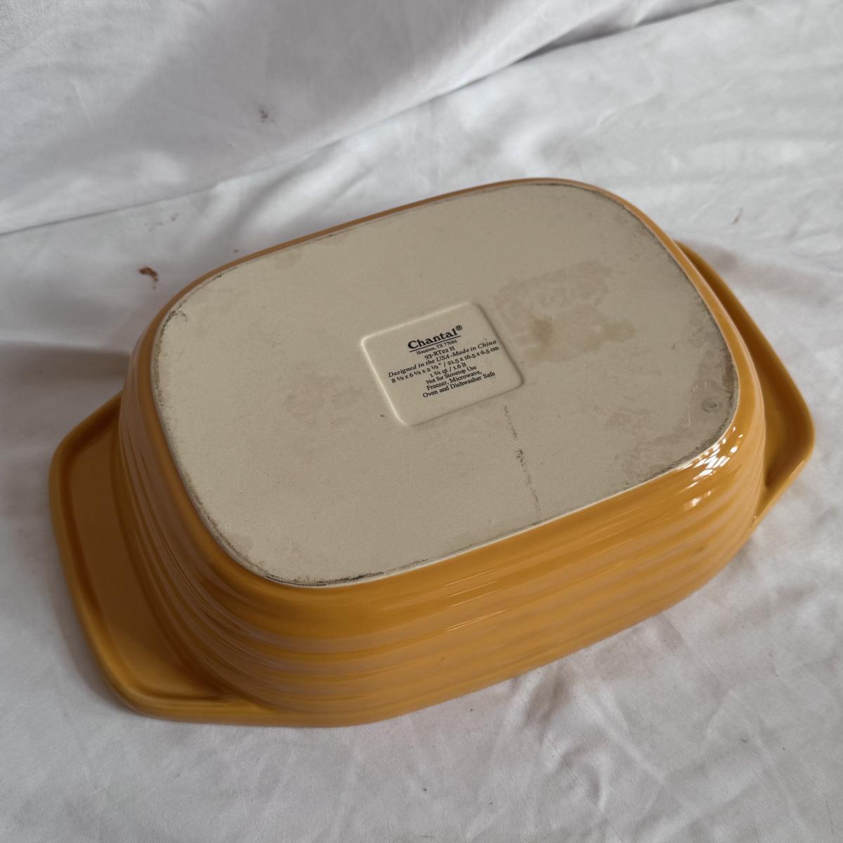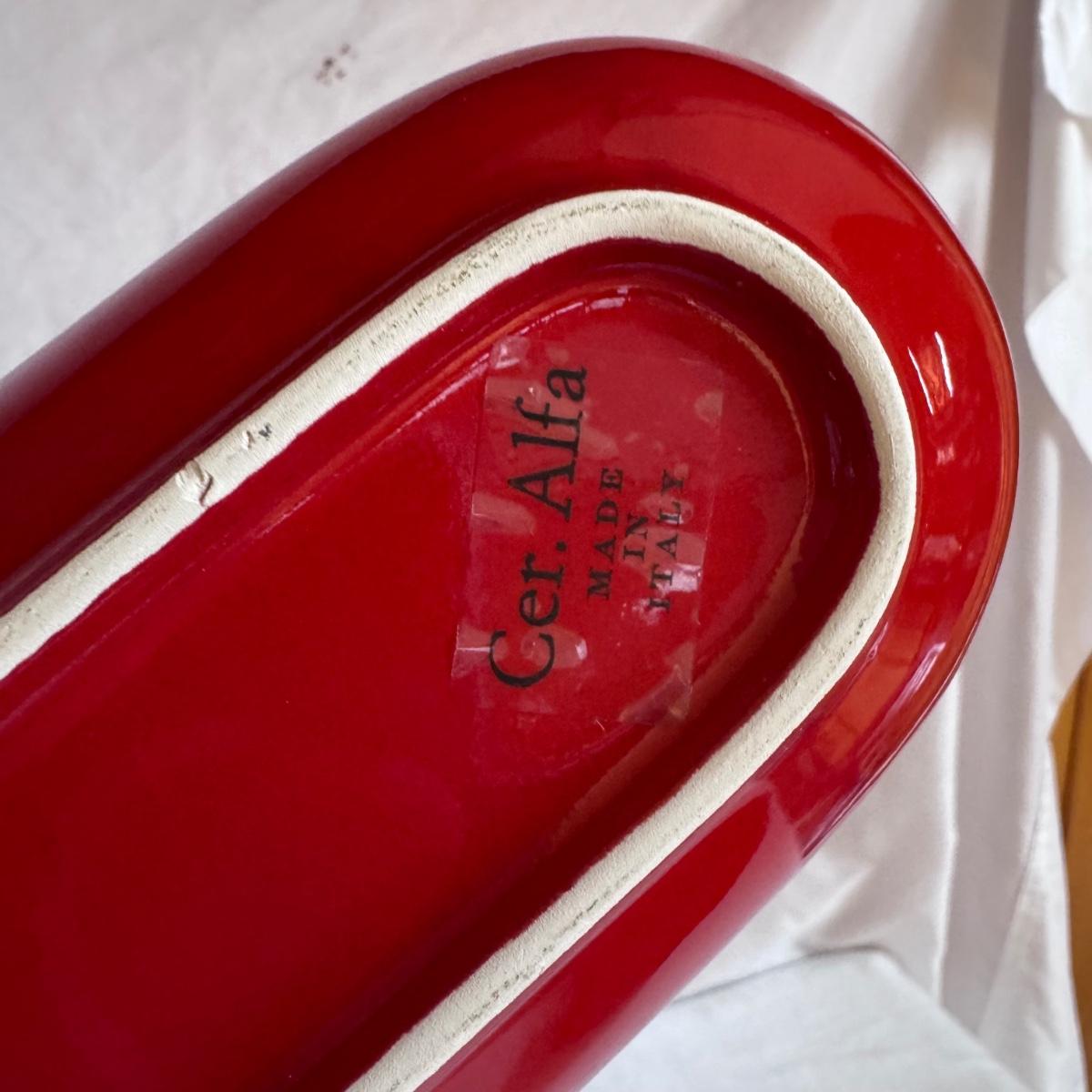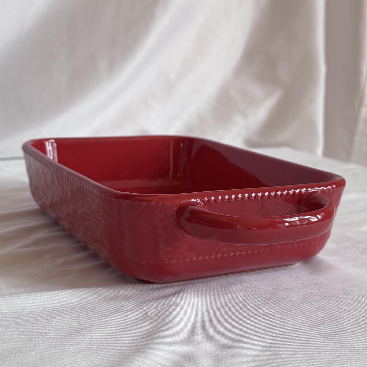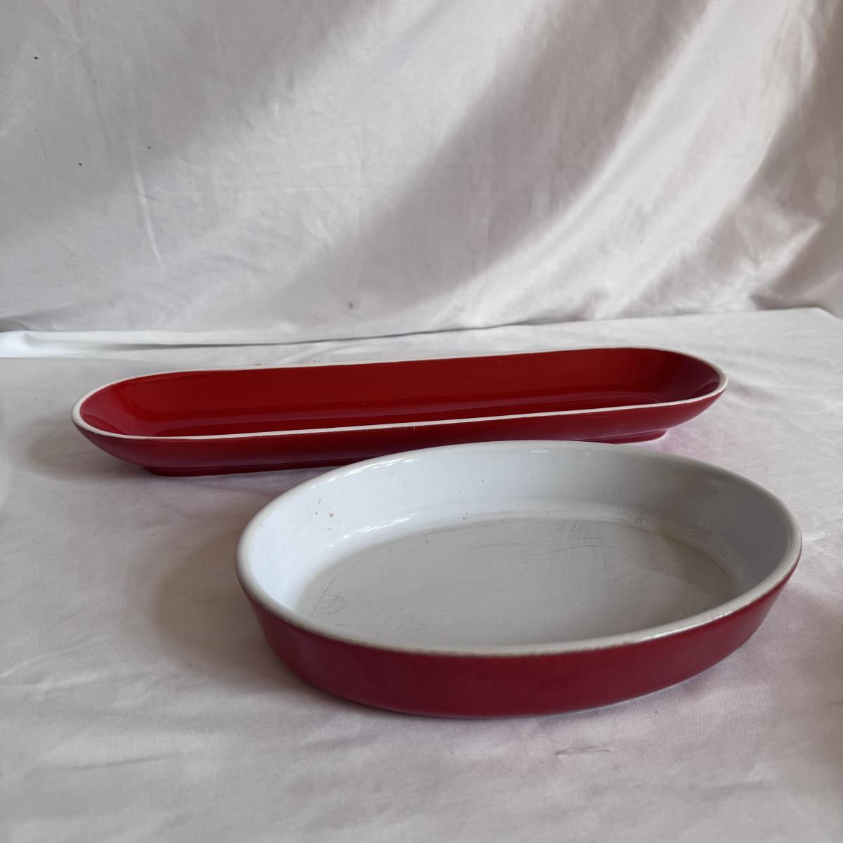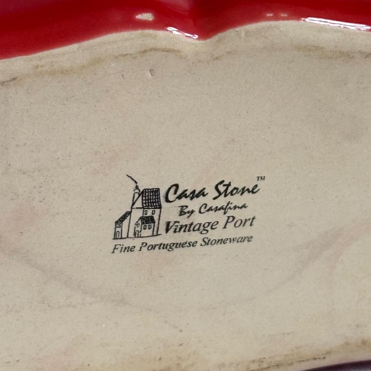 This lot of ceramic enamel bakeware includes six Cuisinart ramekins (5 fl. oz.), one red rectangular baking dish with handles from The Bake Shop, one red Emile Henry baking dish, one blue casserole dish from Sabatier’s Cannes collection, and three small oval dishes in red from Emile Henry. You’ll also find a red ceramic with red enamel loaf pan by Casa Stone, a yellow Chantal 1qt casserole dish with handles, a red ceramic bowl with a wavy rim, and a red serving dish by Ceramiche Alfa in Italy. The ceramic loaf pan by Casa Stone measures 11.5” x 6” x 3”H. Shipping available.