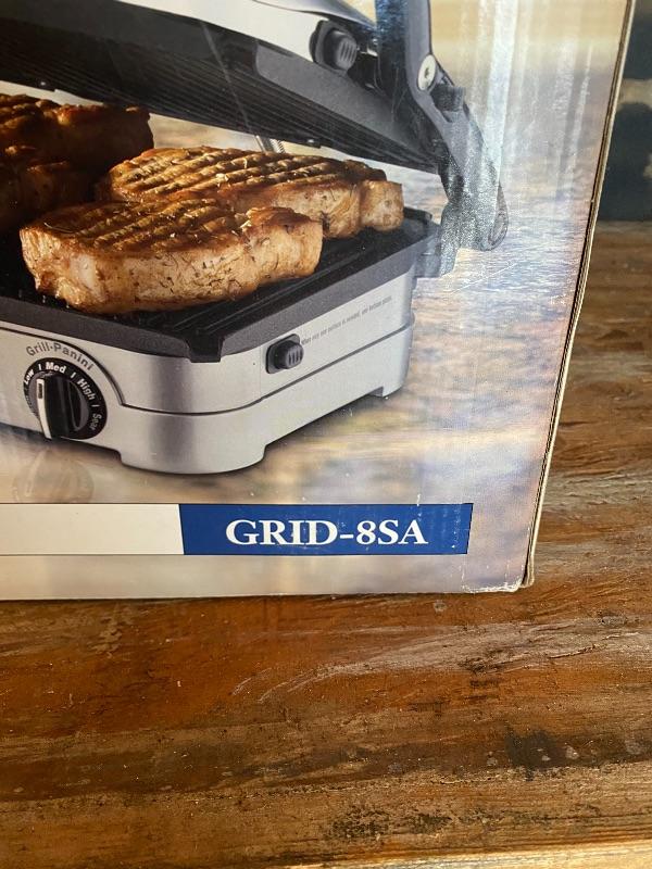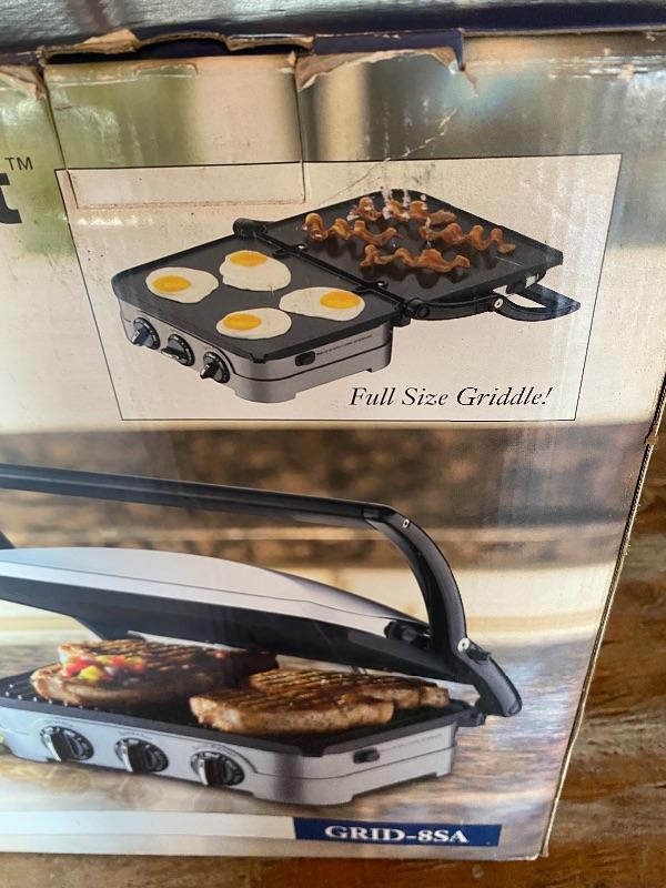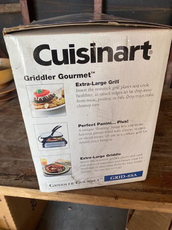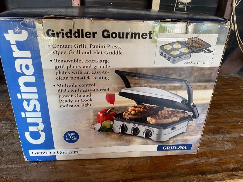 Cuisinart Griddler Gourmet. Model #GRID-85A. NEW in BOX. Can be used as an open griddle, open grill, panini press, or contact grill. Electric, removable heat plates, multi knob controls. Comes with booklet. Box has wear from storage.