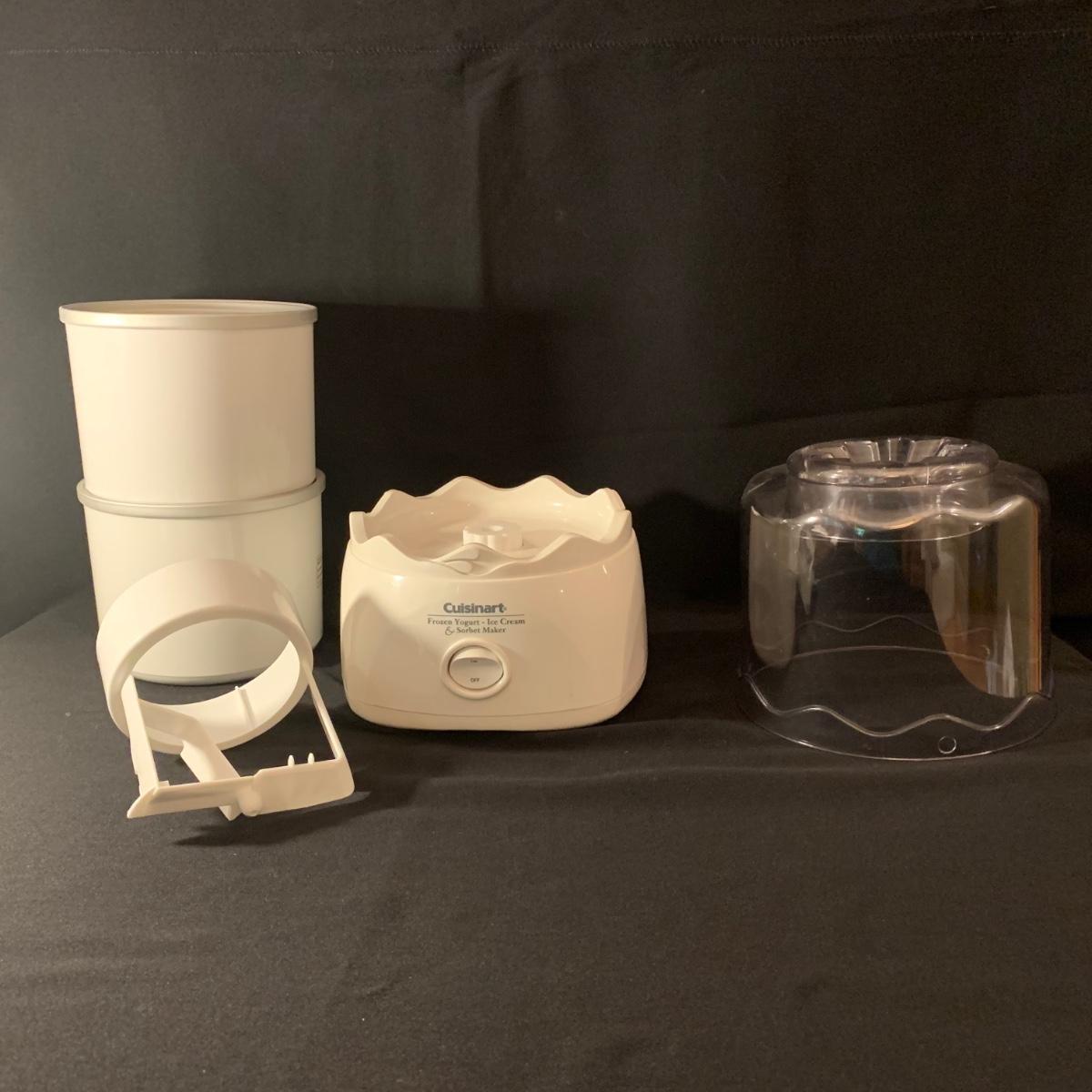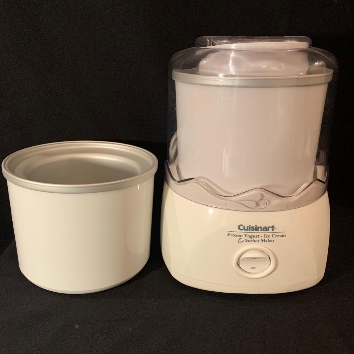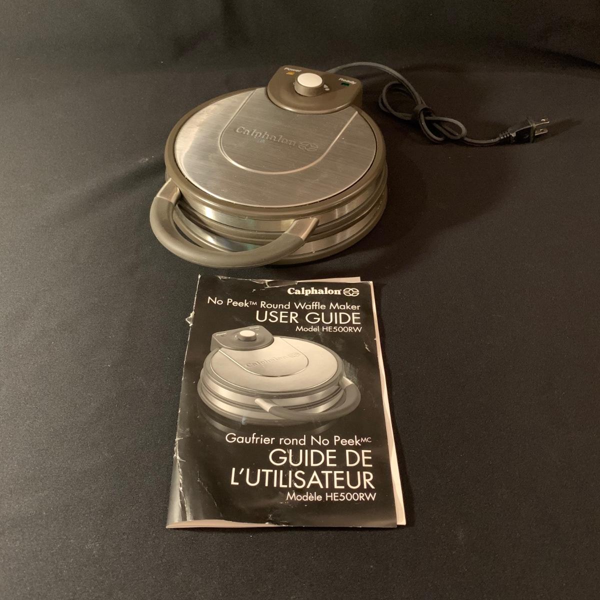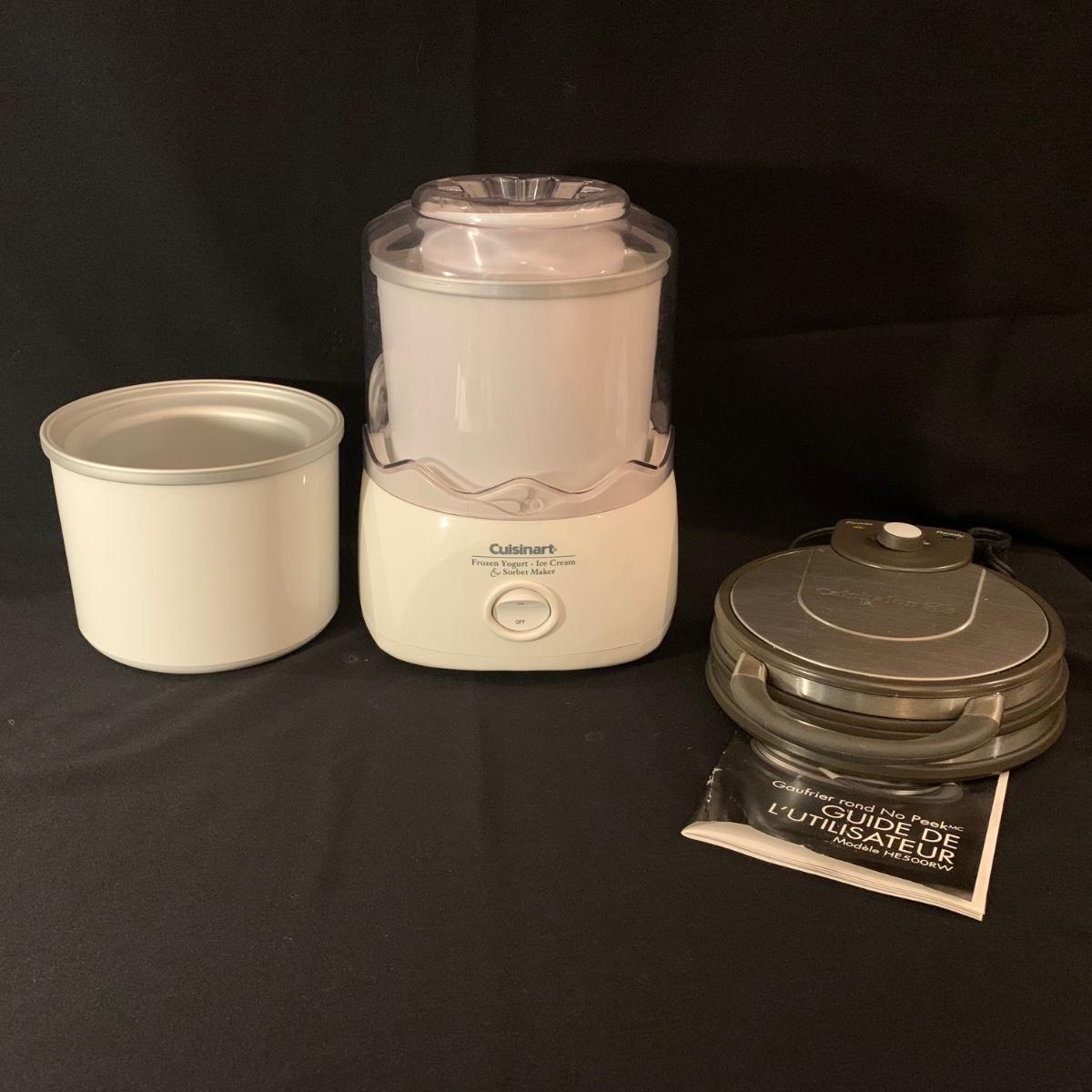 Lot includes Cuisinart Frozen Dessert maker and Calphalon Electric Waffle Iron. Cusinart makes Frozen Yogurt, Ice Cream, and Sorbet. It measures, 8” x 8” x 12”H. Both items power on and are in used condition. Please see photos for more details.