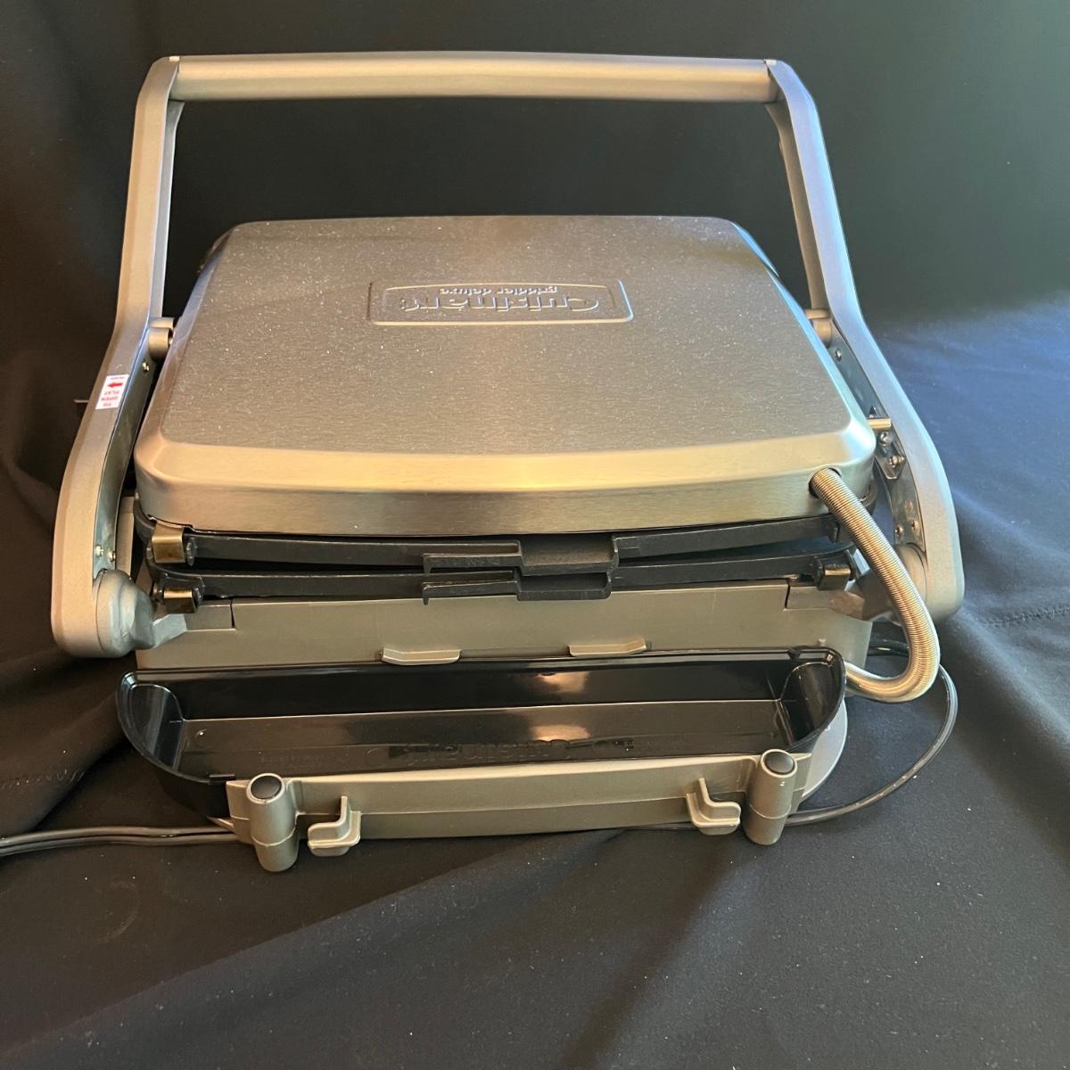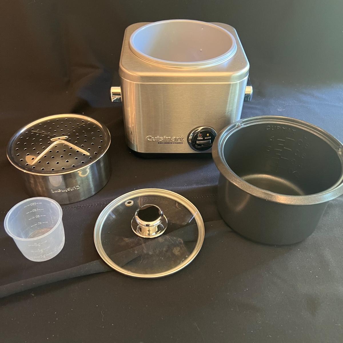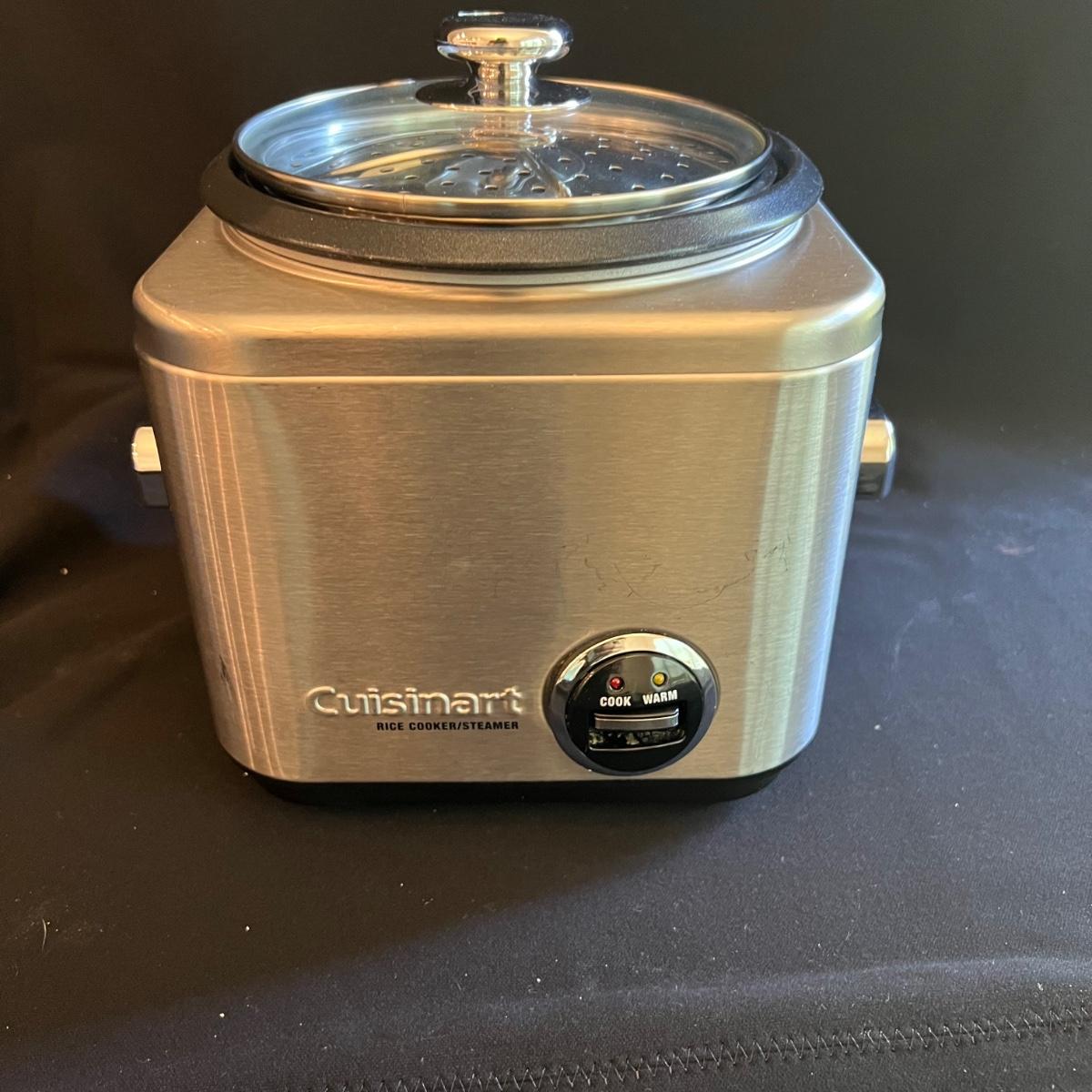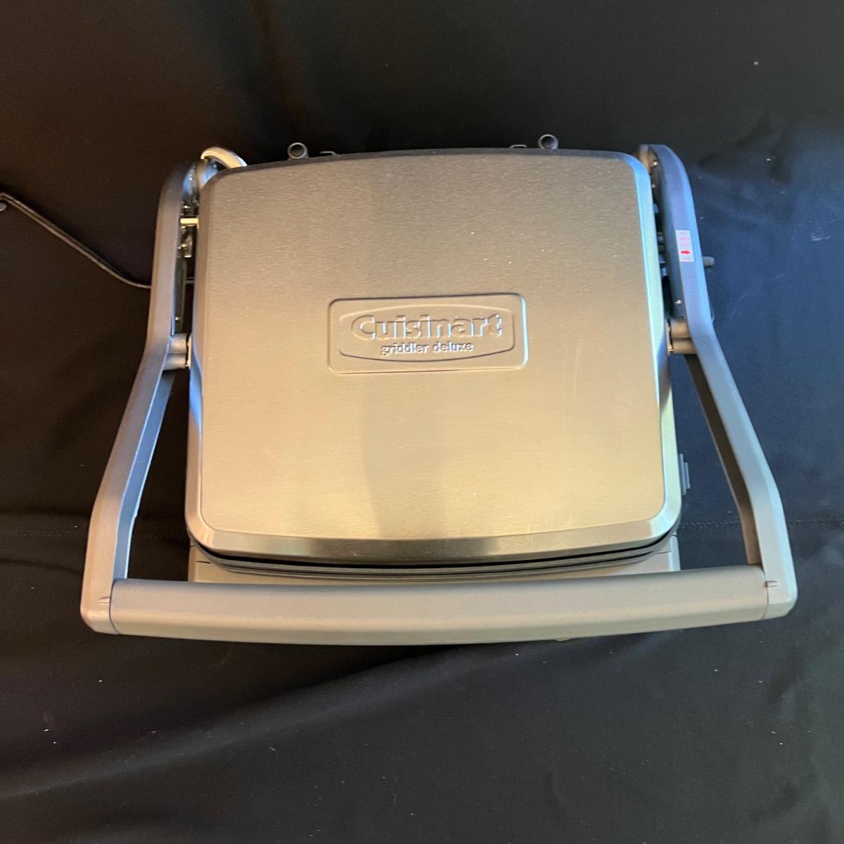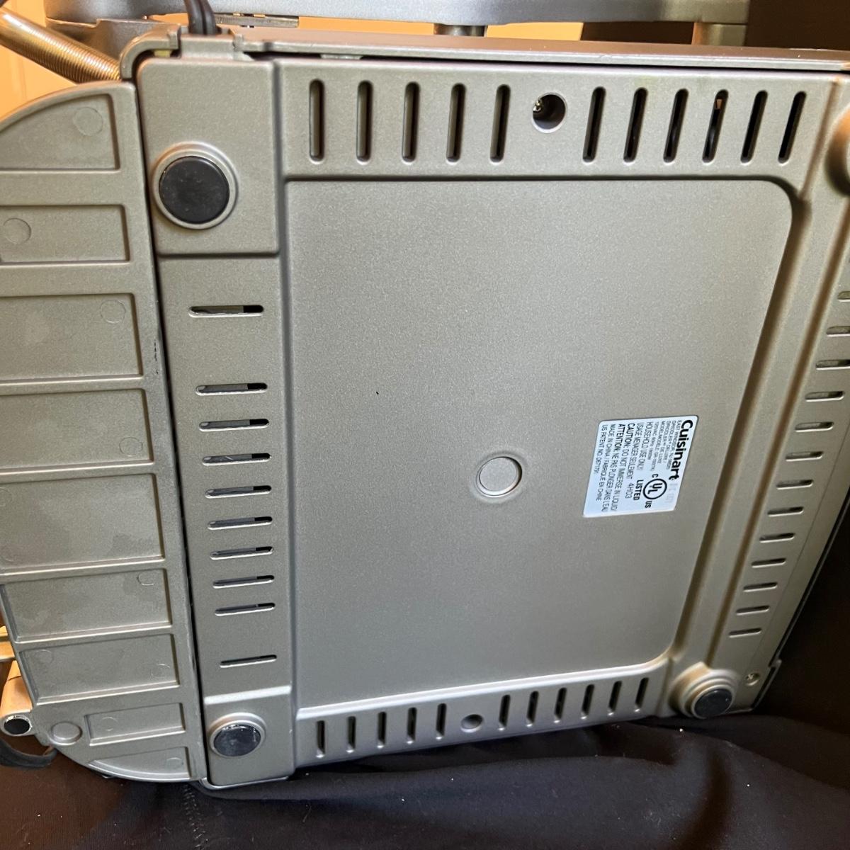 The three pieces of luxury Cuisinart kitchen equipment include a griddle press, rice cooker/steamer and a toaster. The four slot toaster measures 11” x 9.5” x 7.5”H. The Cuisinart griddles deluxe with two presser irons measures approximately 13” x 13” x 8.5”H.