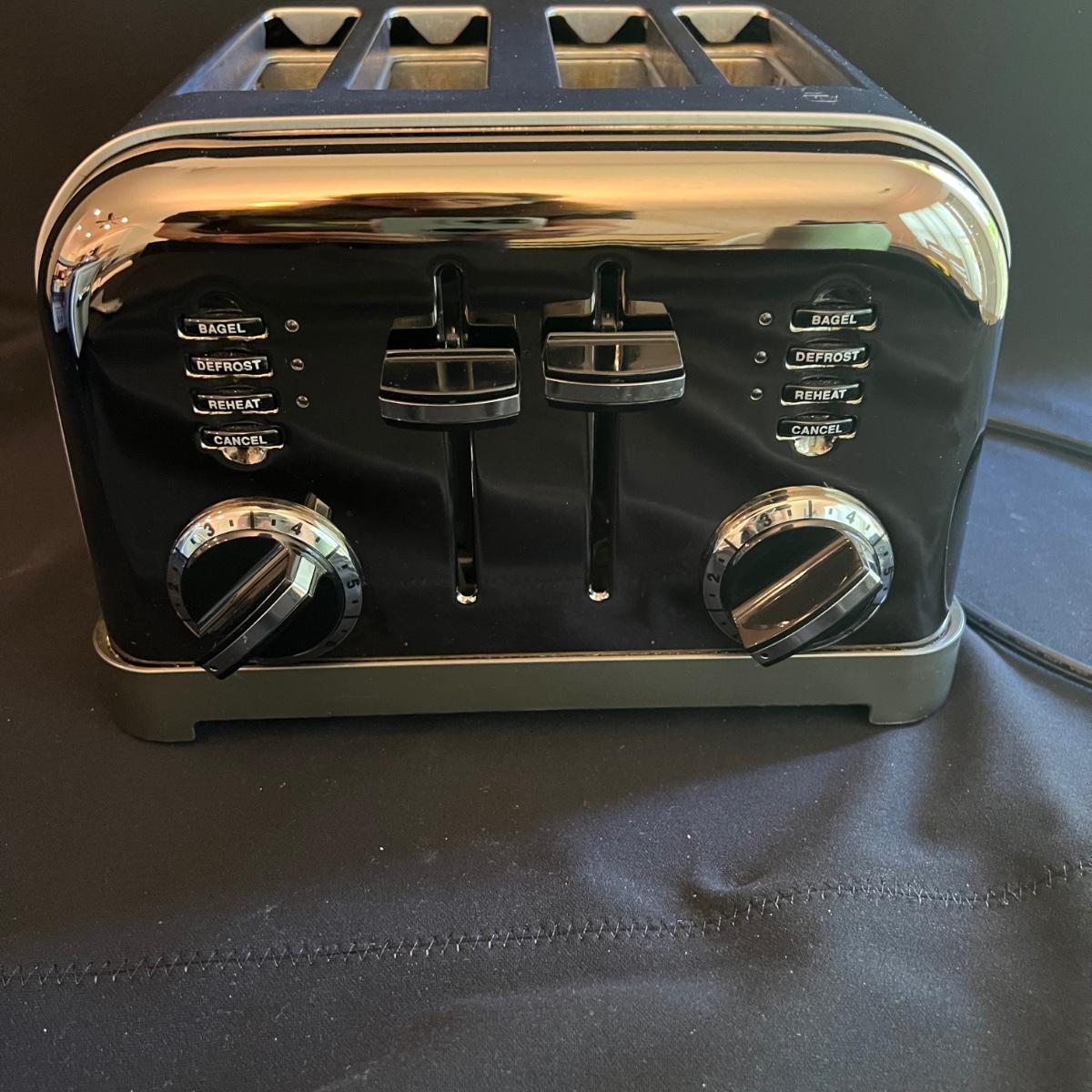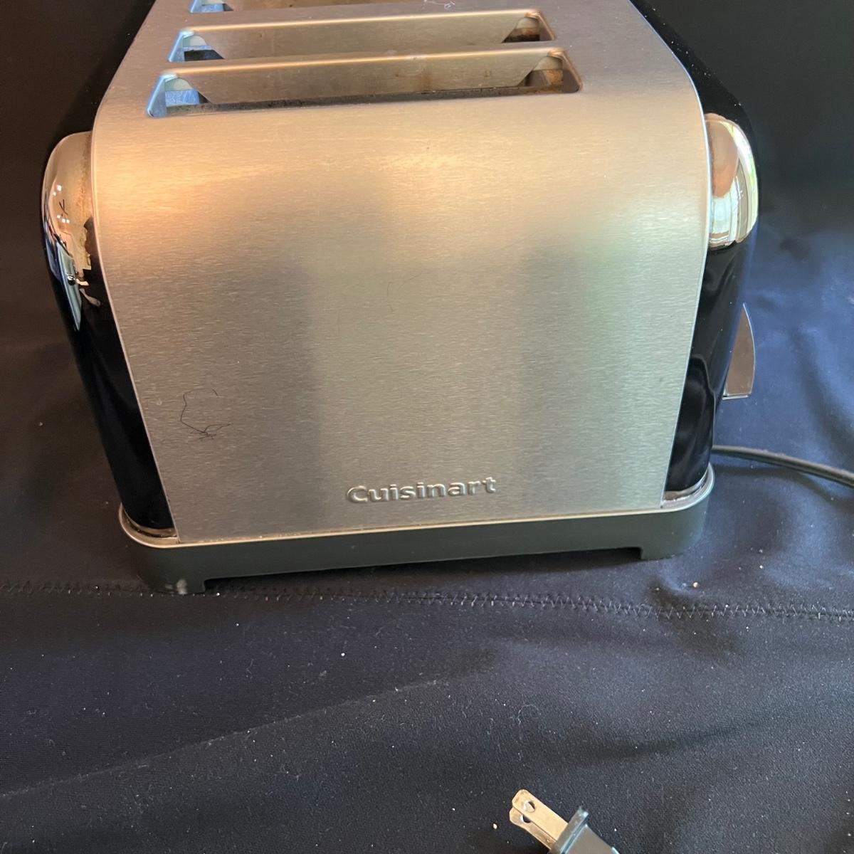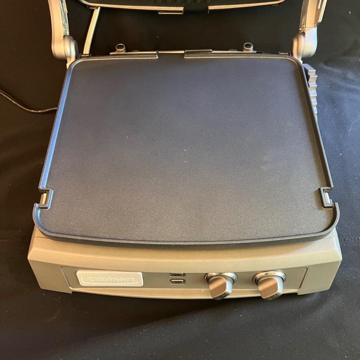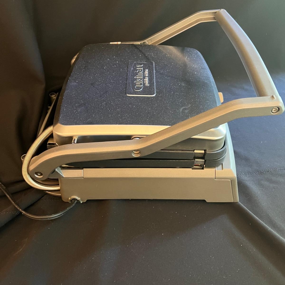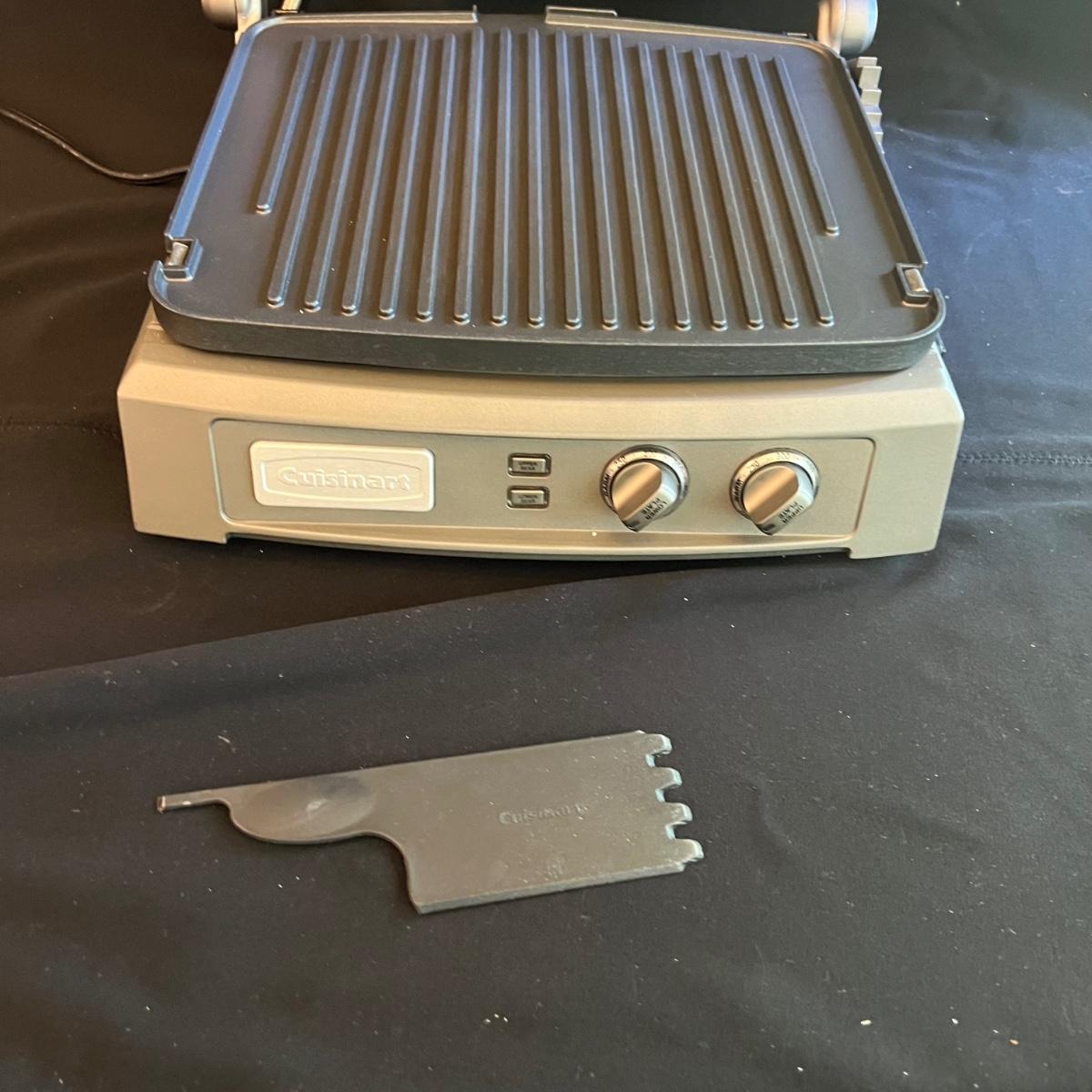 The three pieces of luxury Cuisinart kitchen equipment include a griddle press, rice cooker/steamer and a toaster. The four slot toaster measures 11” x 9.5” x 7.5”H. The Cuisinart griddles deluxe with two presser irons measures approximately 13” x 13” x 8.5”H.