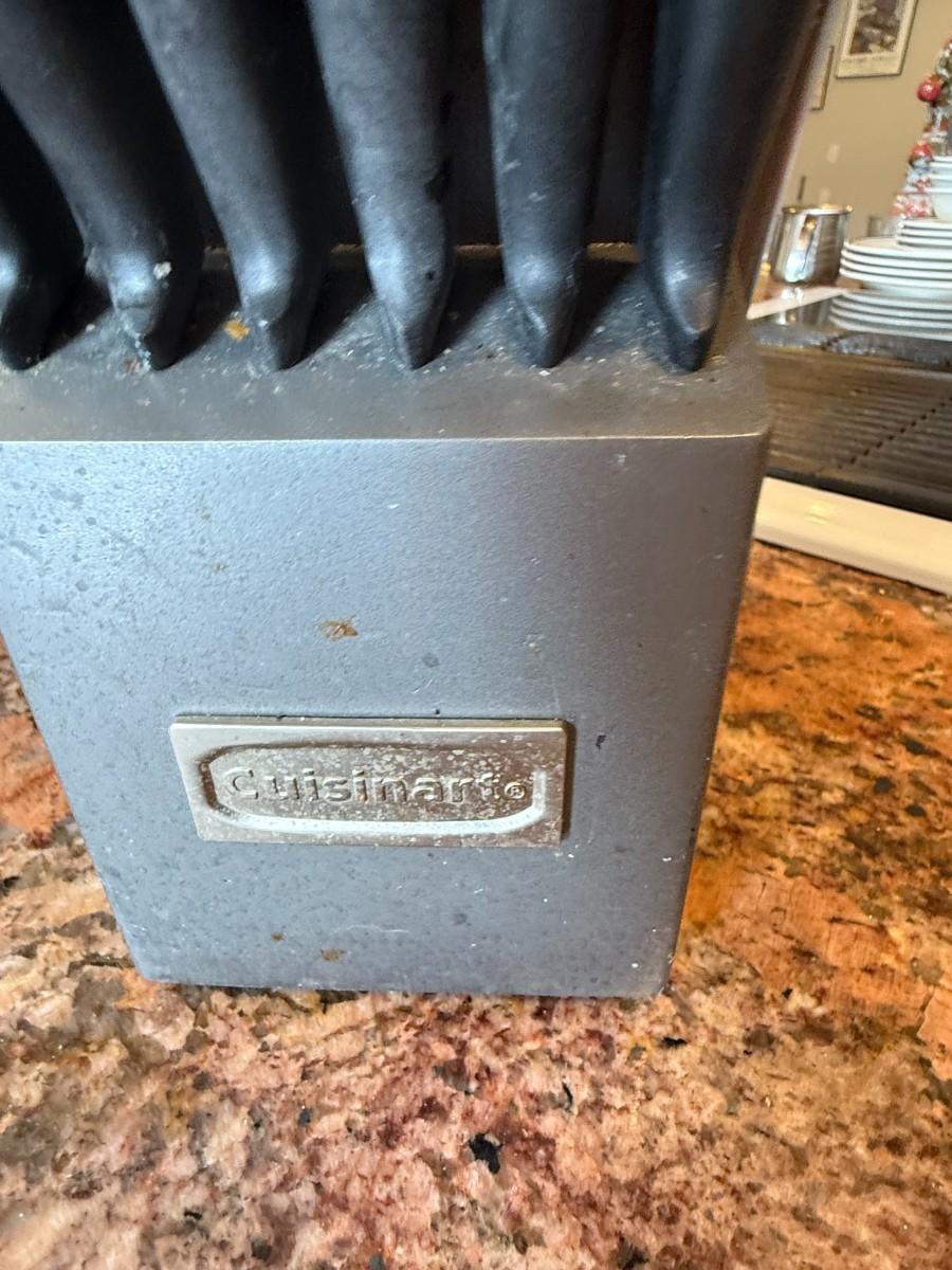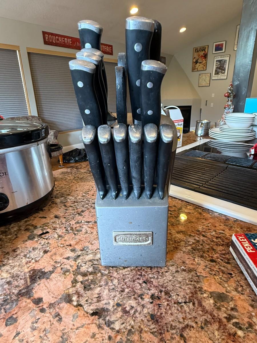 Cuisinart 15-piece knife set in a heavy-duty gray block. Includes steak knives, chef's knife, bread knife, paring knife, and more. Handles show some wear but great for everyday use.