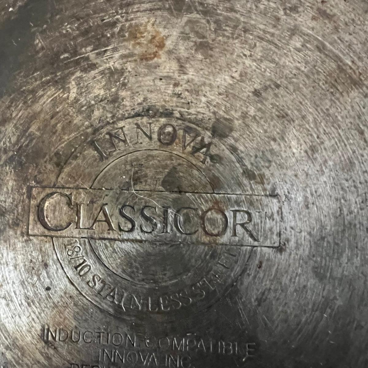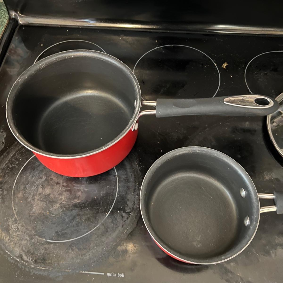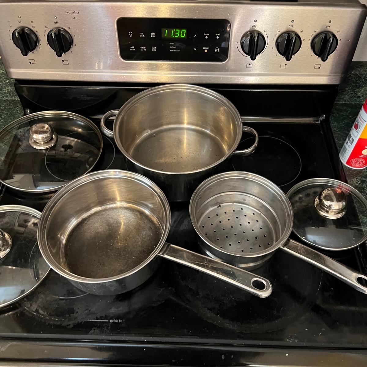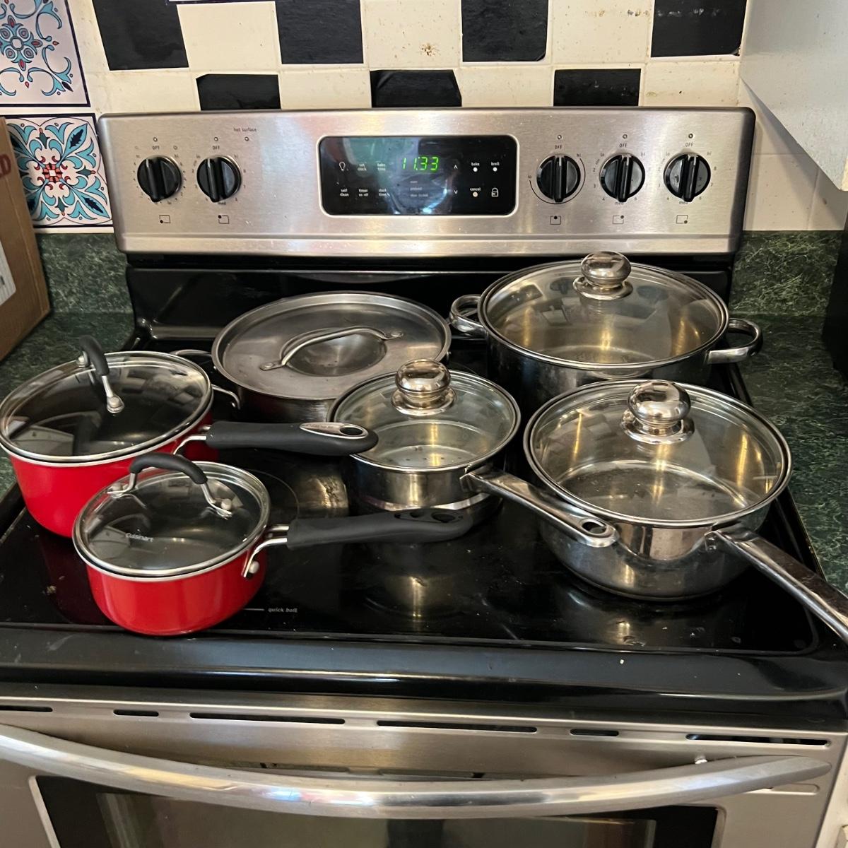 A set of three Classicor stainless pots have lids - the strainer most likely would fit inside a pot that is not included. A pair of red pots are Cuisinart and the large skillet with lid is Emiril and measures 11”x 4”H.