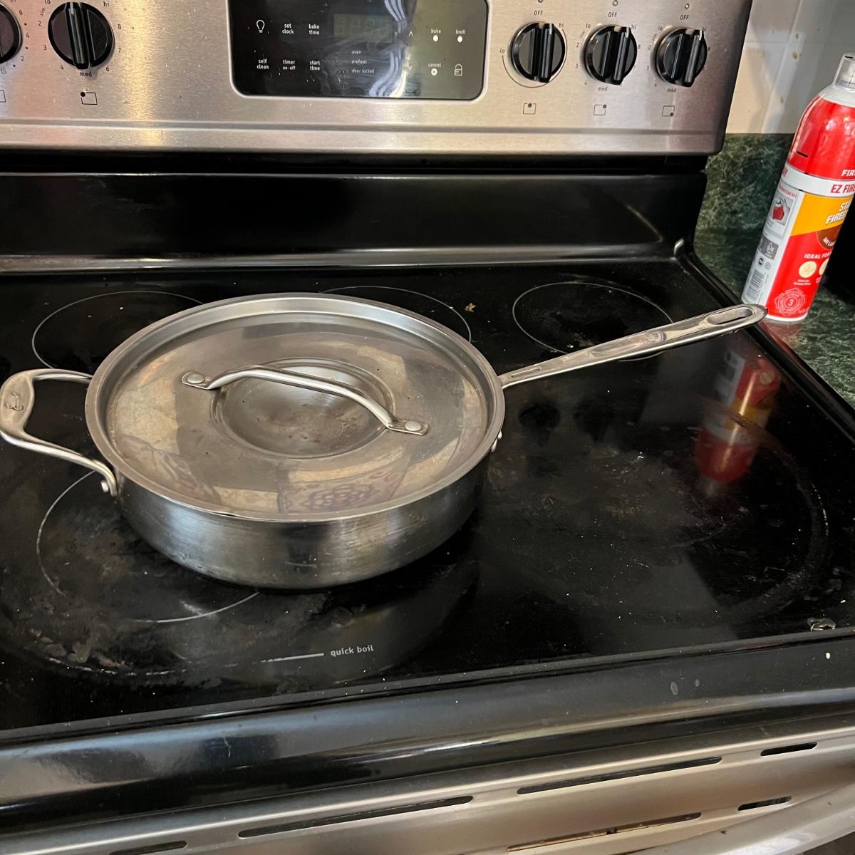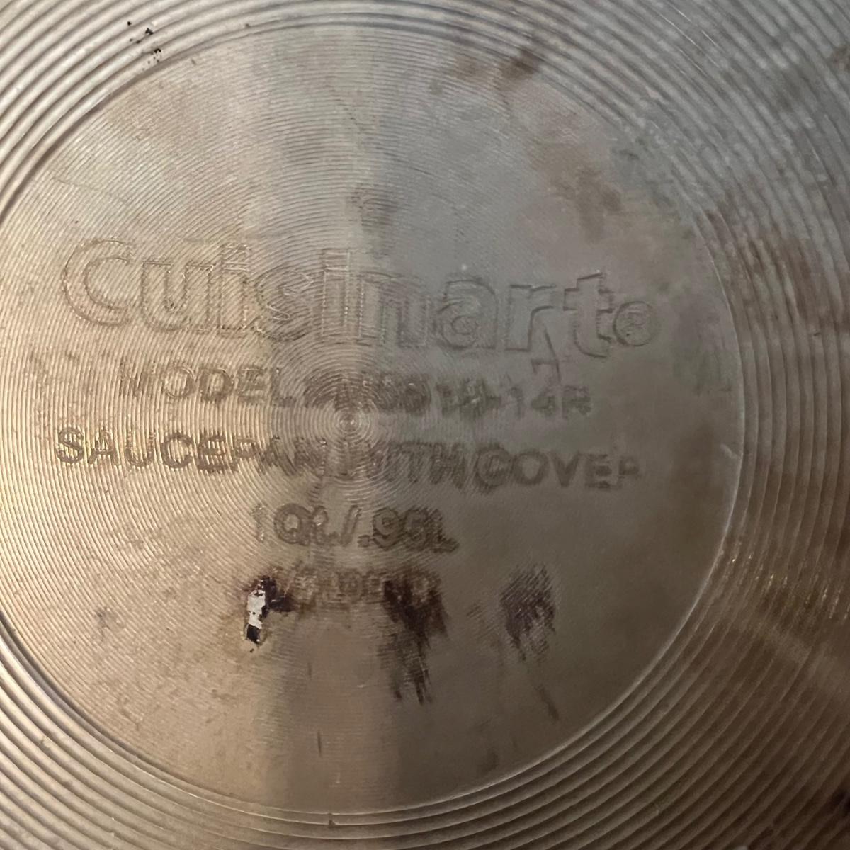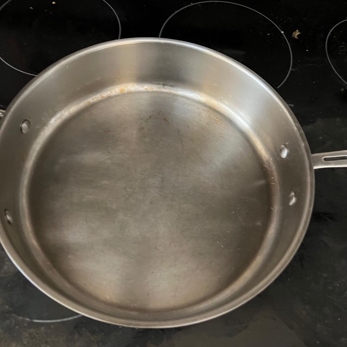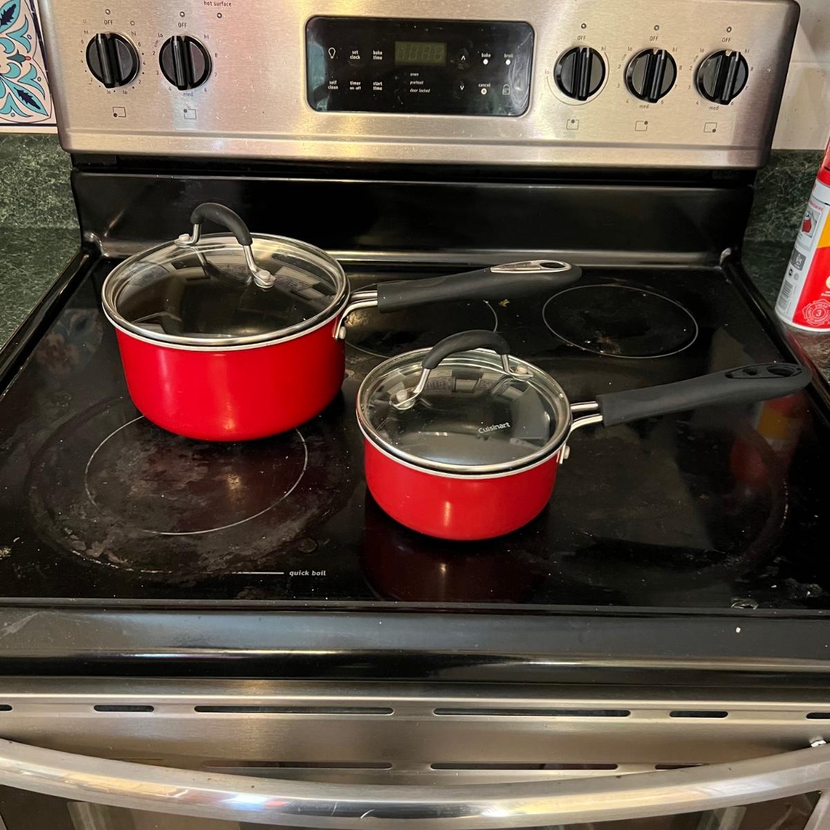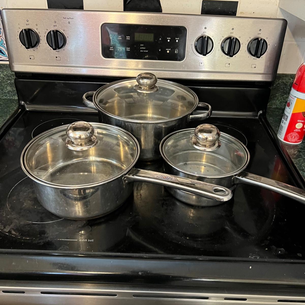 A set of three Classicor stainless pots have lids - the strainer most likely would fit inside a pot that is not included. A pair of red pots are Cuisinart and the large skillet with lid is Emiril and measures 11”x 4”H.