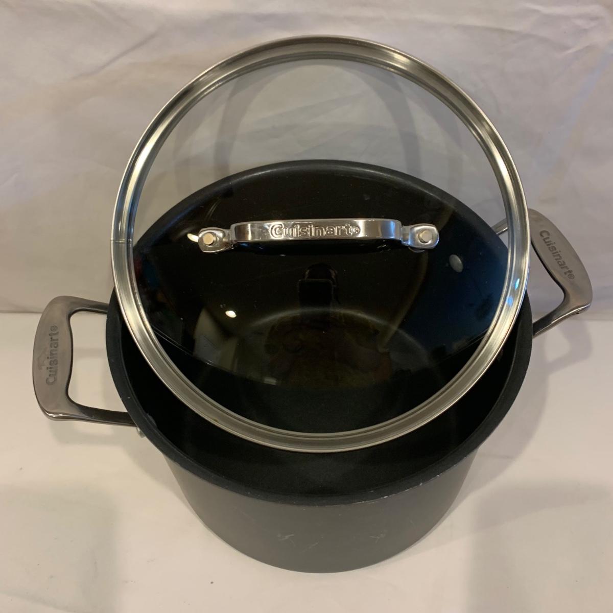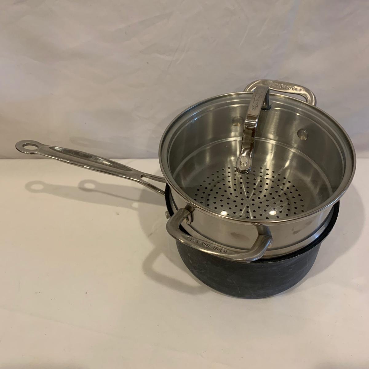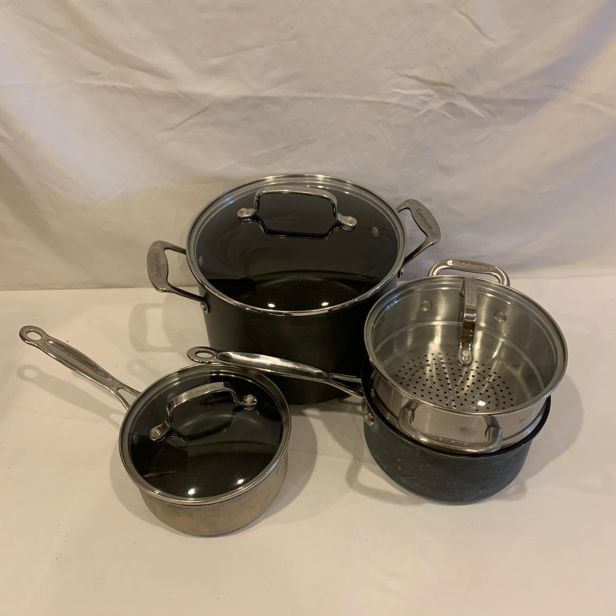 Lot includes two lidded Cuisinart pots, steamer basket, large Cuisinart stock pot, and 12”D cast iron pan. Stock pot measures, 10”D x 7”H. All items show gentle signs of use. Please see photos for more details. Local pickup only.