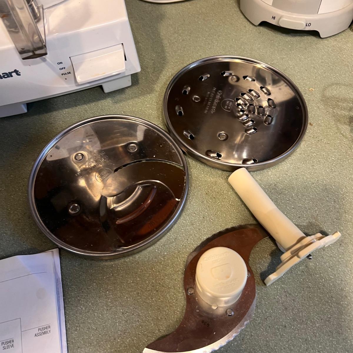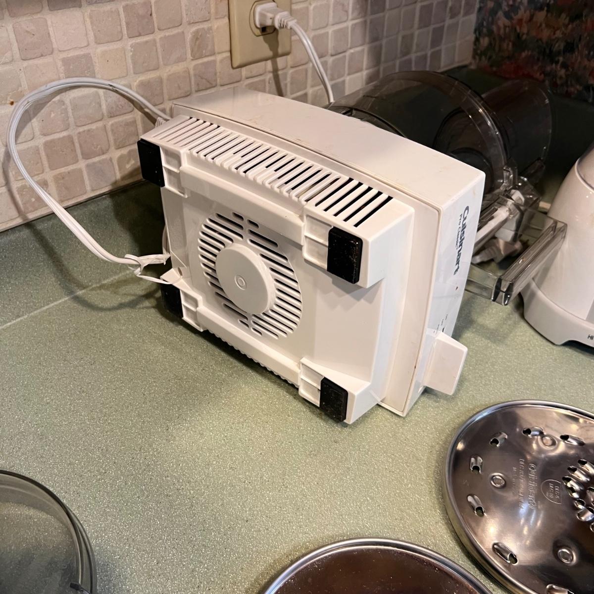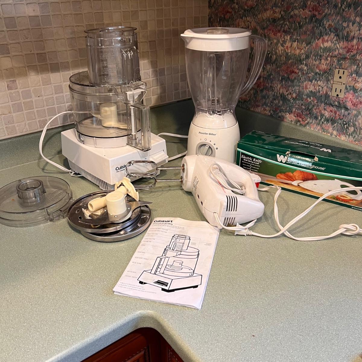 Four kitchen appliances in this lot. The Cuisinart blender comes with different attachments; we cannot guarantee that all original pieces are present; it measures 9” x 7” x 14”H.