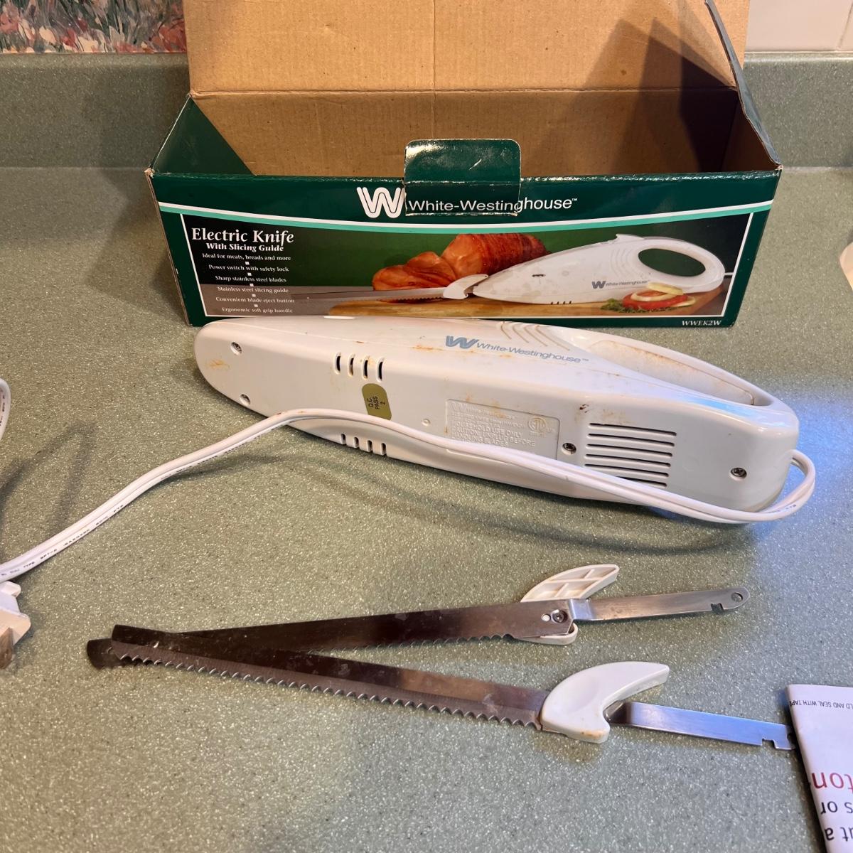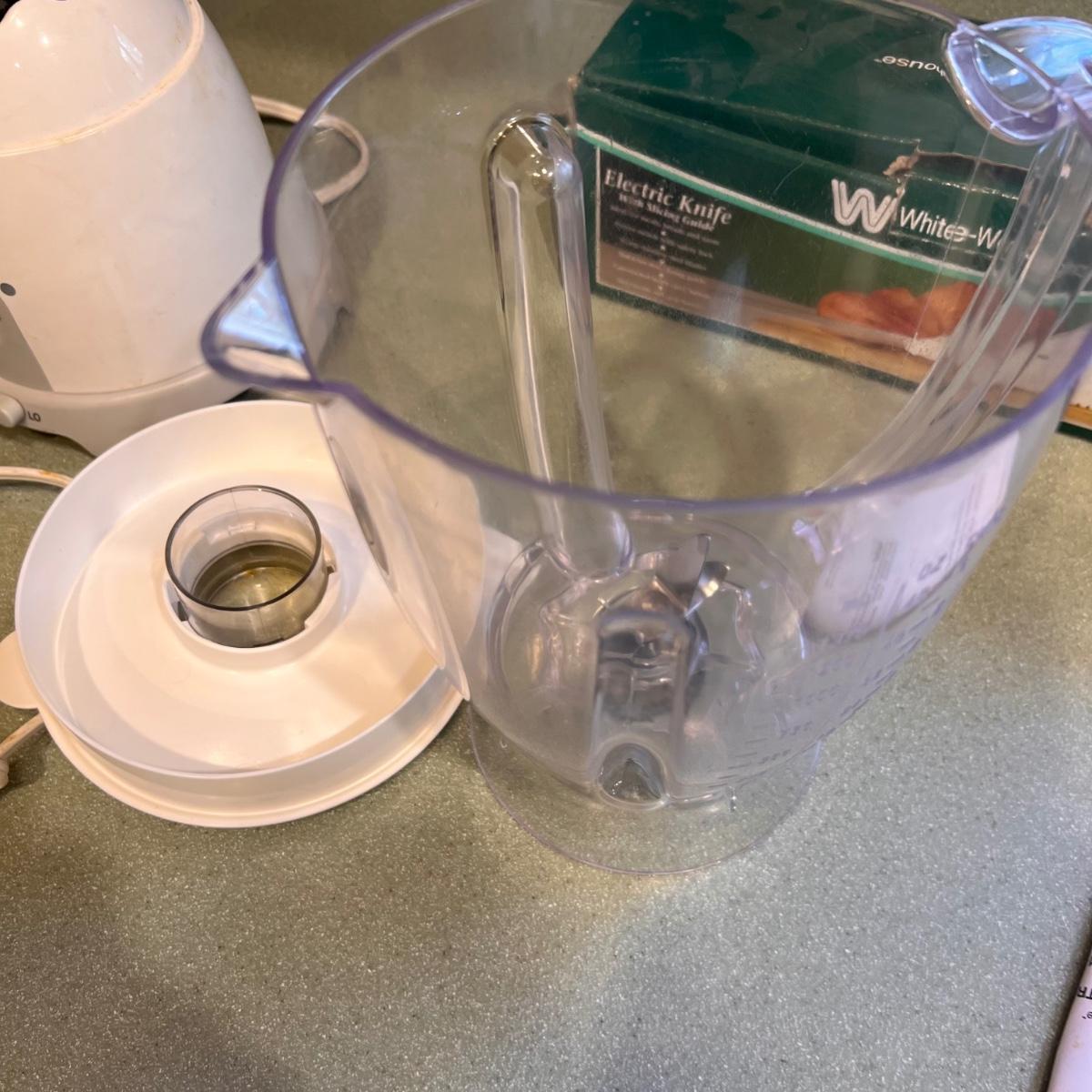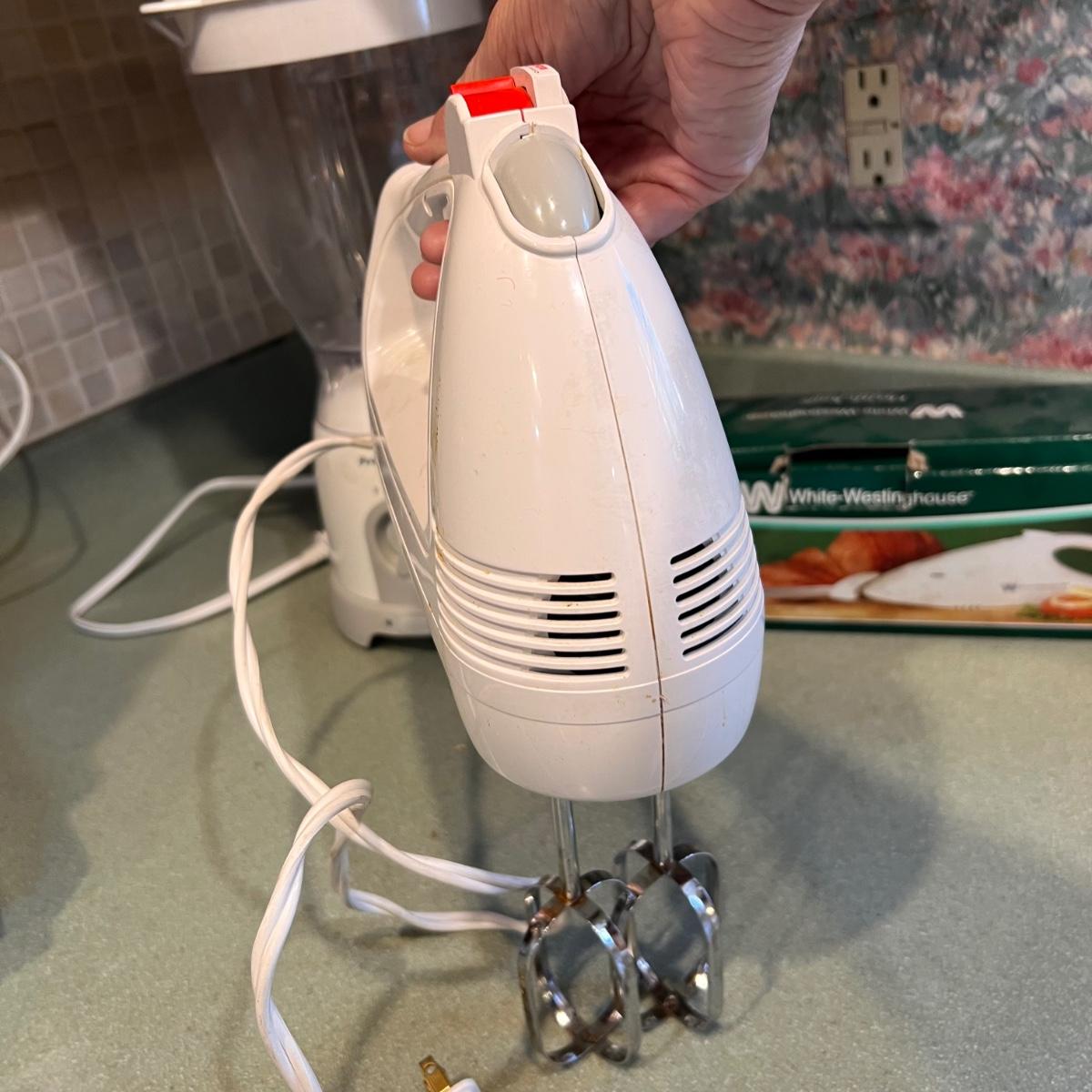 Four kitchen appliances in this lot. The Cuisinart blender comes with different attachments; we cannot guarantee that all original pieces are present; it measures 9” x 7” x 14”H.