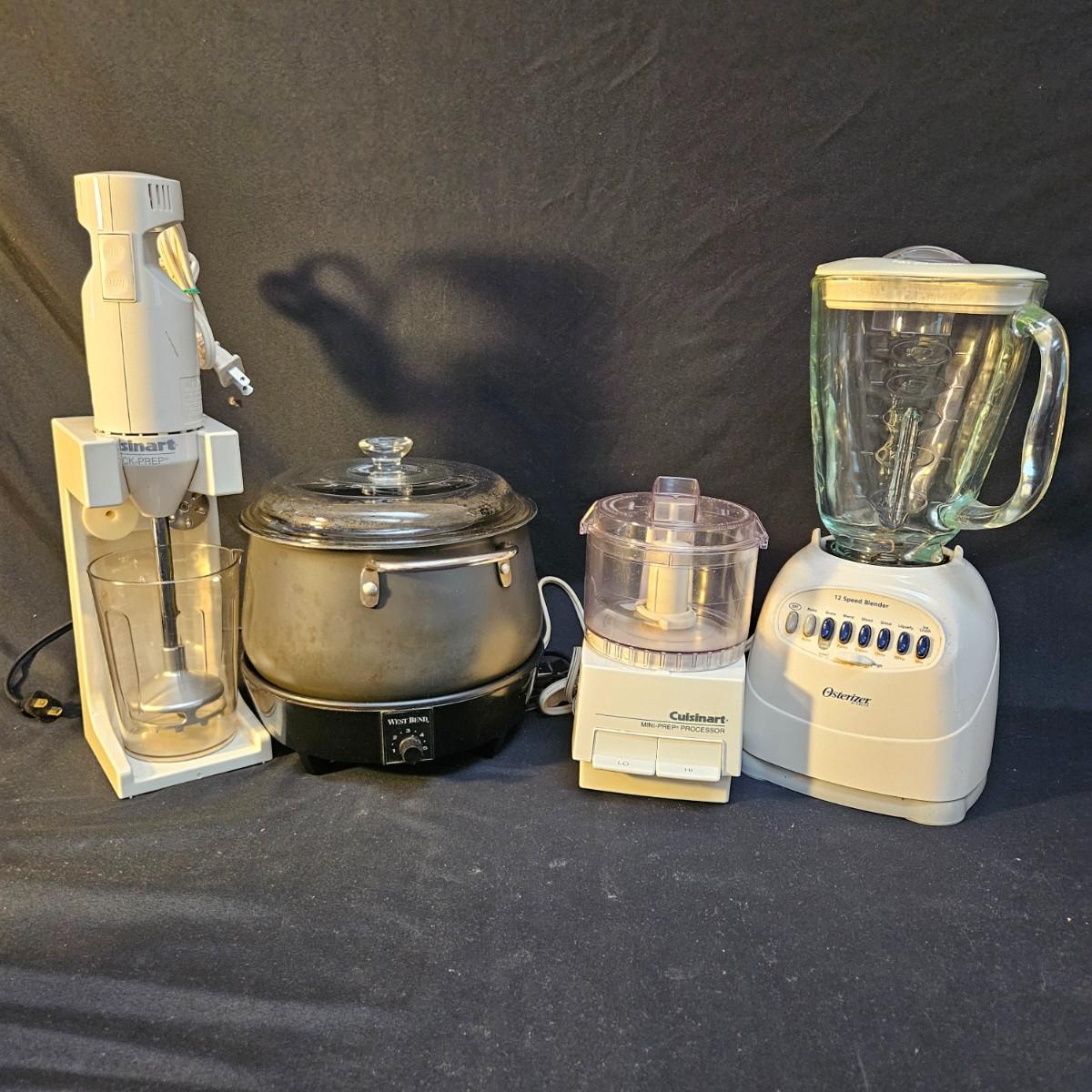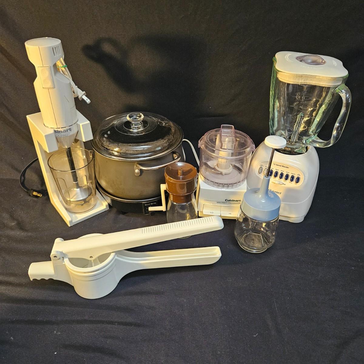 An assortment of small kitchen appliances that all powered on when plugged in. Includes a Cuisinart Quick-Prep, a Westbend slow cooker, a Cuisinart mini prep processor and a Osterizer blender. Also inches a quick chop and a small grinder. The quick-prep measures approximately 4.5" x 5" x 16"H. Shipping available