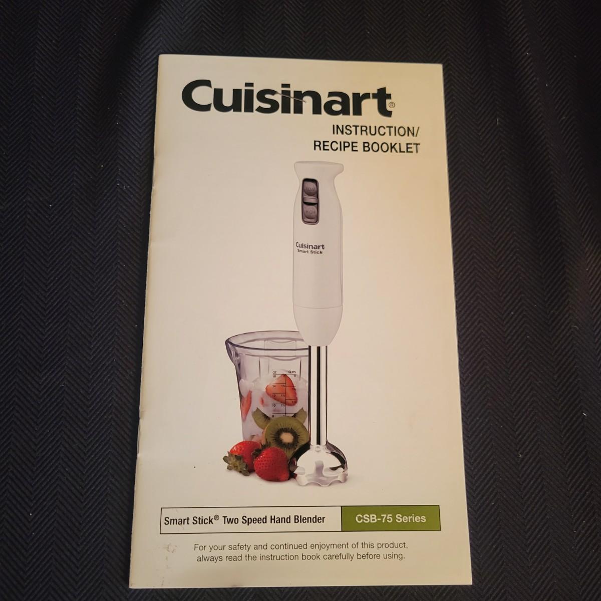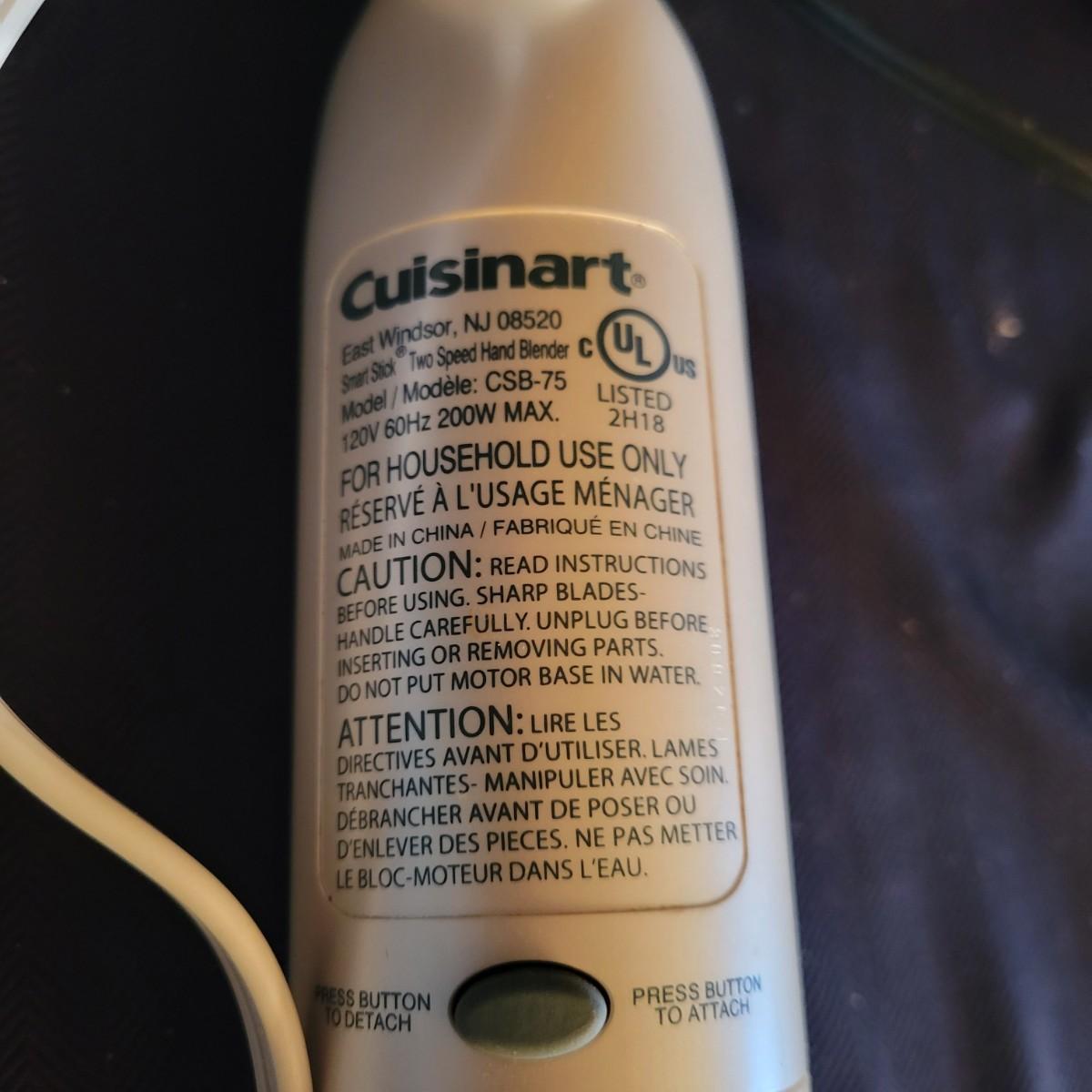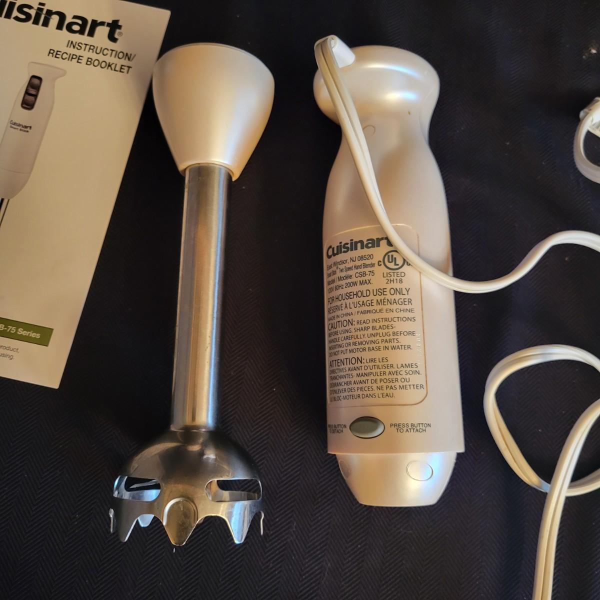 A Cuisinart Smart Stick and a ChefsChoice electric sharpener that powered on when plugged in. The knife sharpener measures approximately 8" x 4" x 4.5"H. The Cuisinart Smart Stick includes a measuring cup and recipe booklet. Shipping available