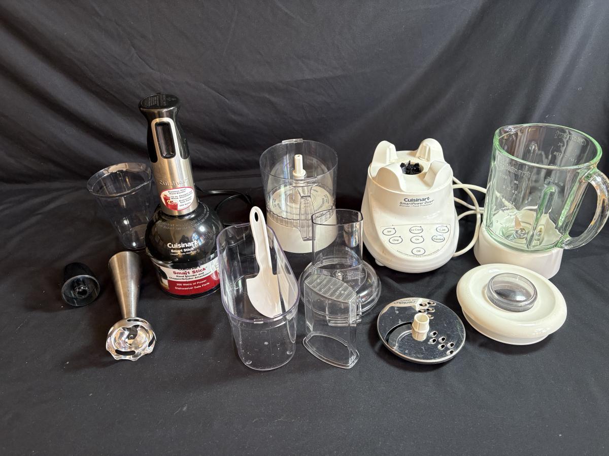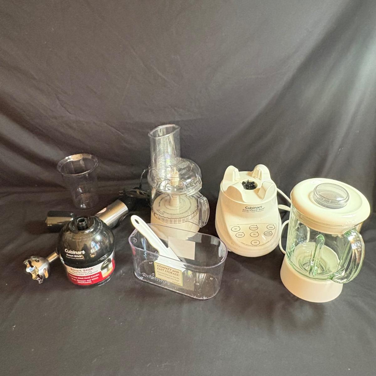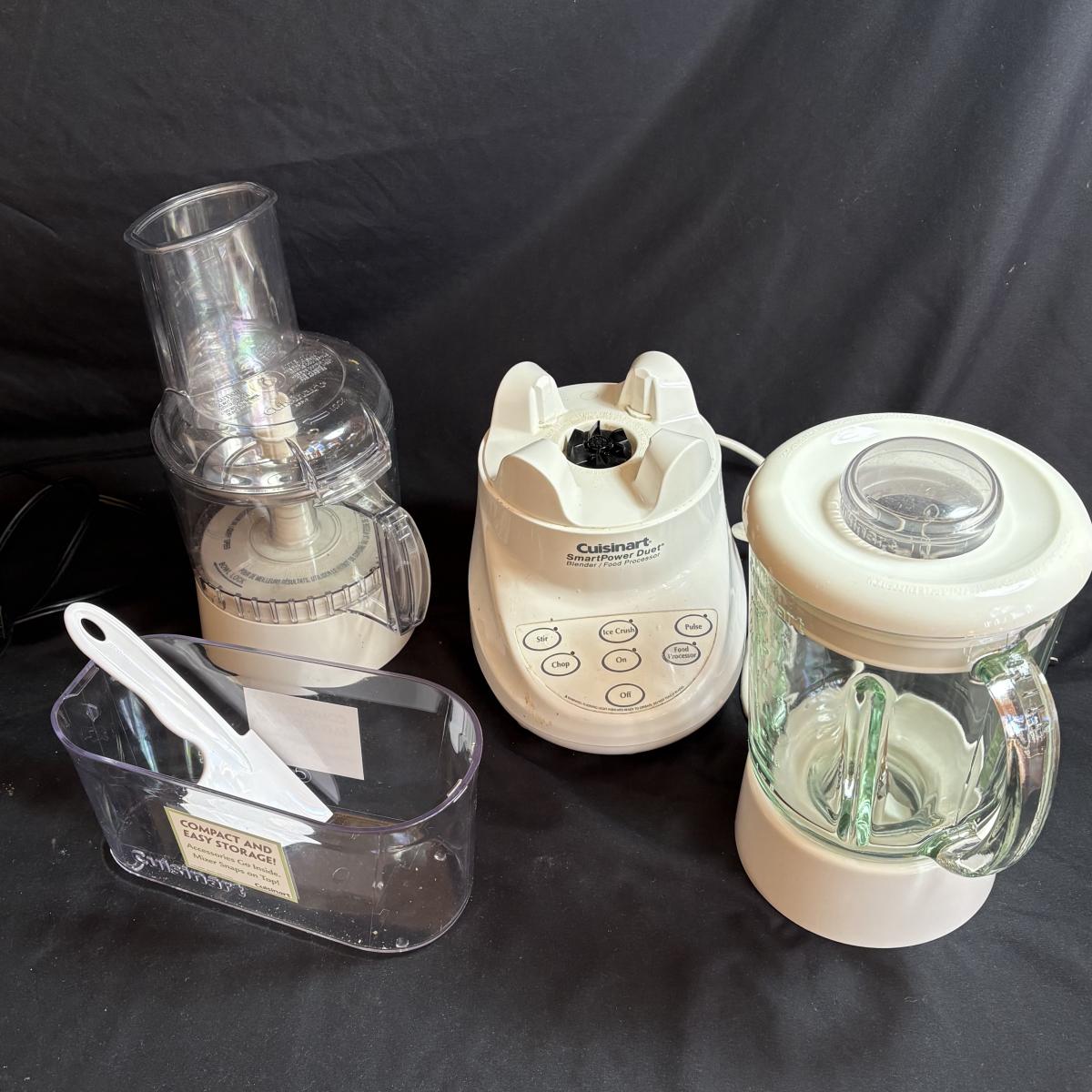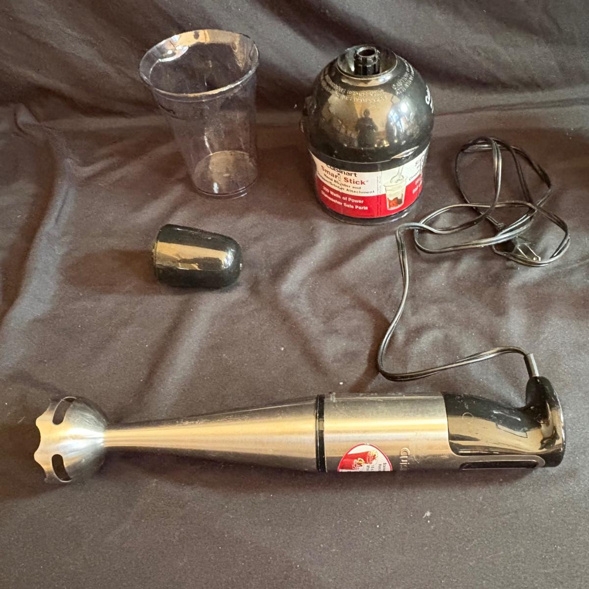 Multi-use kitchen tools all powered up when plugged in. Smart Stick immersion blender is missing whisk attachment. Food processor has the shred/slice blade but is missing chopping blade. Blender unit is glass and has a five cup capacity. Two-cup measuring cup is 4.5”D x 5.5”H. Local Pickup Only