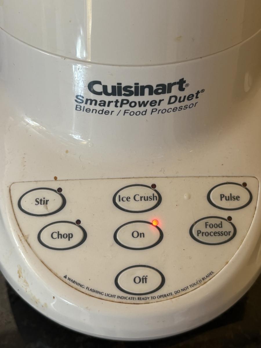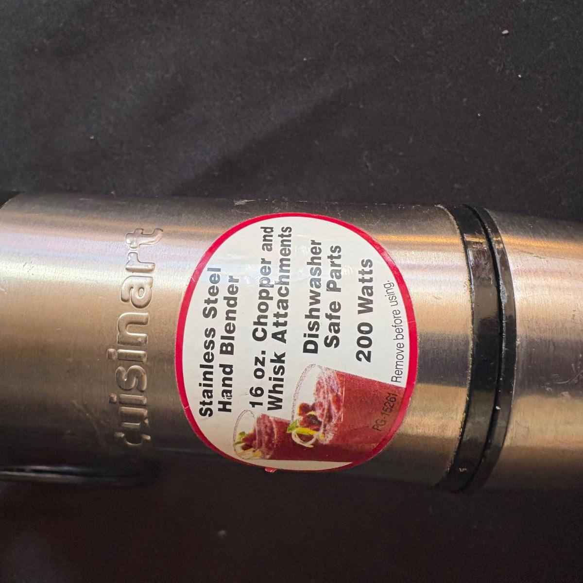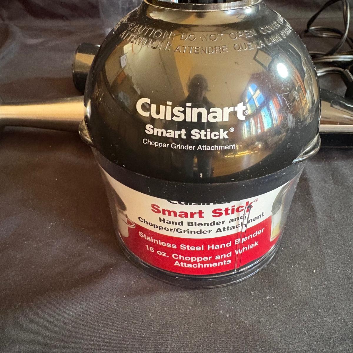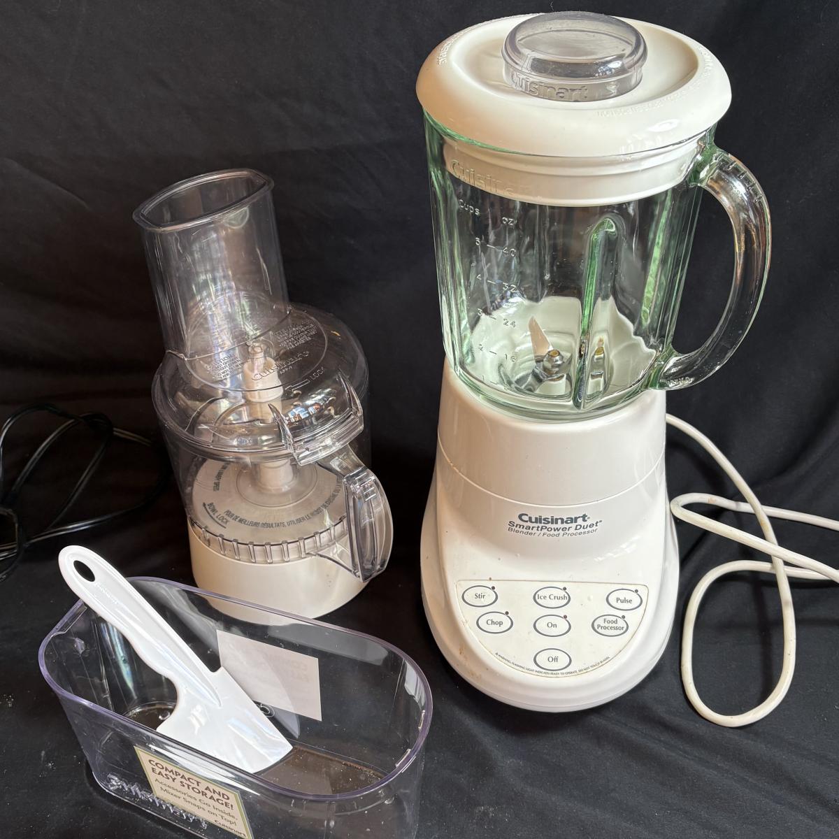 Multi-use kitchen tools all powered up when plugged in. Smart Stick immersion blender is missing whisk attachment. Food processor has the shred/slice blade but is missing chopping blade. Blender unit is glass and has a five cup capacity. Two-cup measuring cup is 4.5”D x 5.5”H. Local Pickup Only