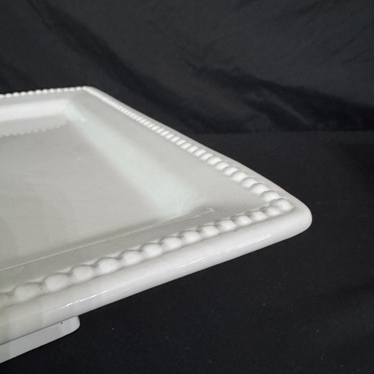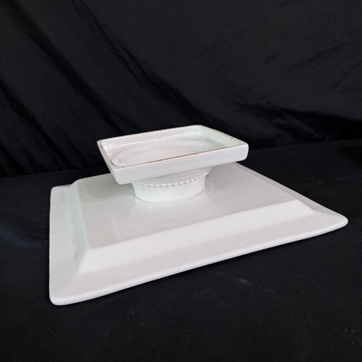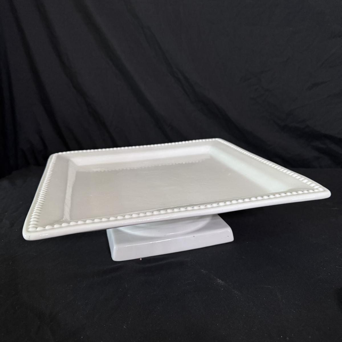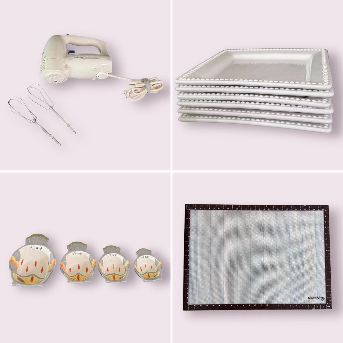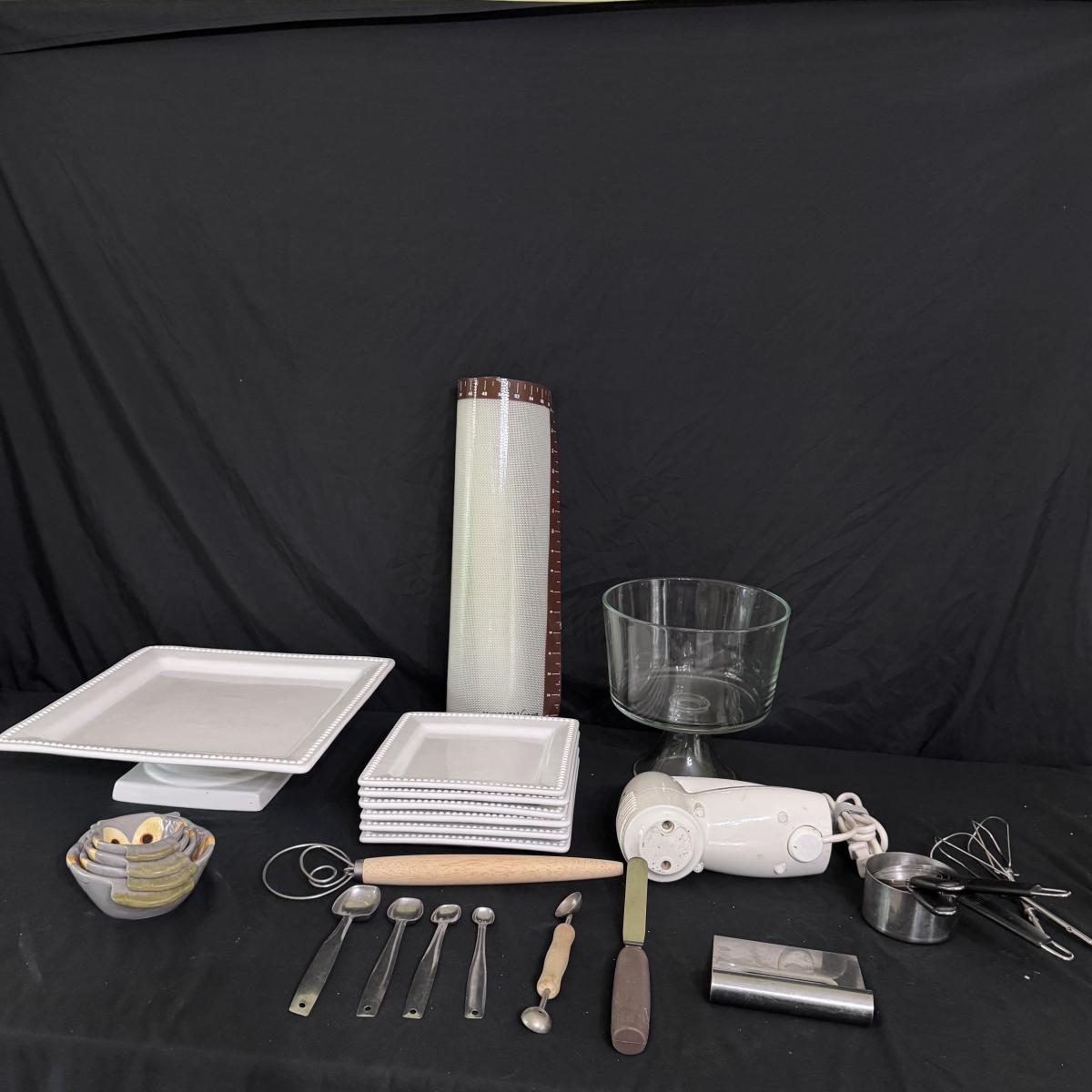 Lot includes one Real Home white ceramic serving tray with stand, six Real Home plates that match the tray, four stainless measuring spoons, one glass pedestal bowl, and four Pier 1 ceramic owl measuring cups. You’ll also find one stainless bench scraper, more measuring cups, a Cuisinart SmartPower 3-speed electronic hand mixer, and more. Mixer powers on when plugged in. See pictures for more details on all items. The largest item is the Real Home serving tray with stand that measures 13” square x 4”H. Shipping available.