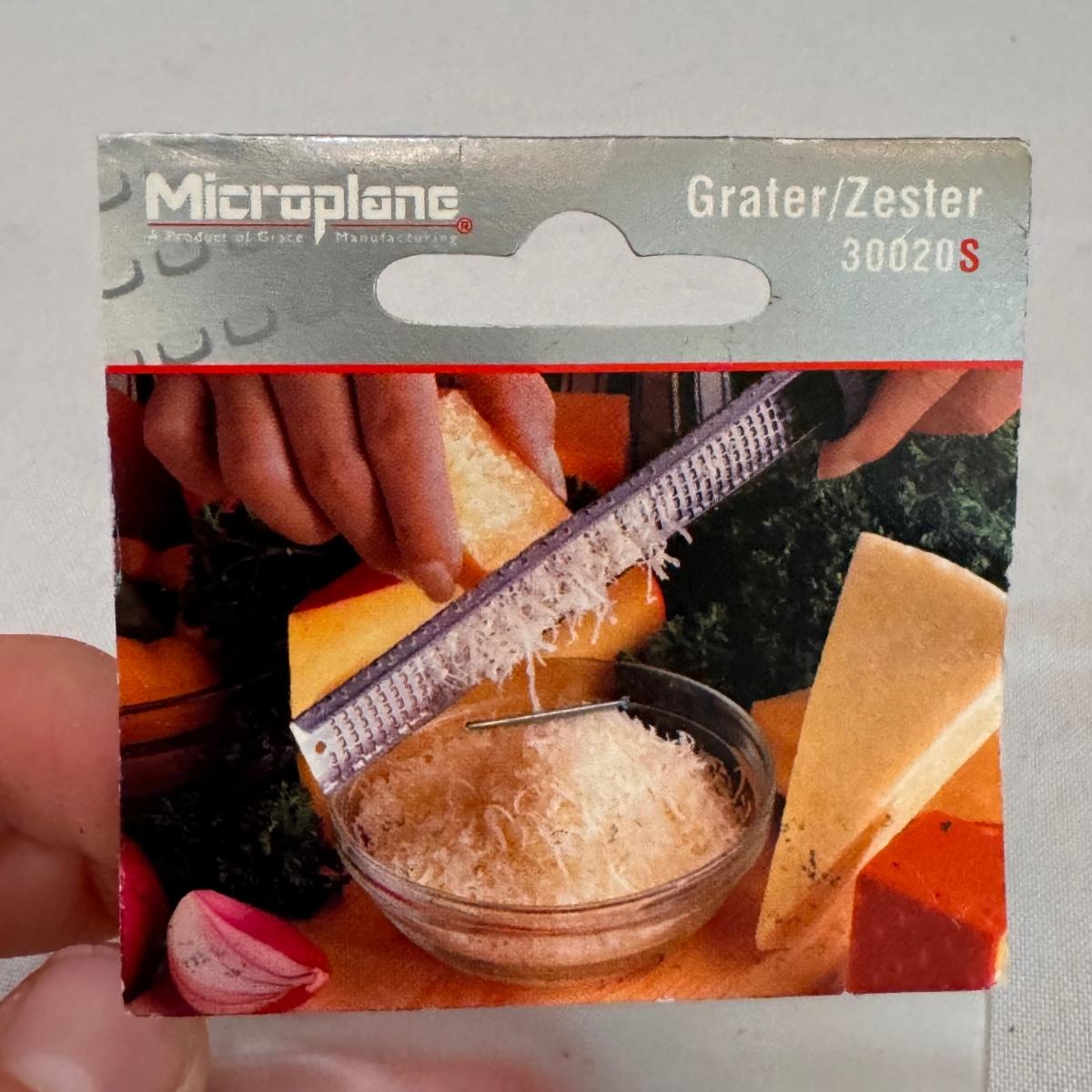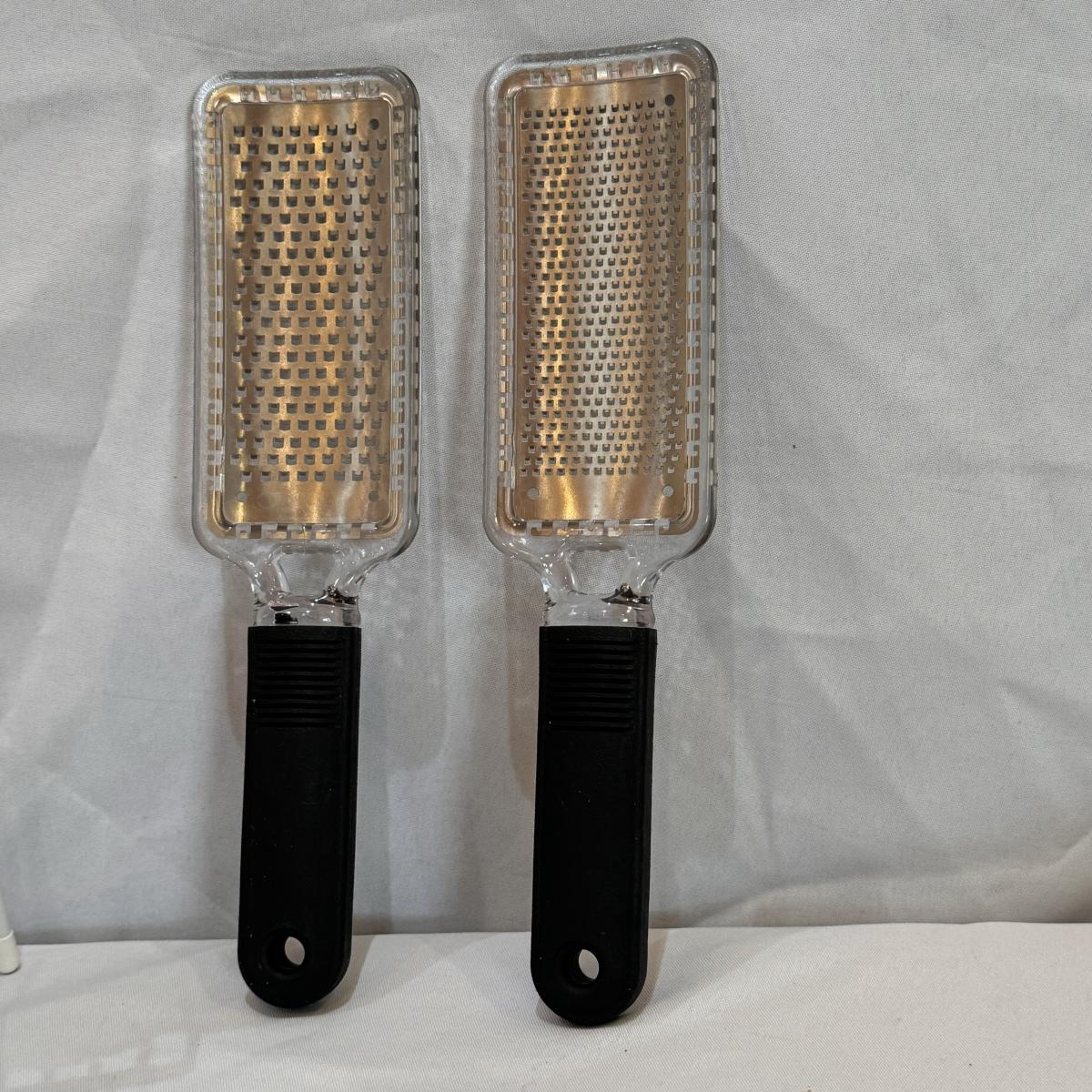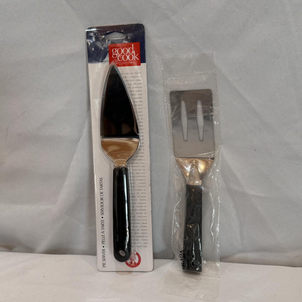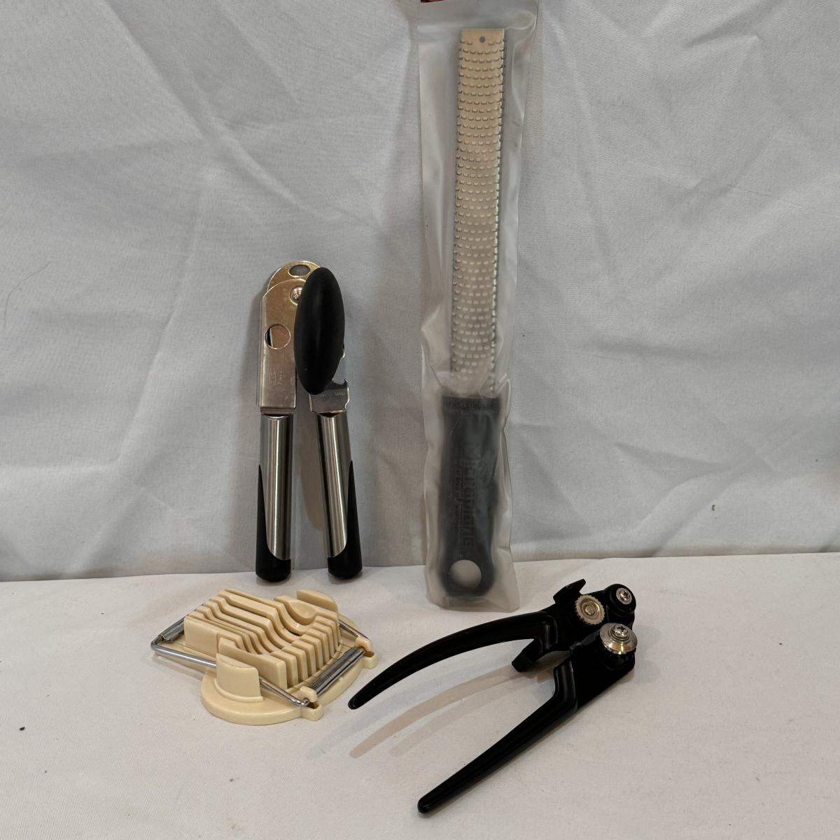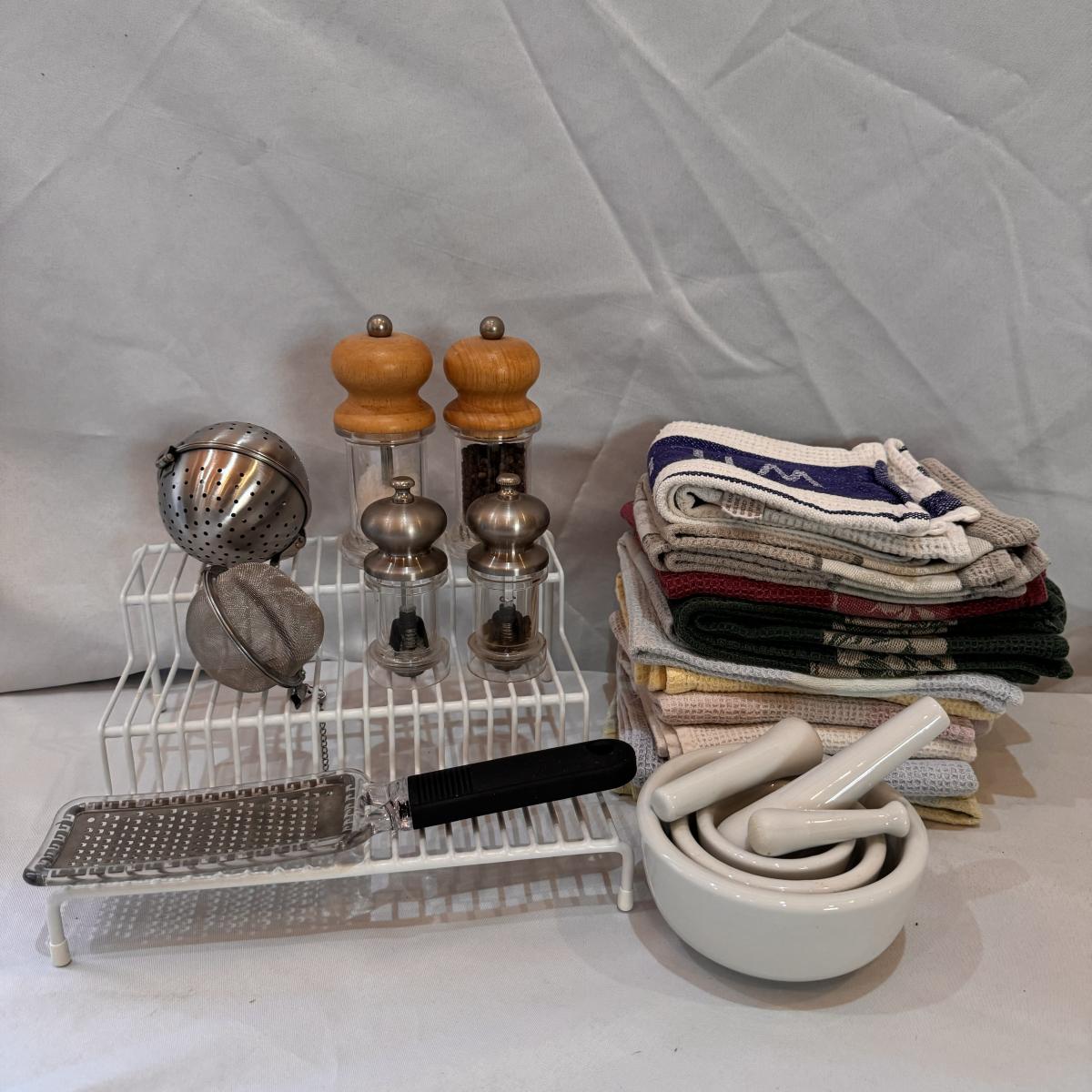This lot includes one ice tray, one spice rack with three shelves, one magnetic blade guard from My Perfect Kitchen, two measuring tools by KitchenArt, one pair of Oxo scissors, one pair of Ergo Chef scissors, five silicone lids, two reusable wrap-n-mats, one set of salt and pepper shakers from Cole & Mason, one set of smaller salt and pepper shakers from unknown brand, three mortar & pestles in different sizes, two tea steepers, two fine graters from Microplane, one grater/seater from Microplane, one cheese slicer from Bellemain, one ice cream scoop from Zeroll, one can opener from Oxo, one additional can opener with no brand listed, one spatula from Rada, one pie server from Good Cook, one spatula from Calphalon, one cheese slicer from Cuisinart, one egg cutter, and eleven hand towels. The ice tray measures 13.5” x 2”H