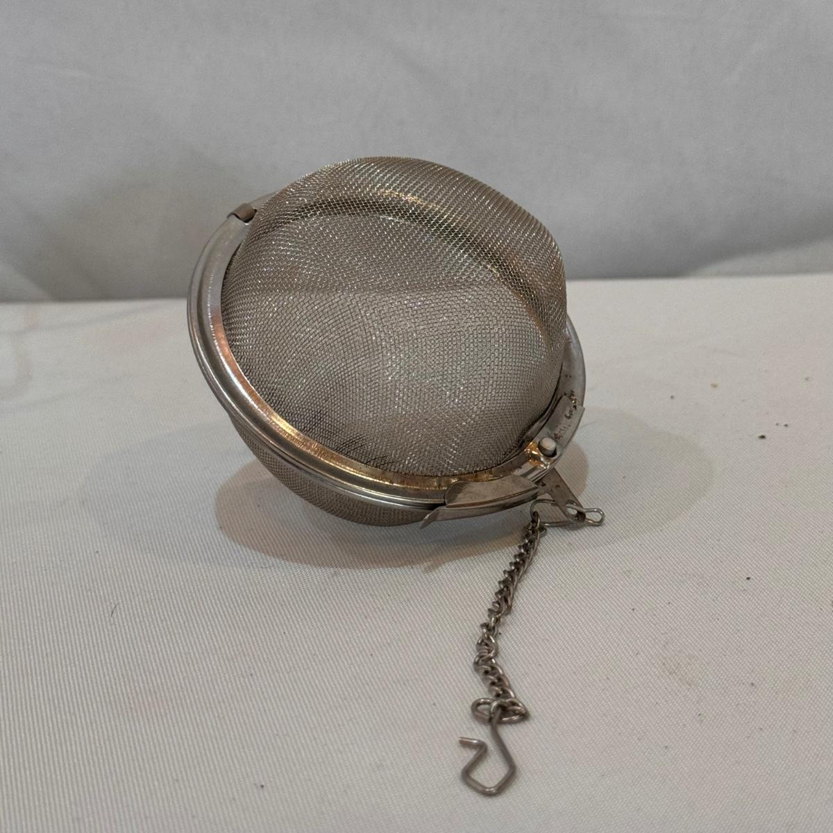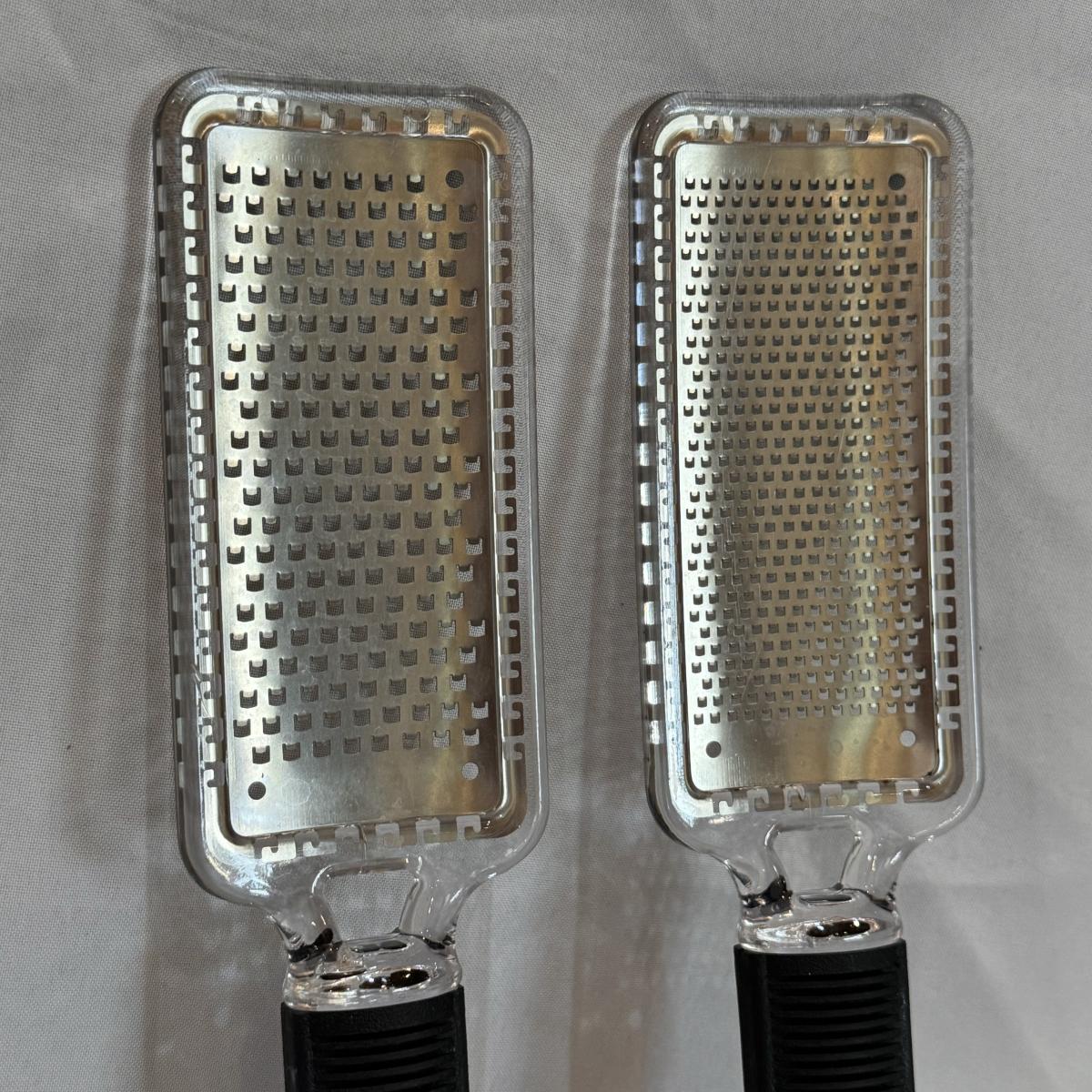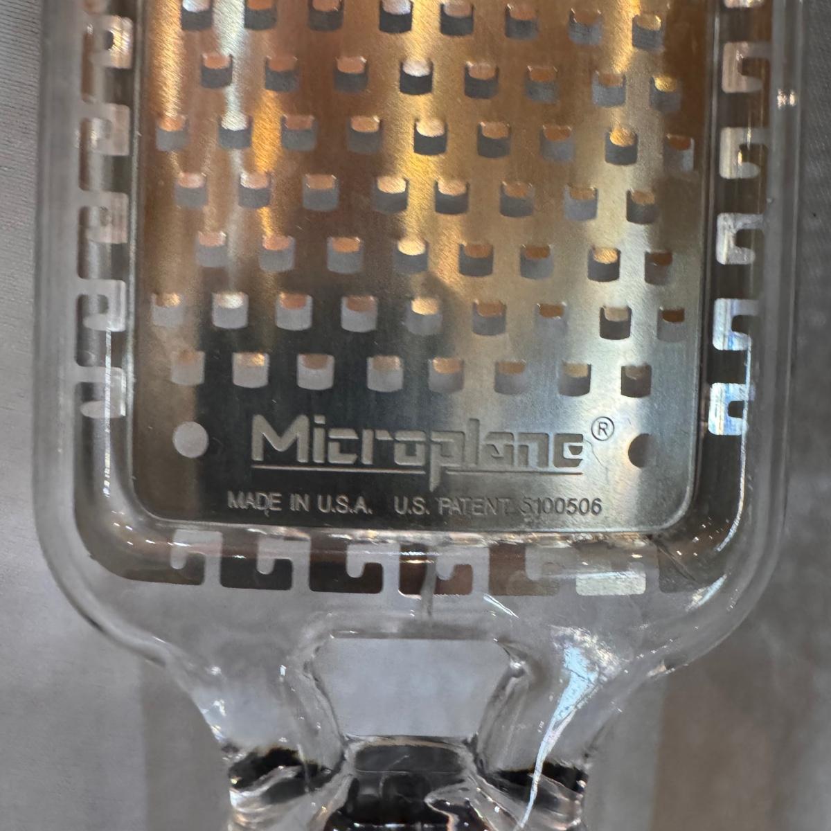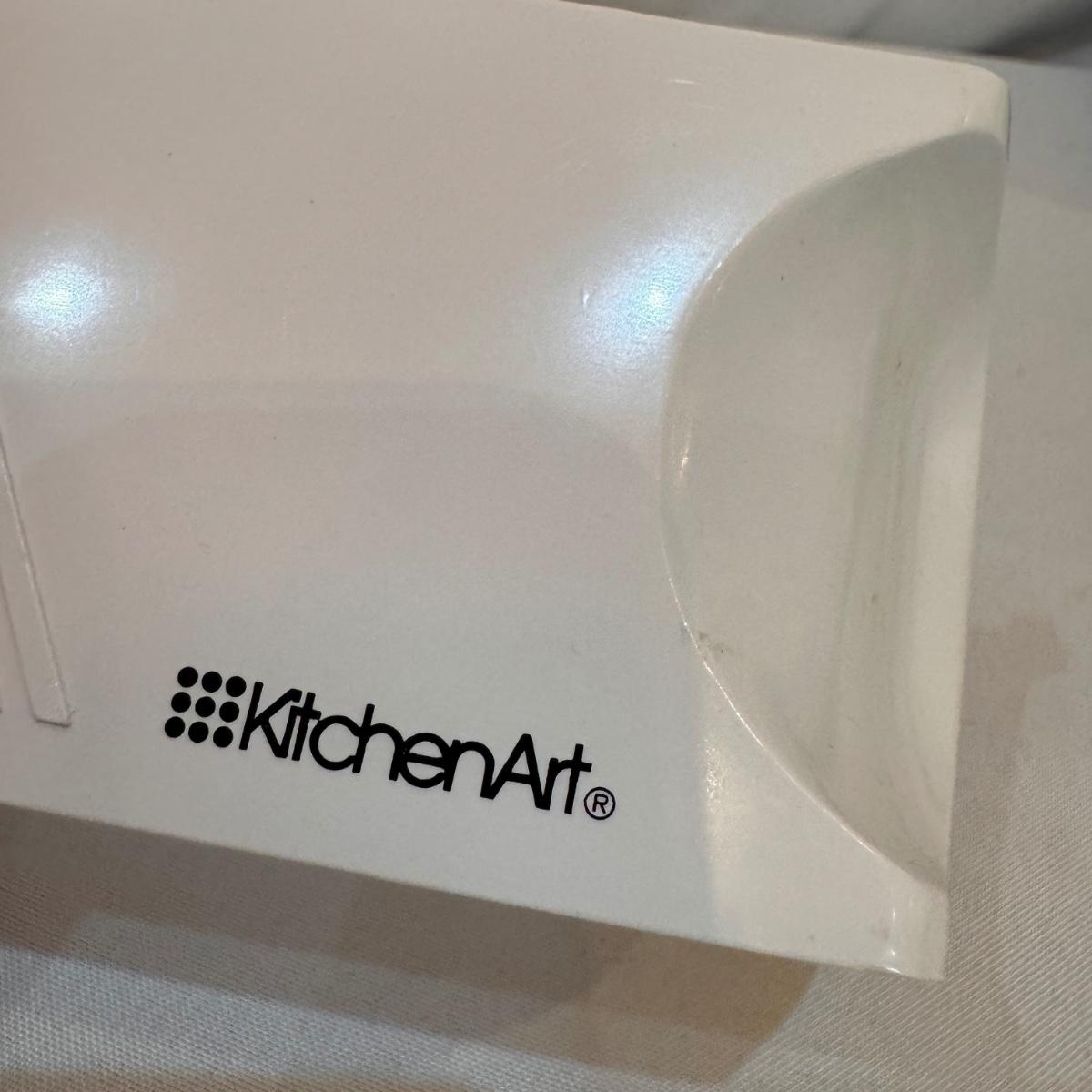 This lot includes one ice tray, one spice rack with three shelves, one magnetic blade guard from My Perfect Kitchen, two measuring tools by KitchenArt, one pair of Oxo scissors, one pair of Ergo Chef scissors, five silicone lids, two reusable wrap-n-mats, one set of salt and pepper shakers from Cole & Mason, one set of smaller salt and pepper shakers from unknown brand, three mortar & pestles in different sizes, two tea steepers, two fine graters from Microplane, one grater/seater from Microplane, one cheese slicer from Bellemain, one ice cream scoop from Zeroll, one can opener from Oxo, one additional can opener with no brand listed, one spatula from Rada, one pie server from Good Cook, one spatula from Calphalon, one cheese slicer from Cuisinart, one egg cutter, and eleven hand towels. The ice tray measures 13.5” x 2”H
