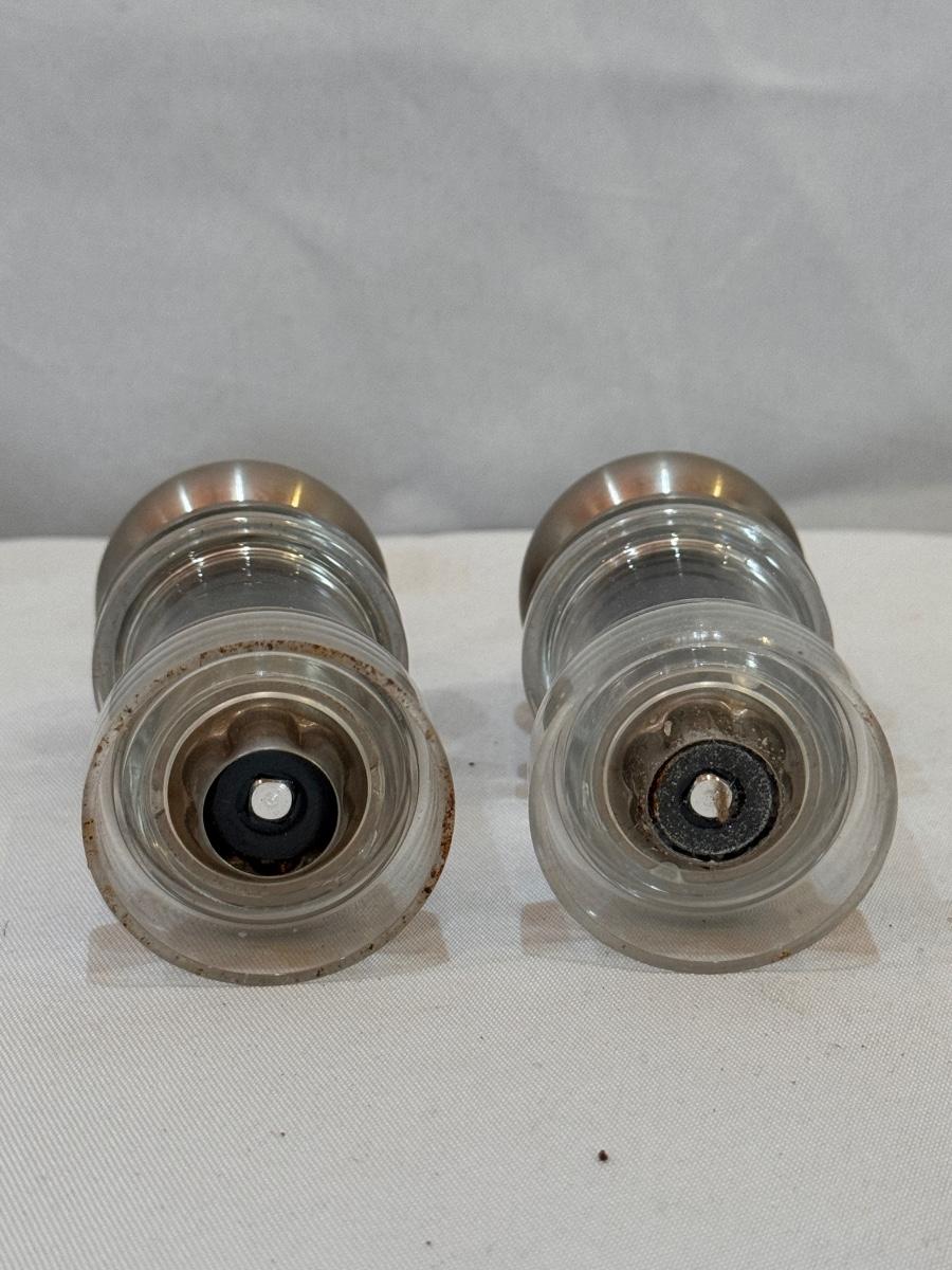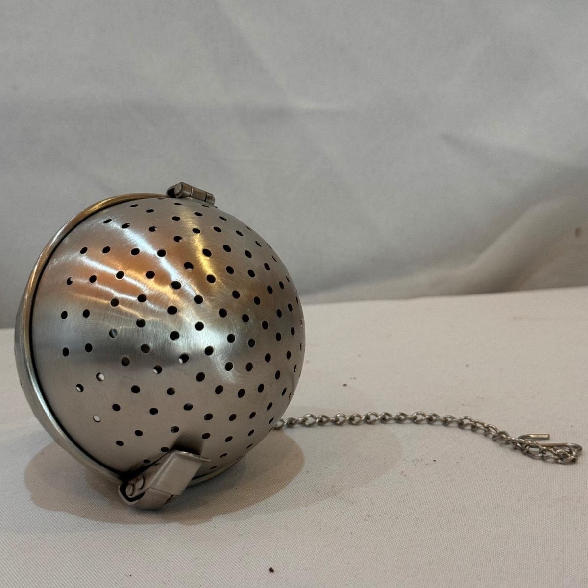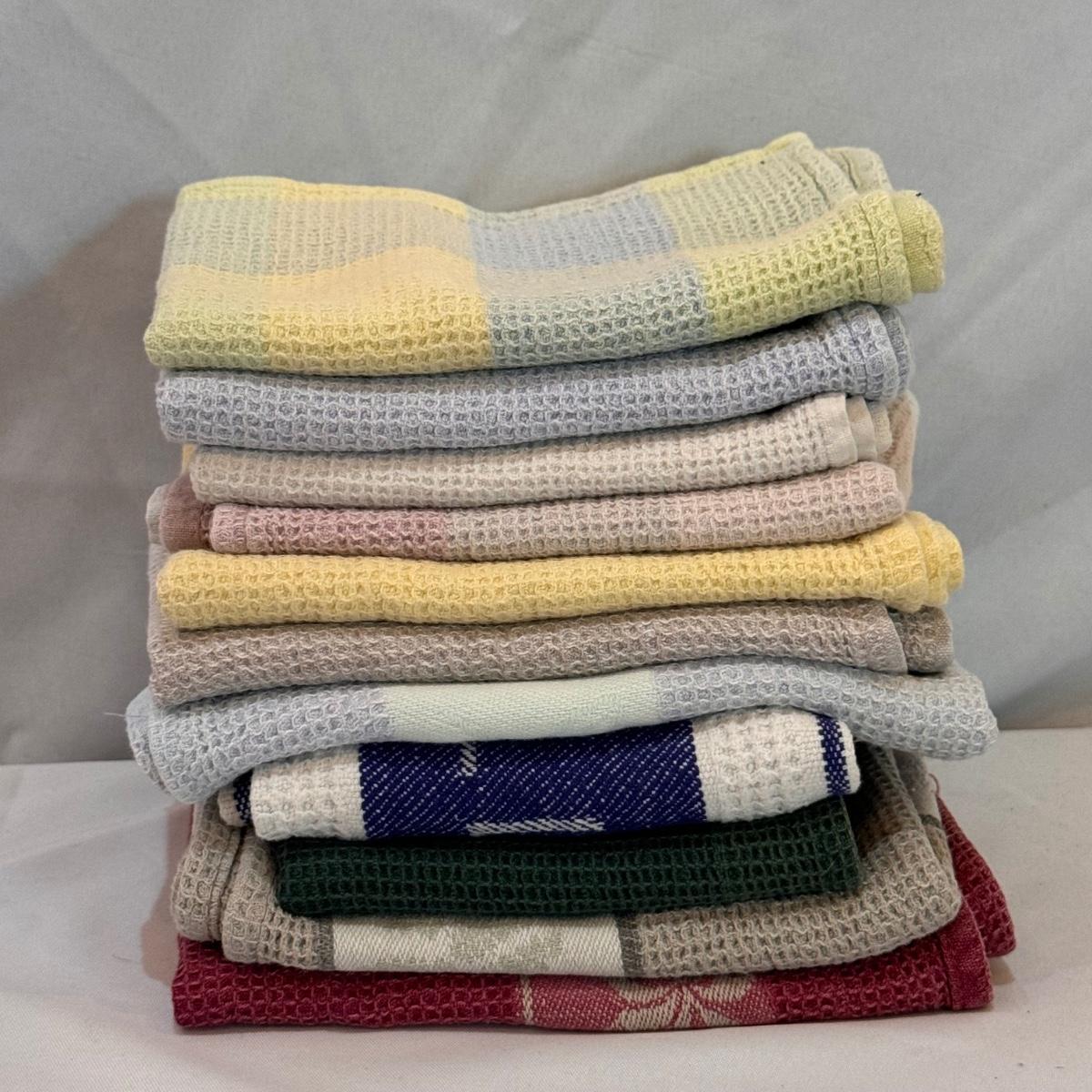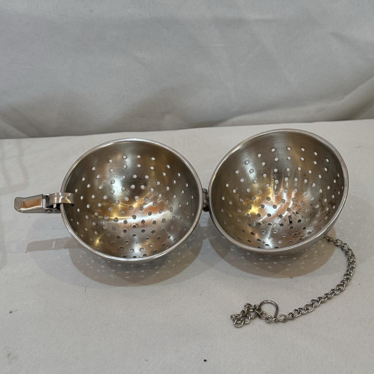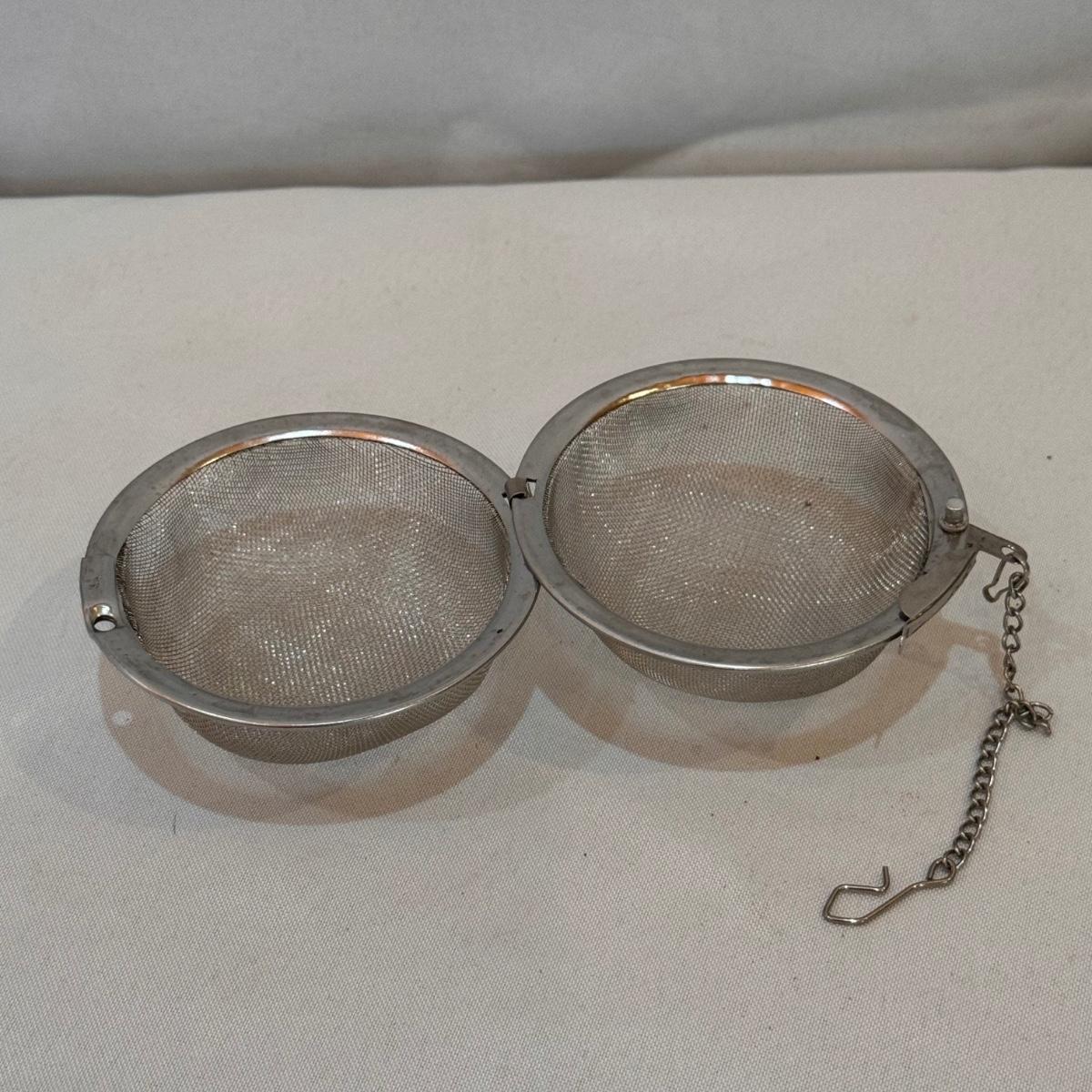 This lot includes one ice tray, one spice rack with three shelves, one magnetic blade guard from My Perfect Kitchen, two measuring tools by KitchenArt, one pair of Oxo scissors, one pair of Ergo Chef scissors, five silicone lids, two reusable wrap-n-mats, one set of salt and pepper shakers from Cole & Mason, one set of smaller salt and pepper shakers from unknown brand, three mortar & pestles in different sizes, two tea steepers, two fine graters from Microplane, one grater/seater from Microplane, one cheese slicer from Bellemain, one ice cream scoop from Zeroll, one can opener from Oxo, one additional can opener with no brand listed, one spatula from Rada, one pie server from Good Cook, one spatula from Calphalon, one cheese slicer from Cuisinart, one egg cutter, and eleven hand towels. The ice tray measures 13.5” x 2”H