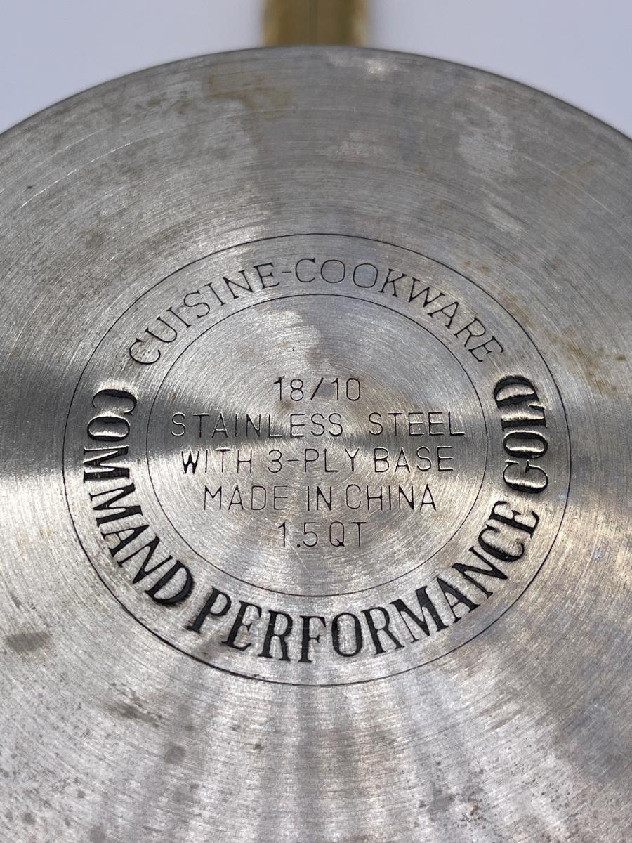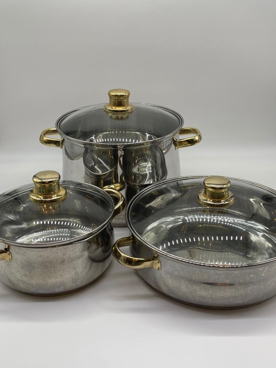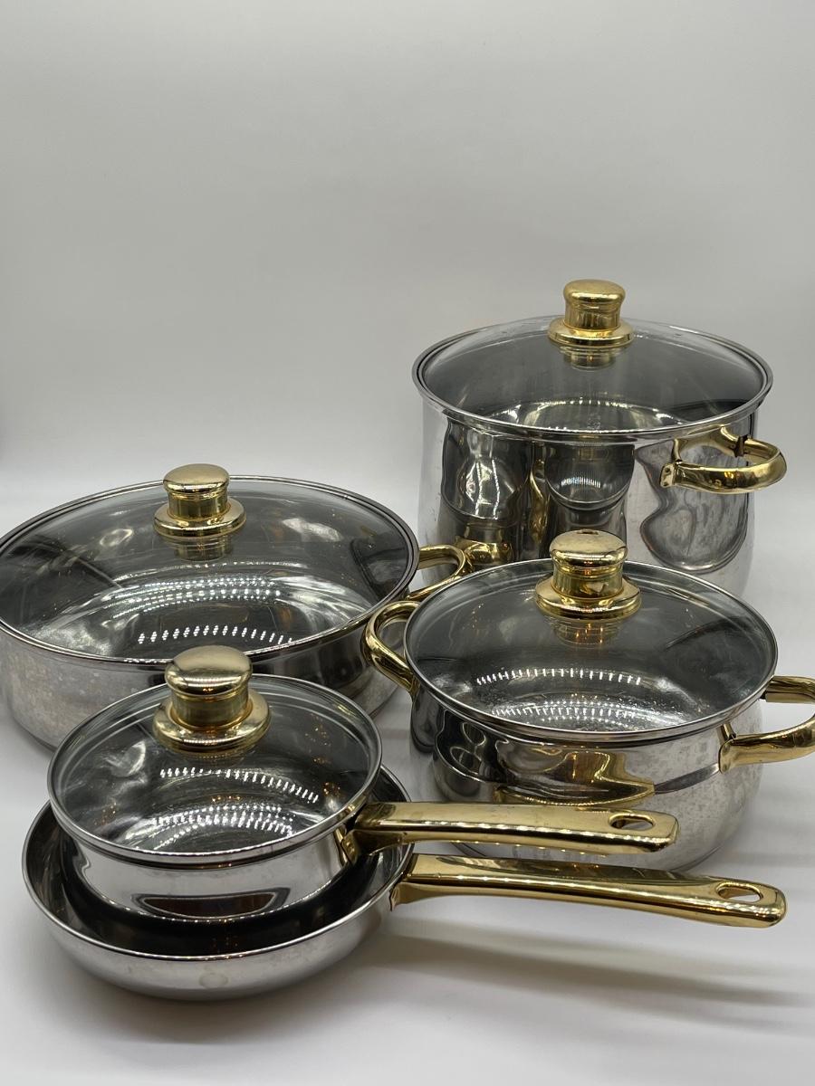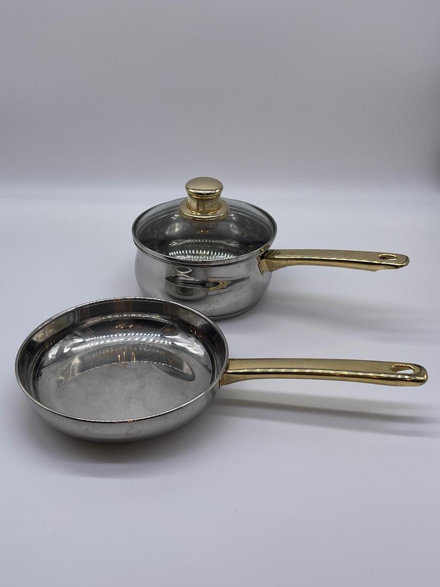 Includes: 8” Frying Pan, 1.5 QT Lidded Pot, 3 QT Lidded Pot, 8 QT Lidded Pot, 11” Lidded short pot ~ All have usage wear.