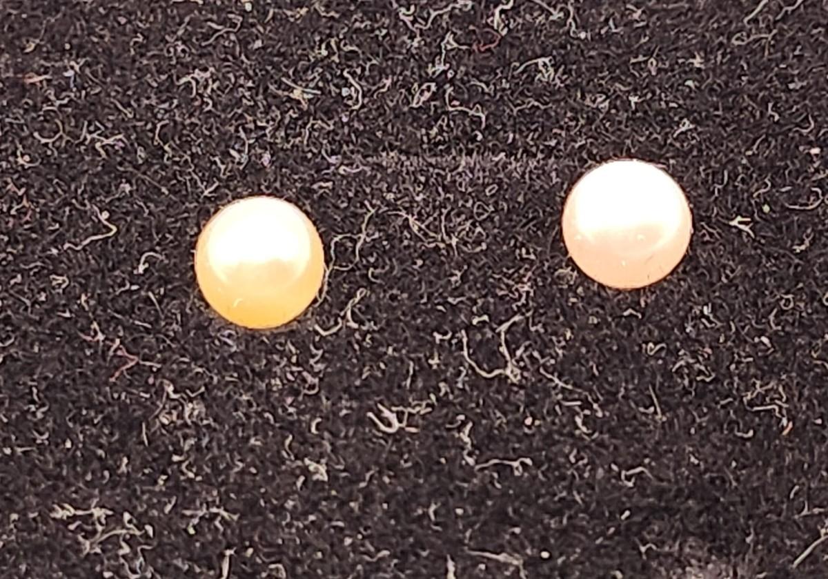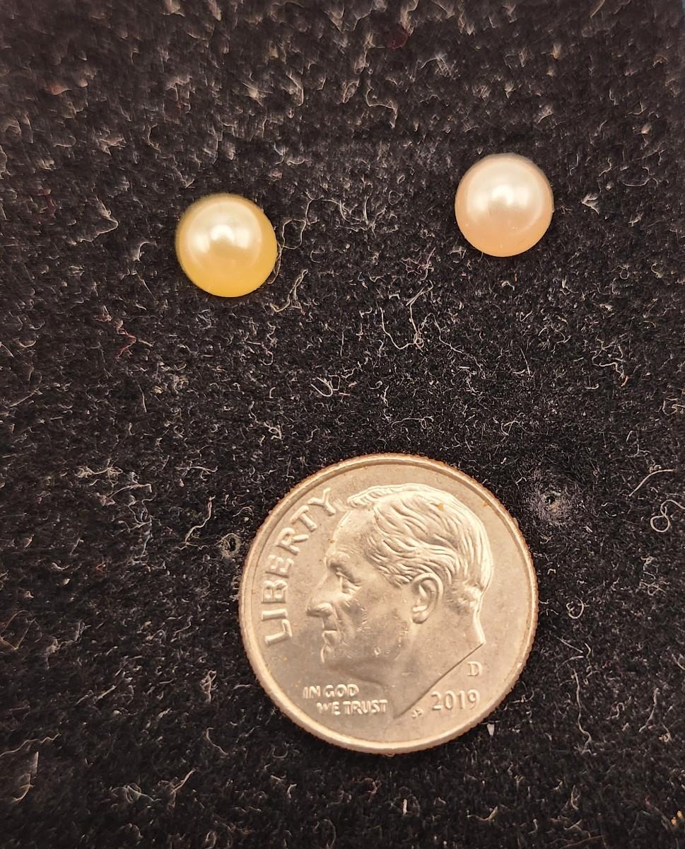 These beauties are well matched with good luster, ~ 6 mm diameter. Cream color.