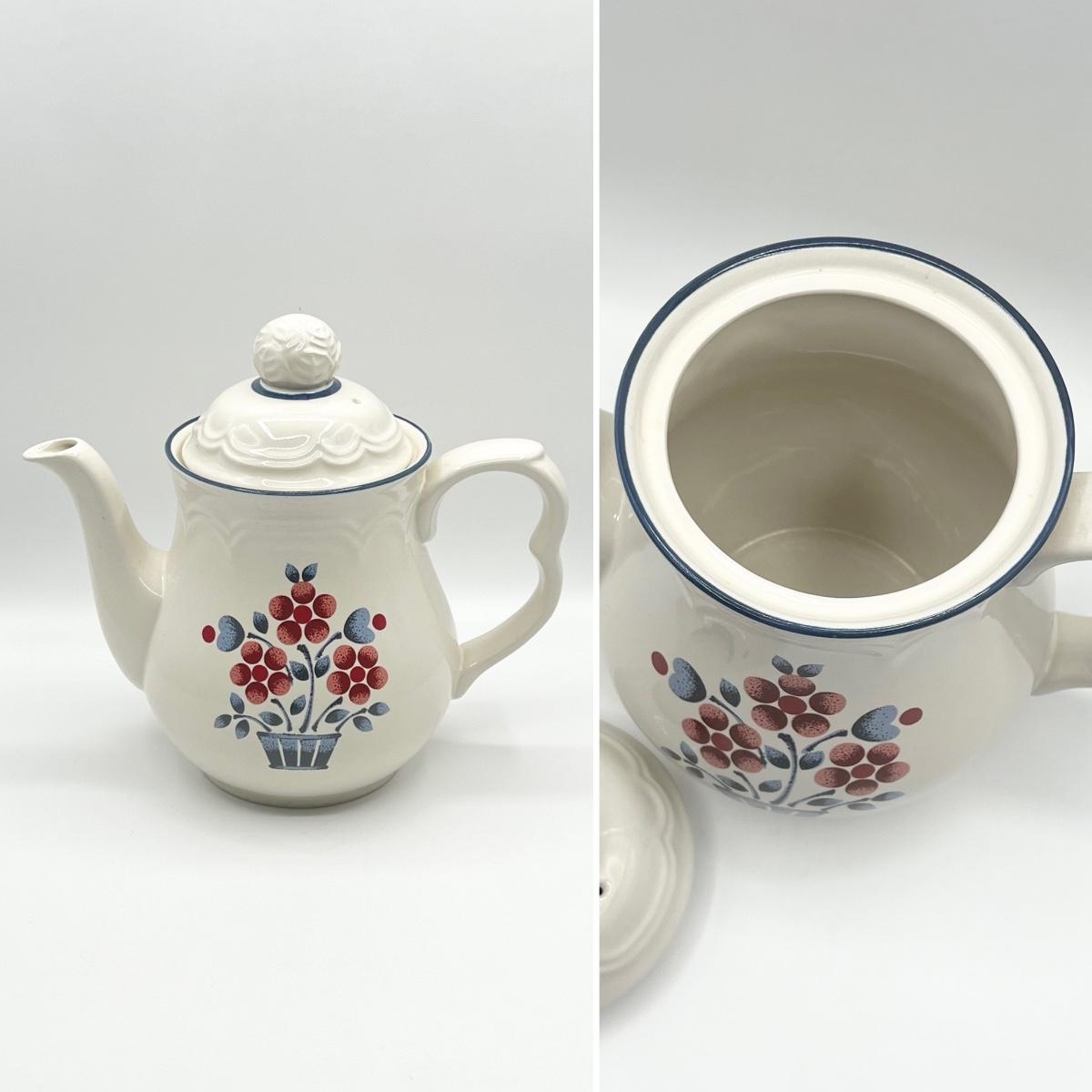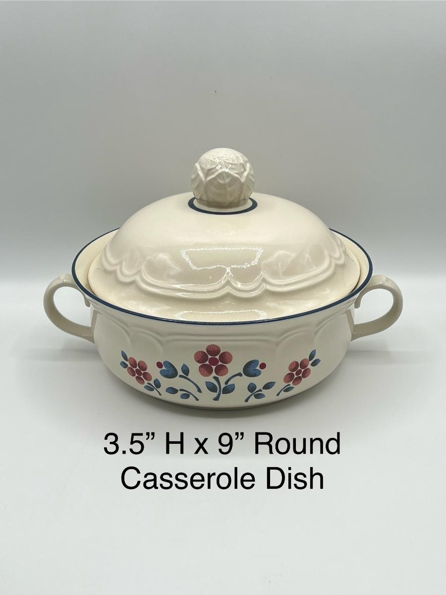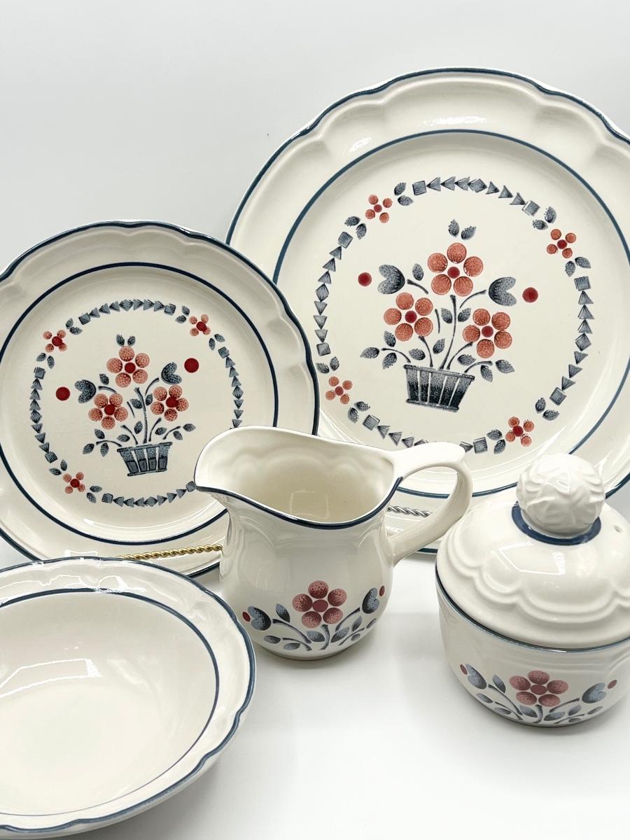 Set includes 6 dinner plates, 6 salad plates, 6 bowls, 1 lidded casserole dish, 1 tea/coffee pot, 1 serving platter, & 1 serving bowl, sugar and creamer