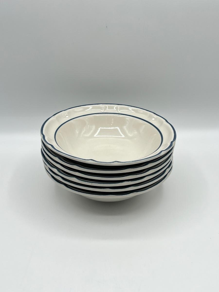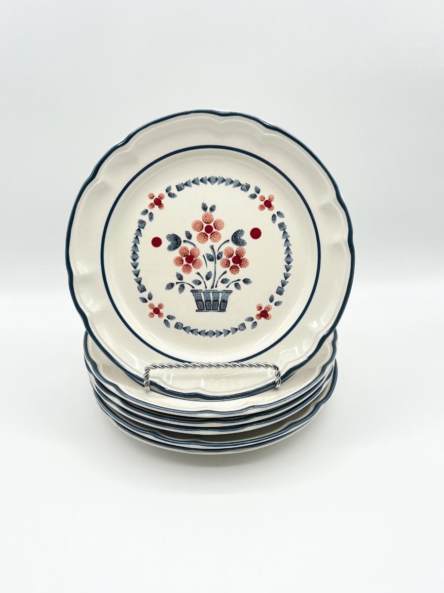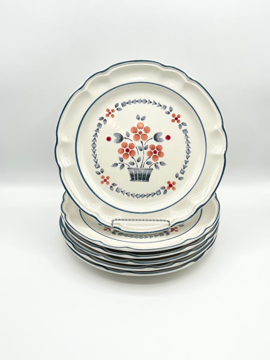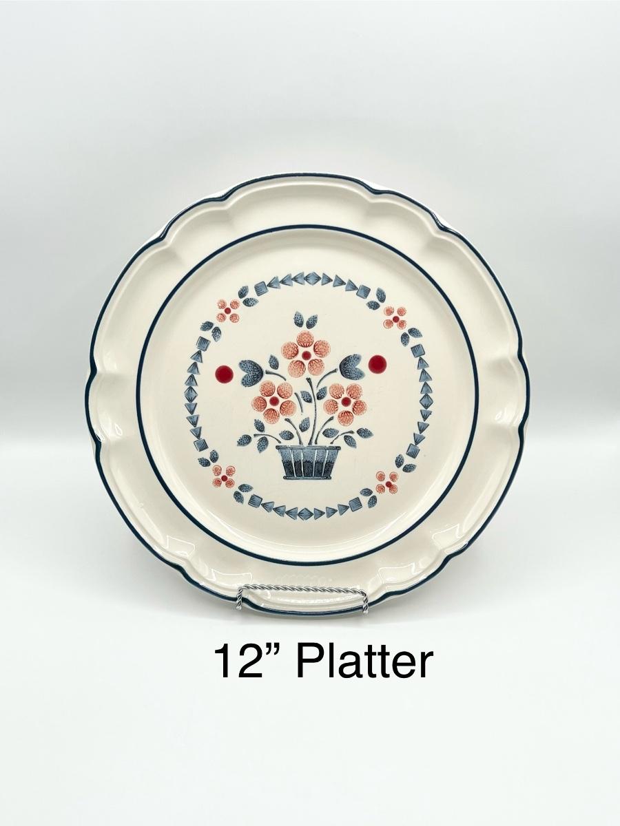 Set includes 6 dinner plates, 6 salad plates, 6 bowls, 1 lidded casserole dish, 1 tea/coffee pot, 1 serving platter, & 1 serving bowl, sugar and creamer