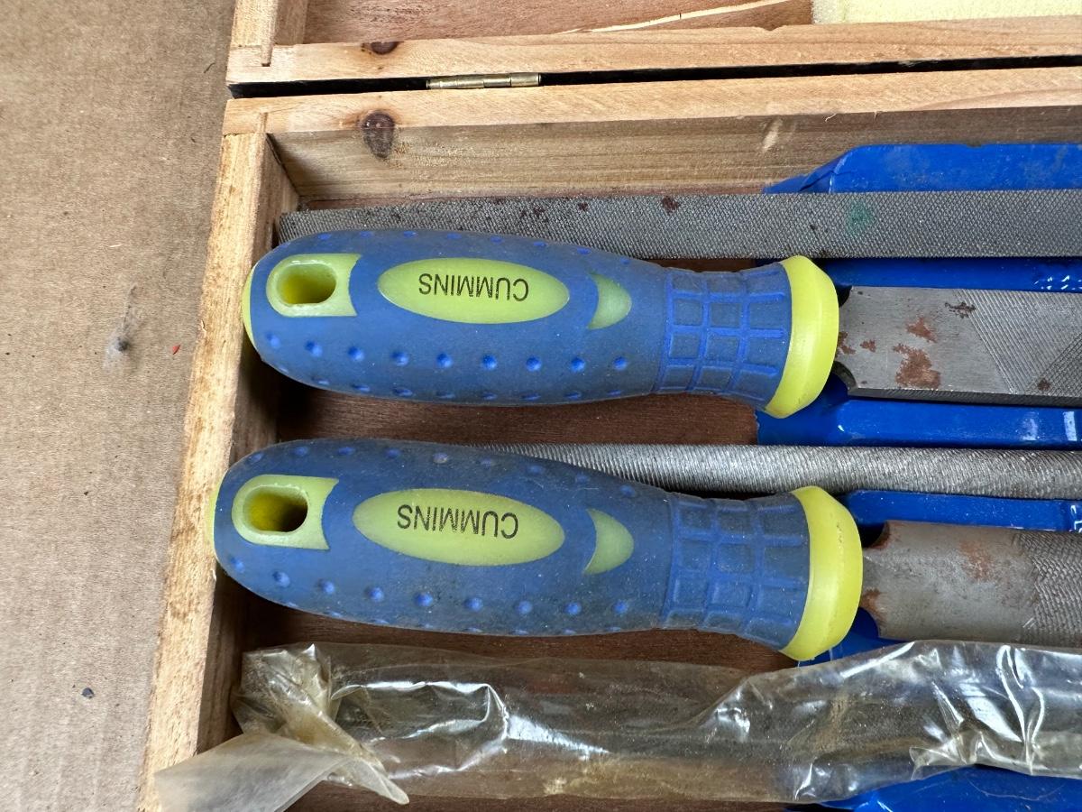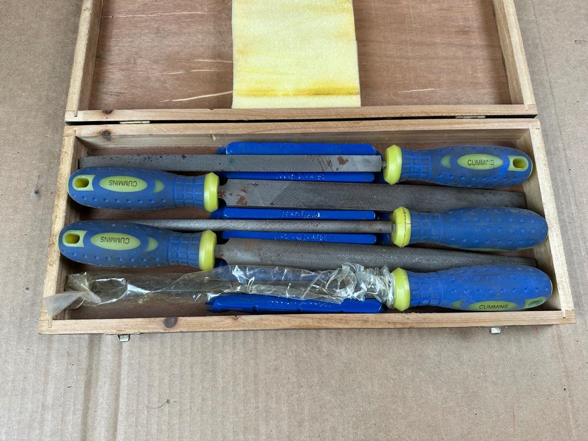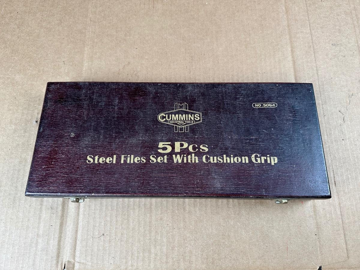 Complete 5-piece Cummins steel file set featuring ergonomic cushion-grip handles and a fitted wooden storage case. Set includes a variety of file profiles suitable for metalworking, sharpening, deburring, and general shop use.