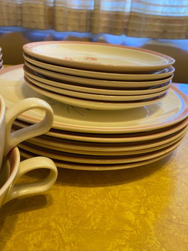 Vintage Cunningham & Pickett Dish Set in Dixie Rose. Hand decorated design. Almost a complete set for 6, missing two tea cups and a saucer. Good Condition.