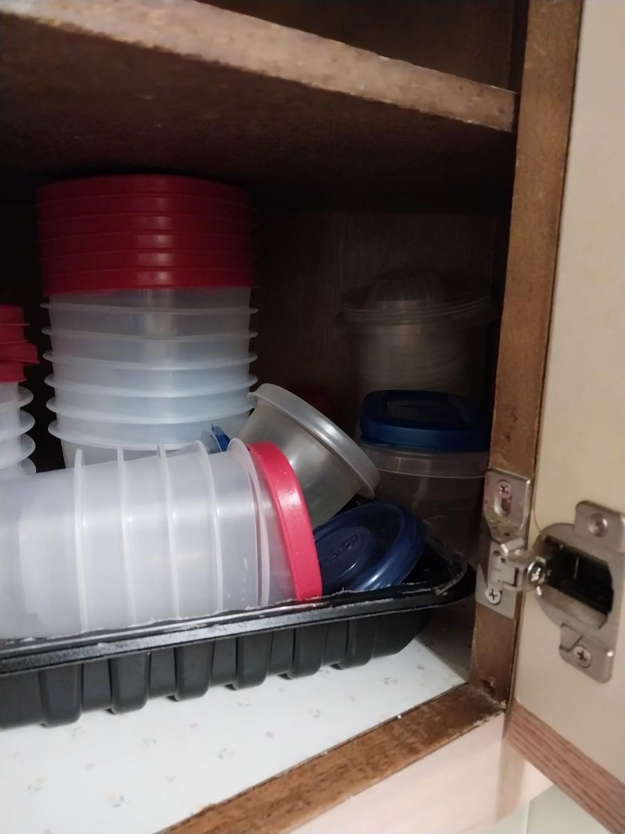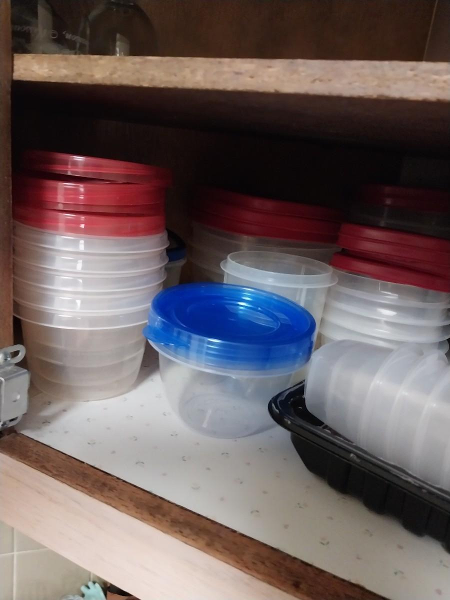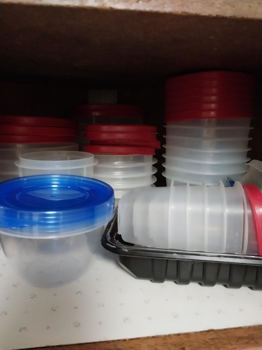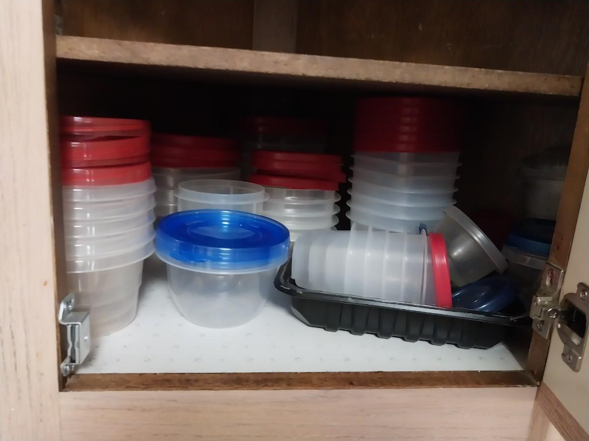 CUPBOARD FULL OF MOSTLY SINGLE SERVE FOOD STORAGE CONTAINERS