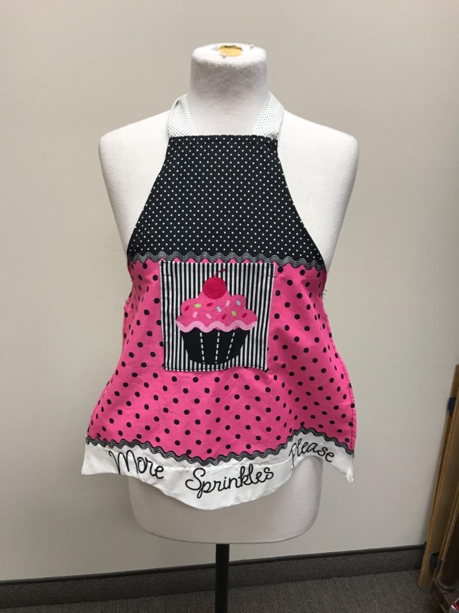 Bottom of the apron reads “More Sprinkles Please.” The apron is very small. Item doesn’t come with tags. It is in great condition.