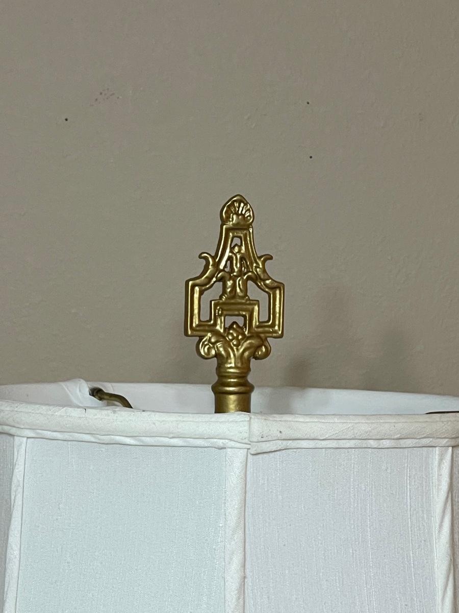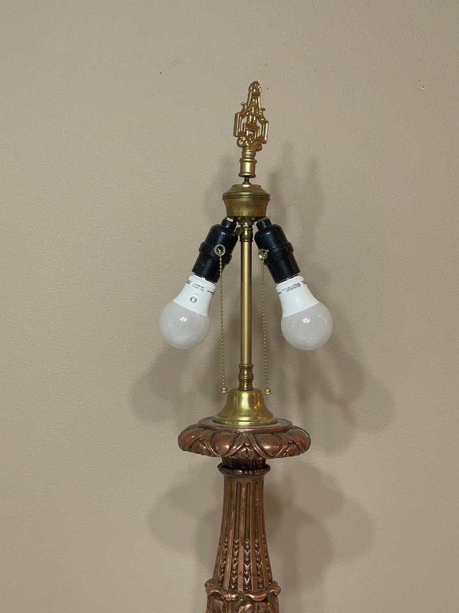 Appears to be made of a Resin type material. It is heavy and will need a new shade as the one on it has some wear. 39” H x had a 15” round shade.