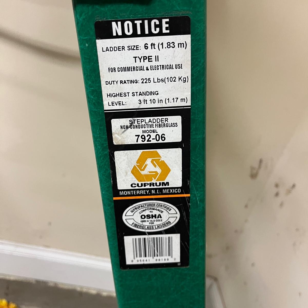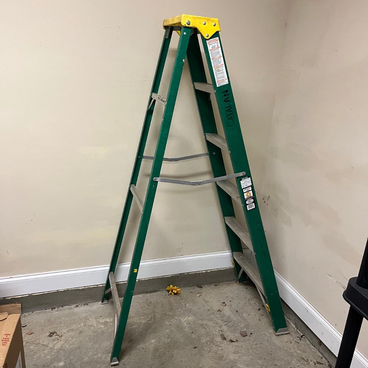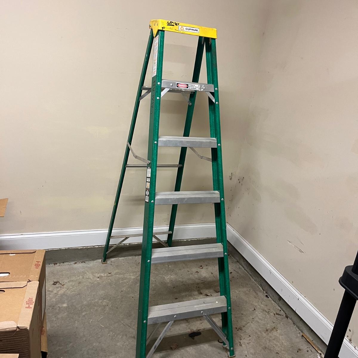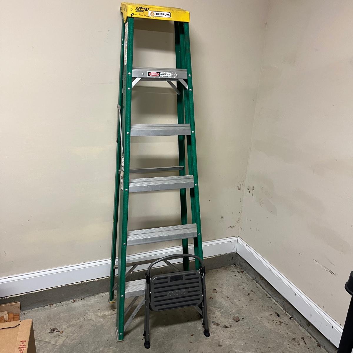 Lot includes a Cuprum six foot fiberglass stepladder and a Cosco footstool.
